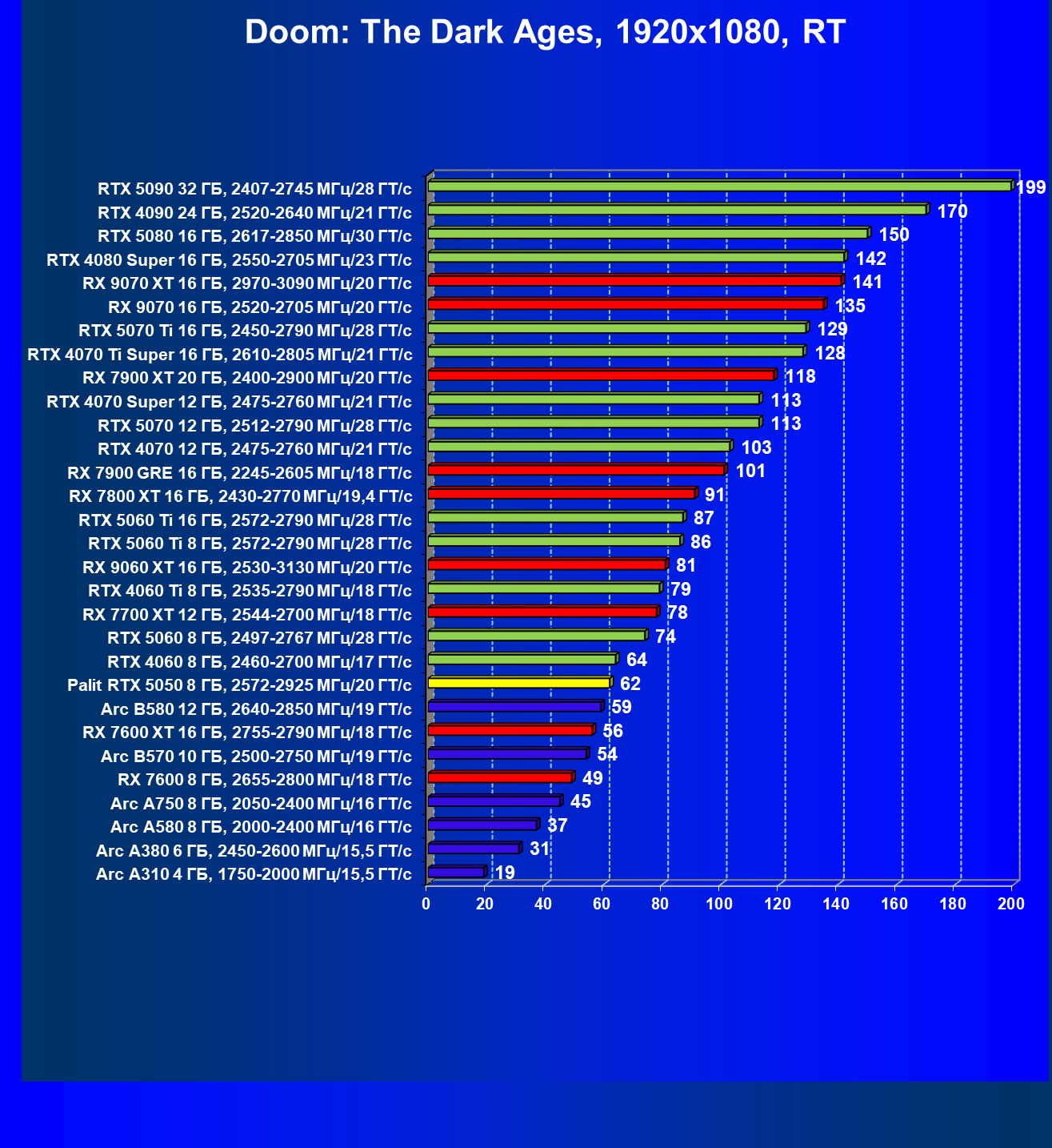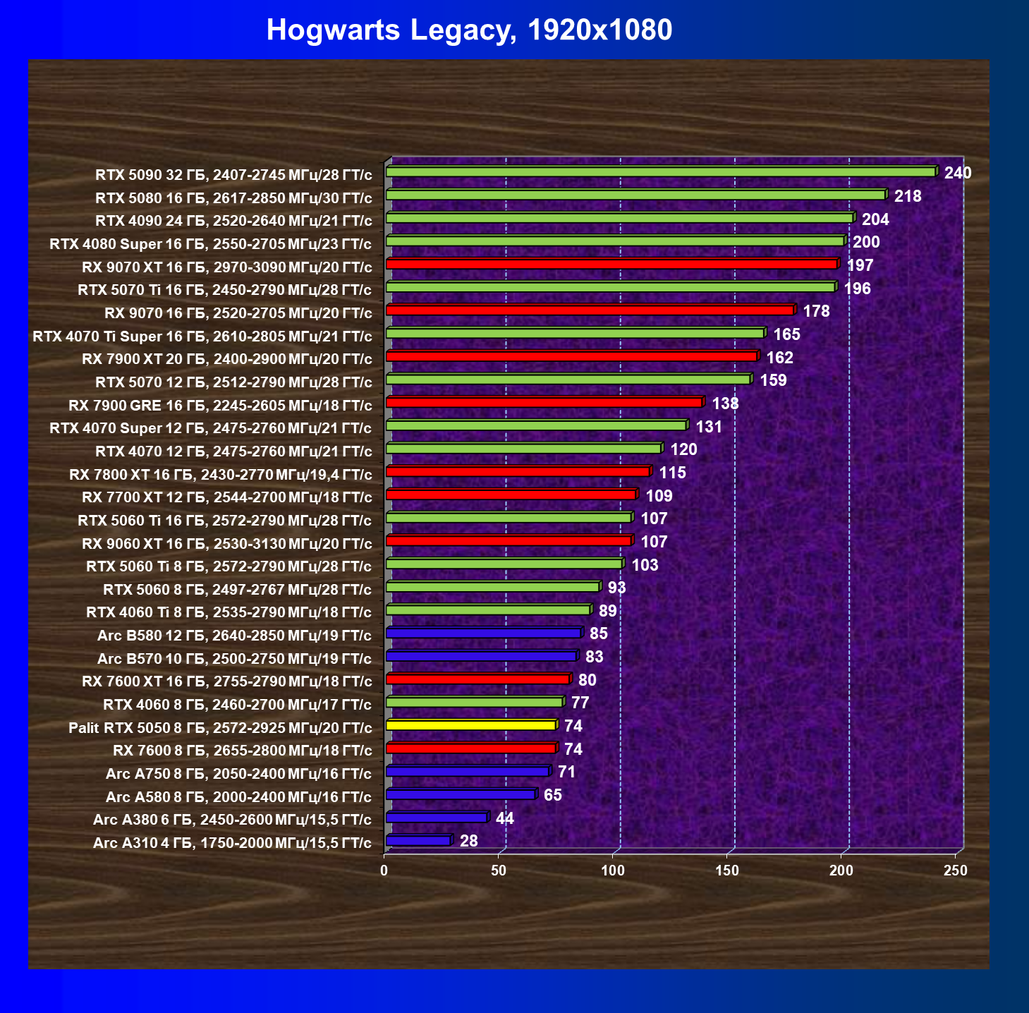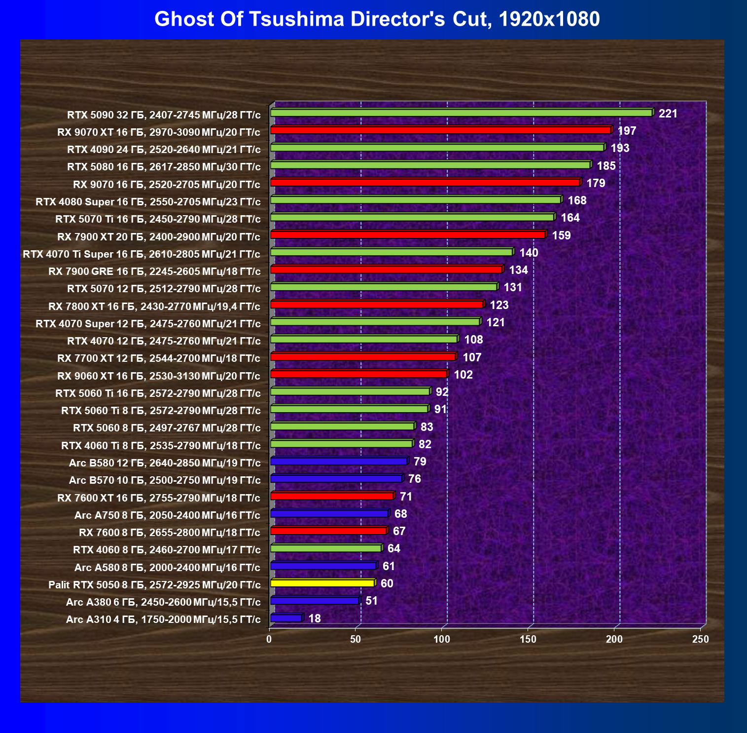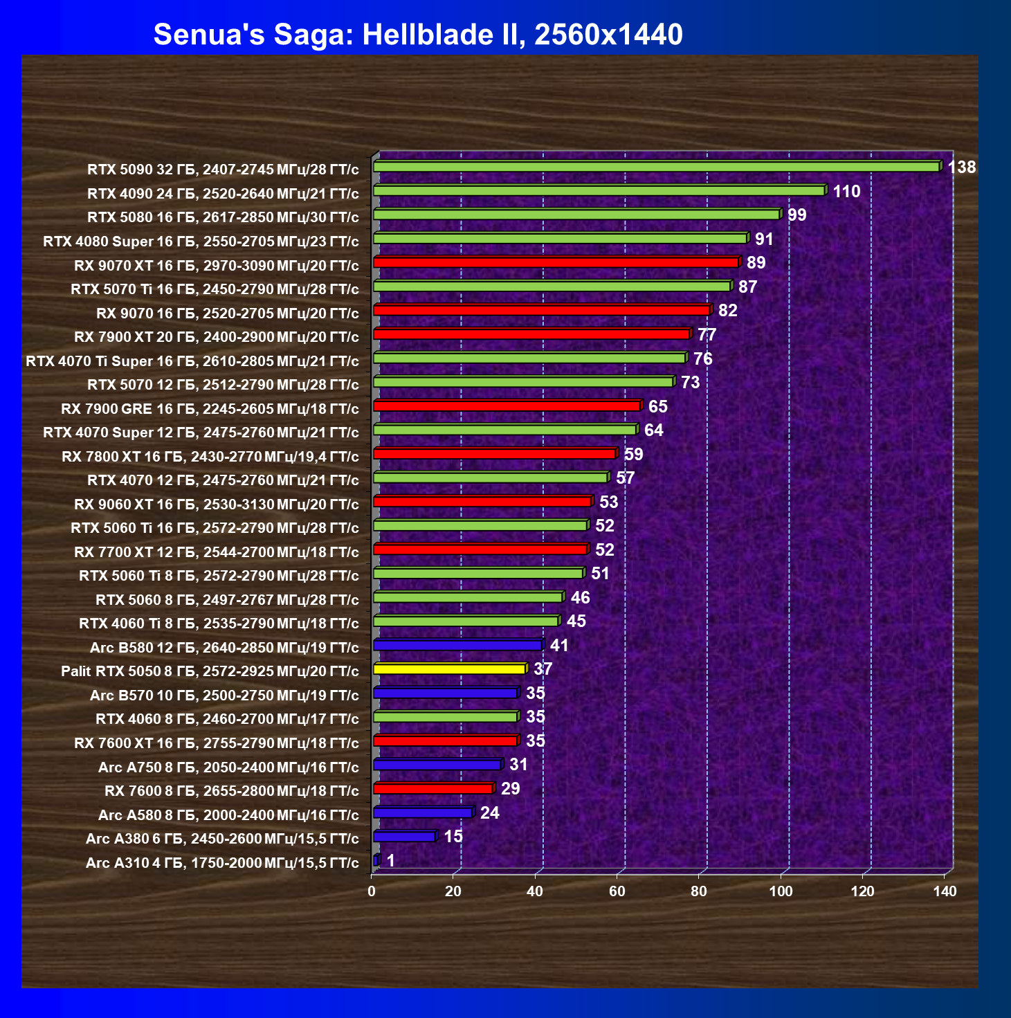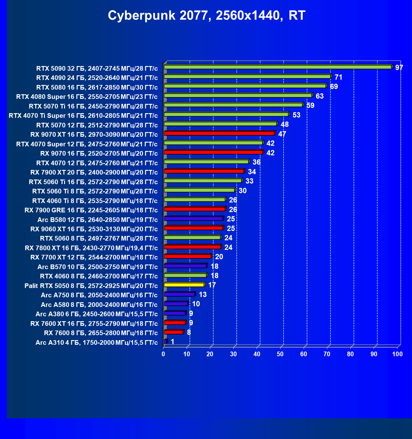 | 10 | Palit RTX 5050 8 ГБ, 2572—2925 МГц/20 ГТ/с | 149 | 447 | 30 000 |