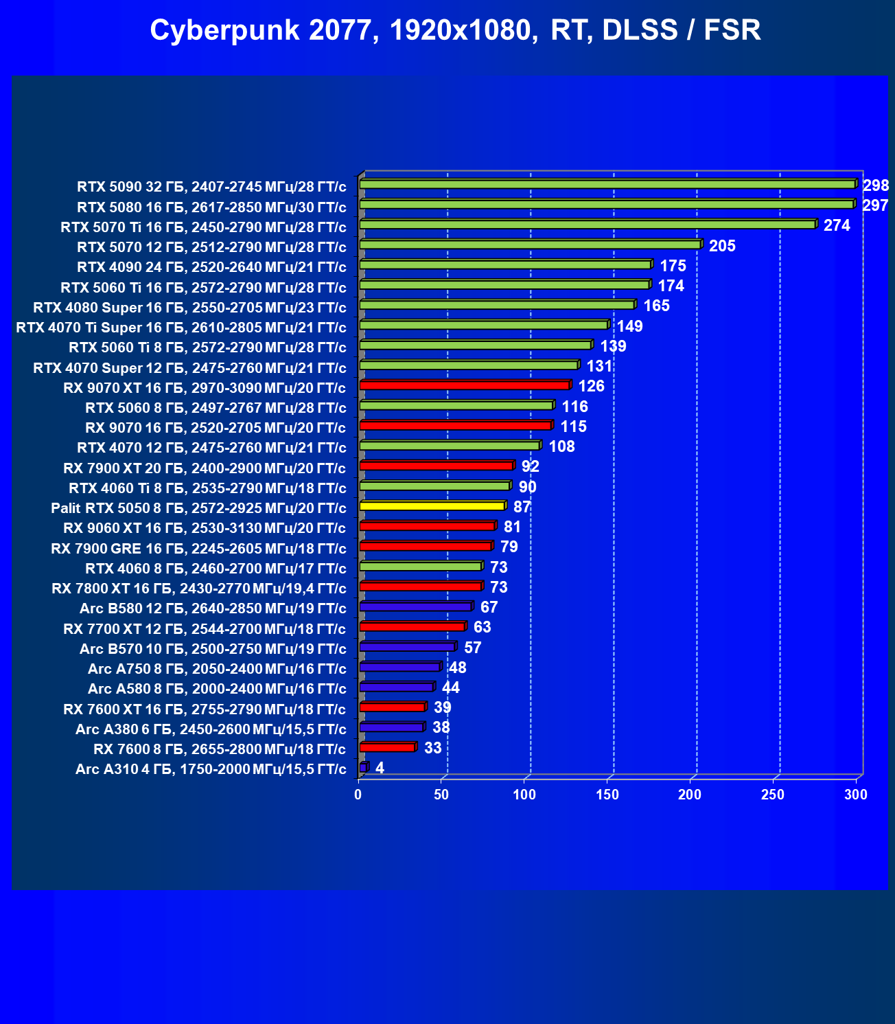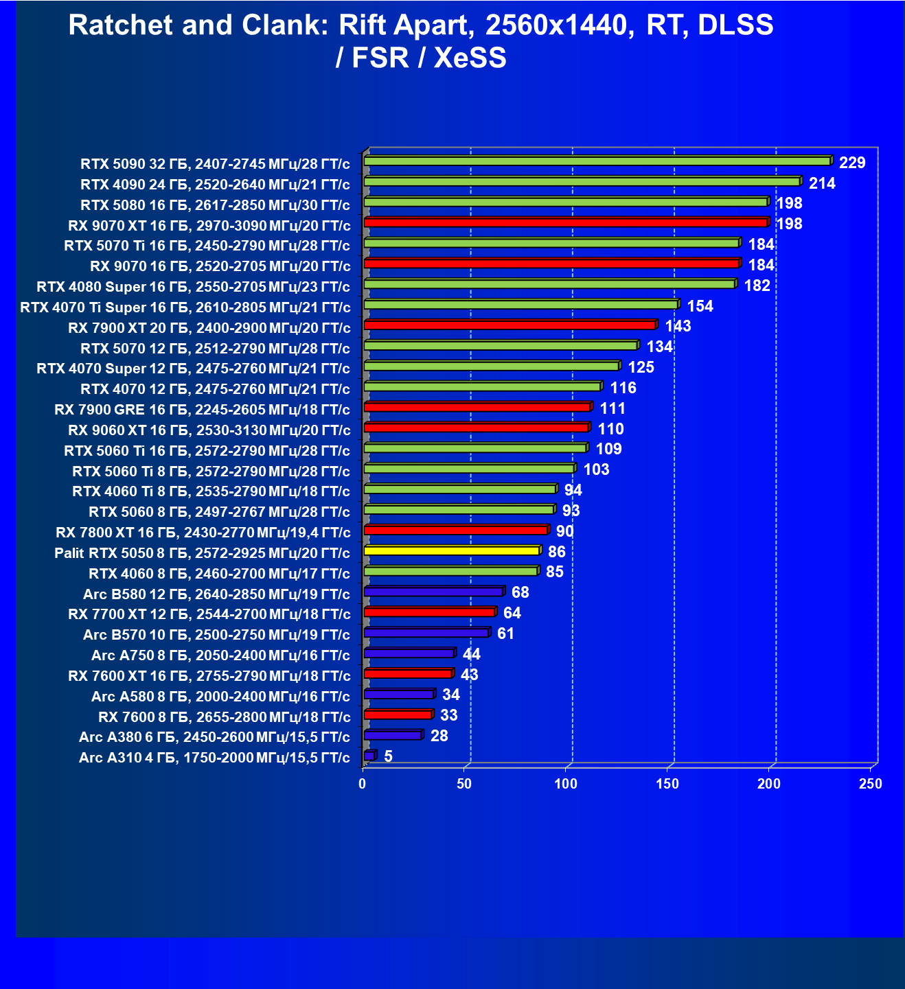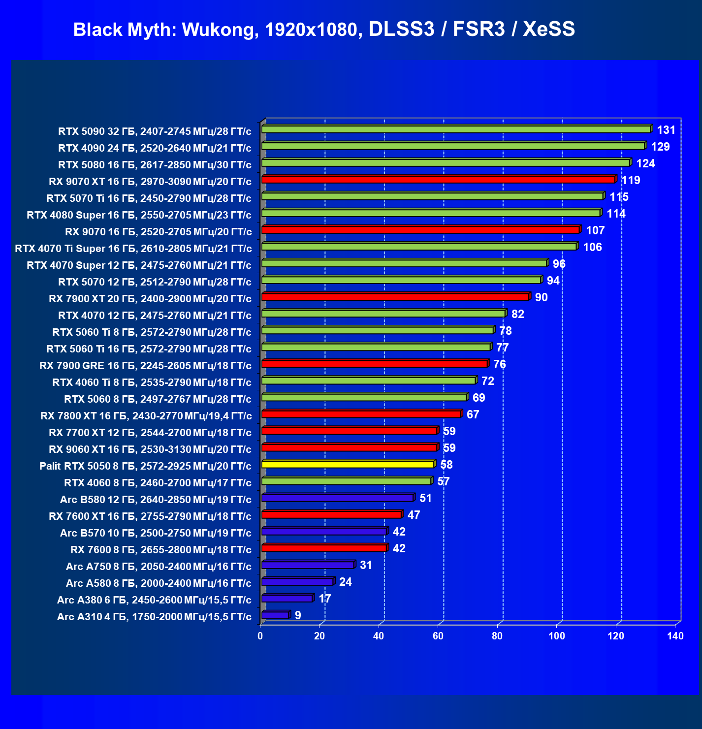 Как только мы переключились на игры с RT и сопутствующими технологиями динамического масштабирования, картина резко меняется. Выше мы уже отмечали важность применения DLSS/FSR/XeSS совместно с RT даже для таких бюджетных карт, как GeForce RTX 5050.