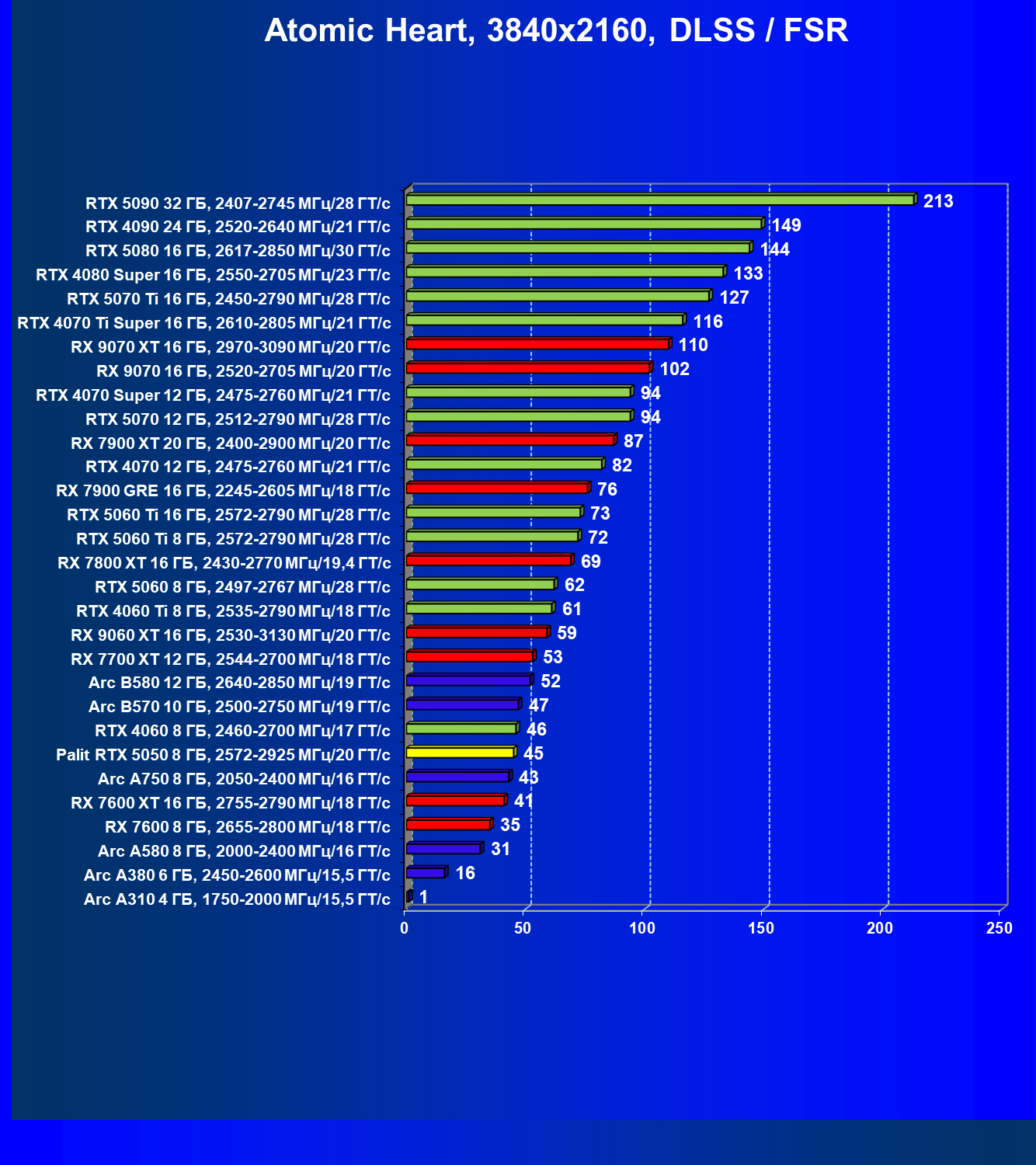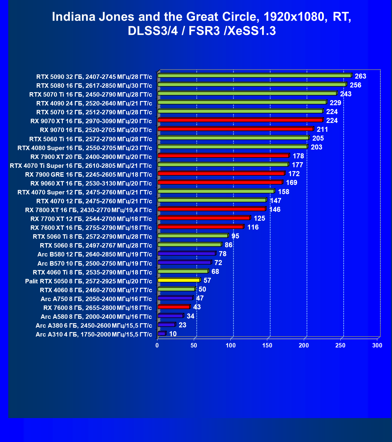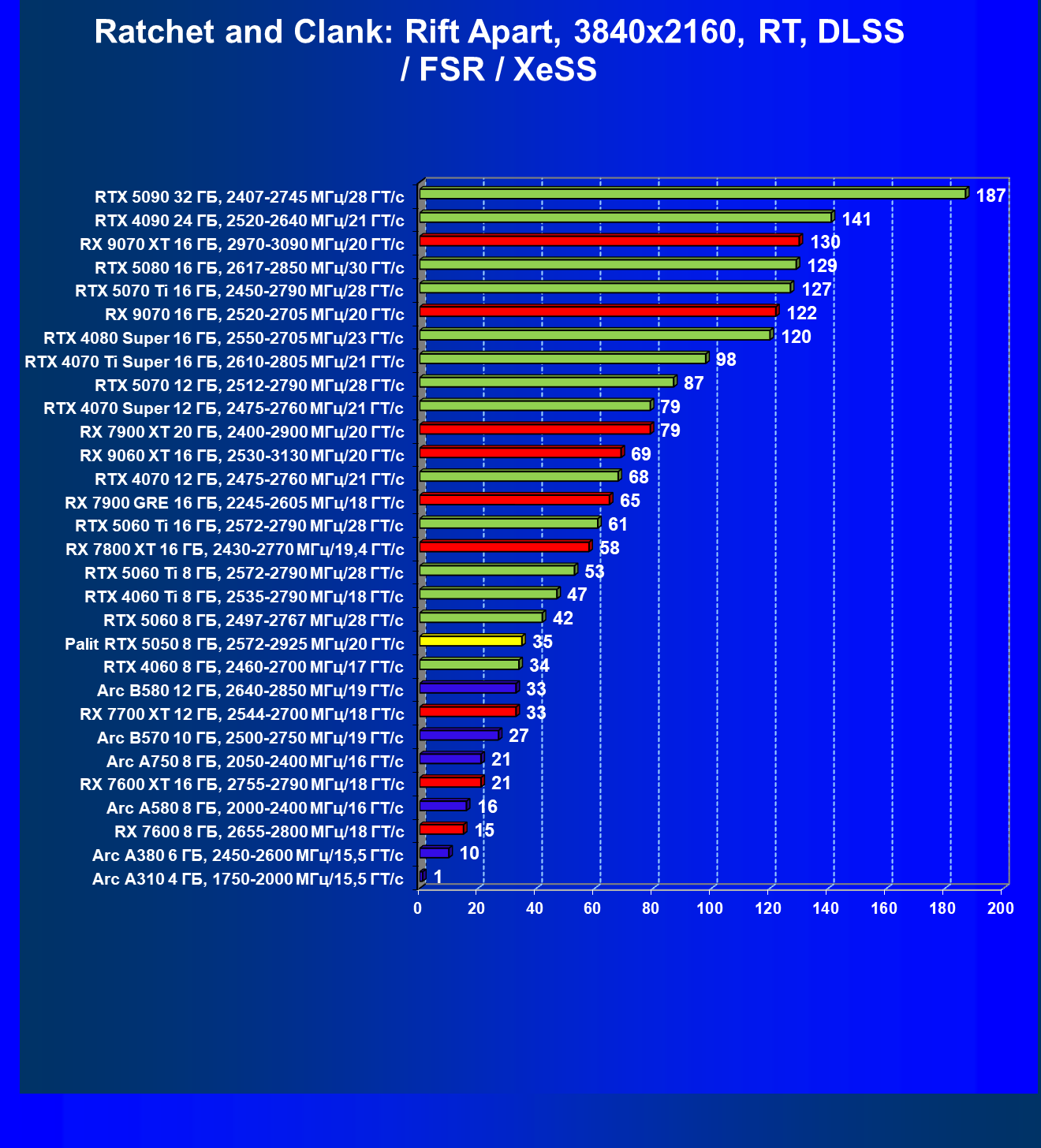 Как только мы переключились на игры с RT и сопутствующими технологиями динамического масштабирования, картина резко меняется. Выше мы уже отмечали важность применения DLSS/FSR/XeSS совместно с RT даже для таких бюджетных карт, как GeForce RTX 5050.
