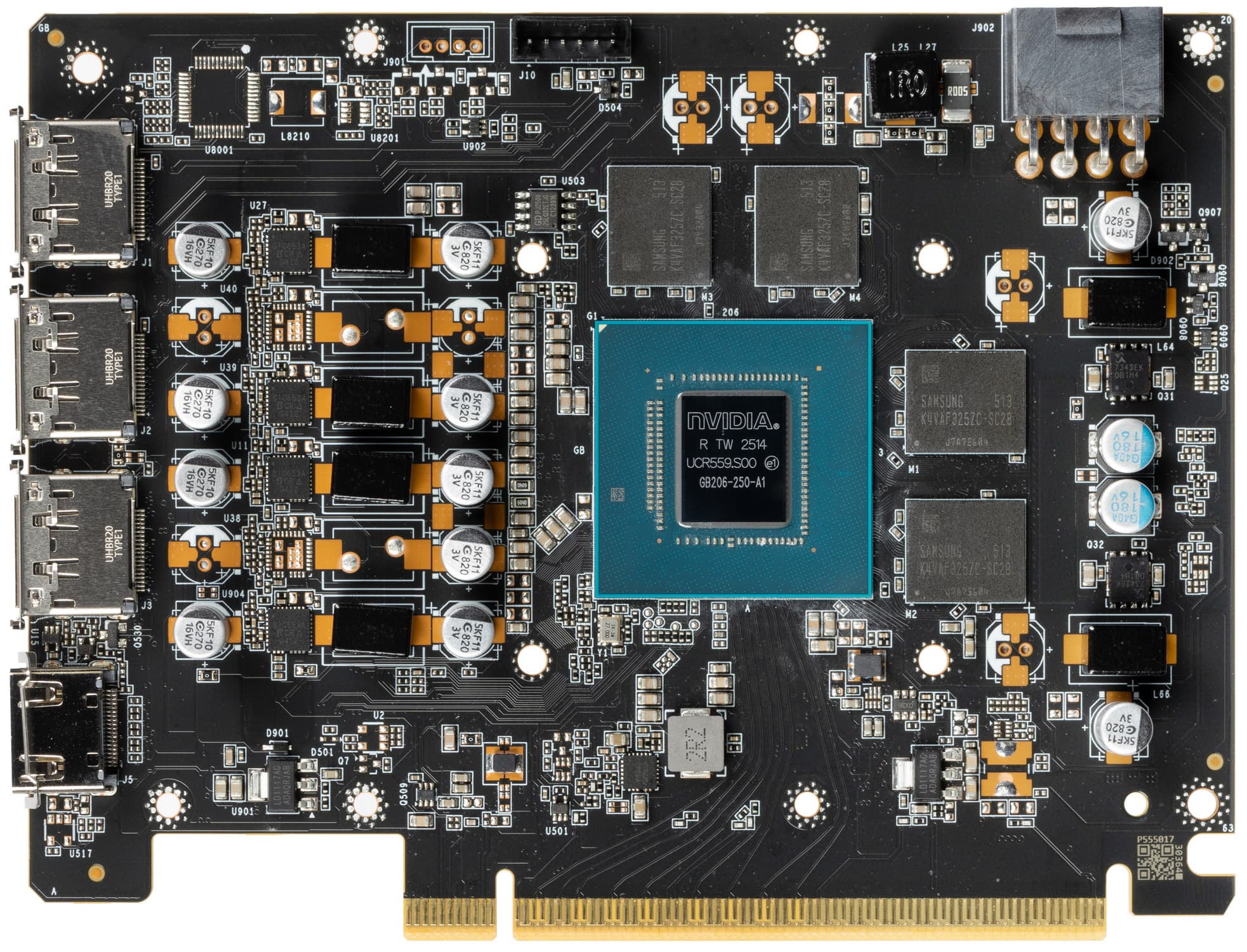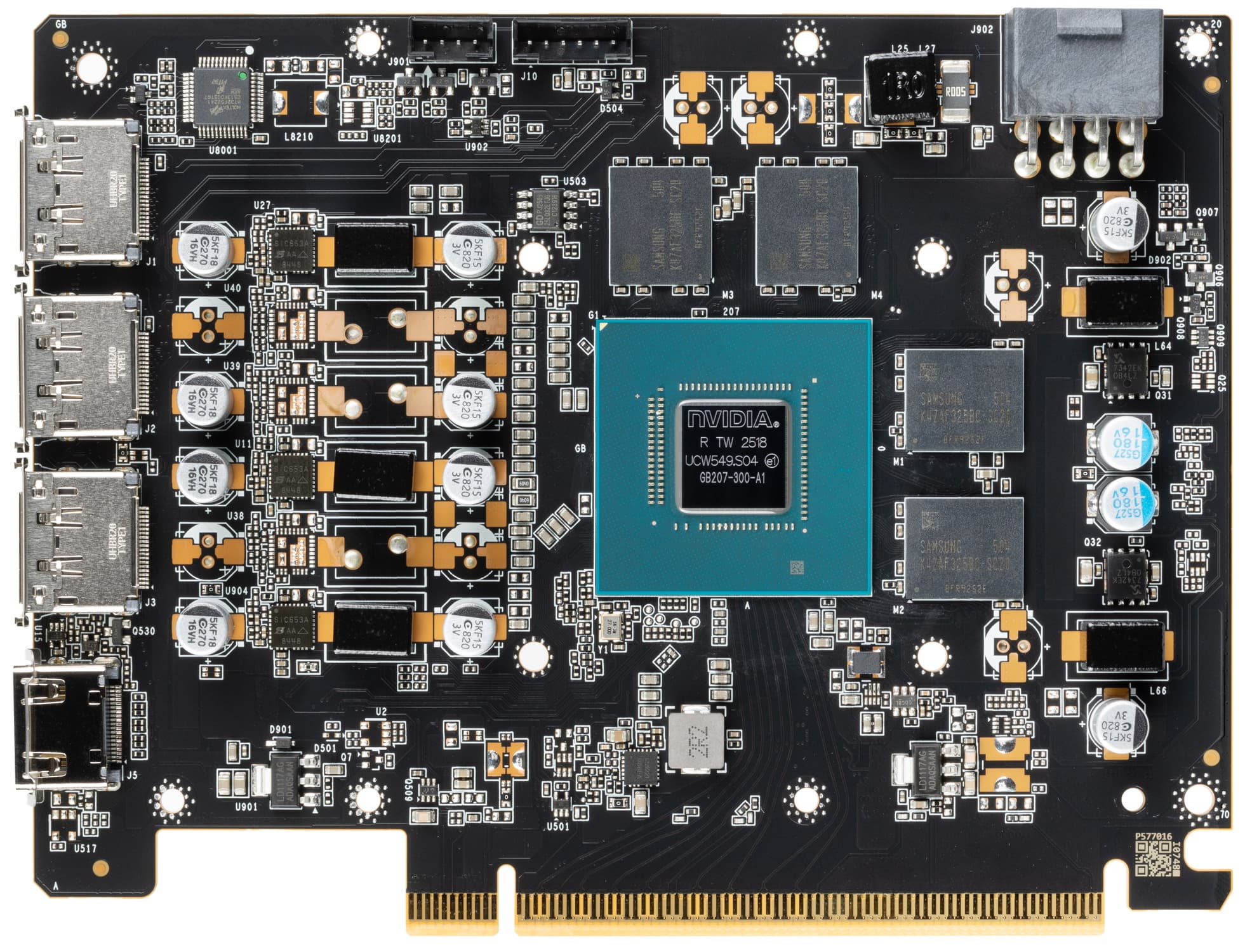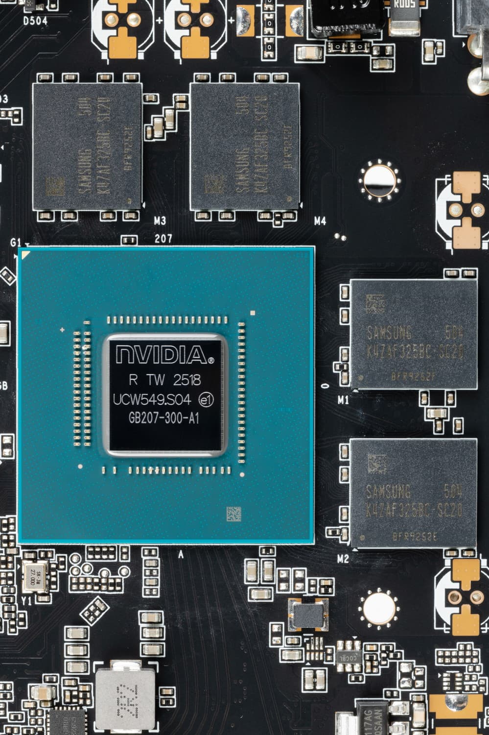 Младшая модель архитектуры Blackwell основана на графическом процессоре GB207 в модификации GB207-300-A1. Это чип сравнительно небольшого размера с площадью в 149 мм², содержащий 16,9 млрд. транзисторов, который производится при помощи техпроцесса TSMC 4N — второго специализированного варианта 5-нанометрового EUV-техпроцесса, разработанного тайваньской компанией для Nvidia, который не слишком отличается от предыдущего и не дает особых преимуществ GPU нового семейства перед предыдущим. GB207 — это самый компактный чип семейства, использующий тот же техпроцесс TSMC, что и решения Ada Lovelace предыдущей серии RTX 40, и по размеру он меньше, чем AD107, используемый в RTX 4060 — решении более высокого ценового уровня.