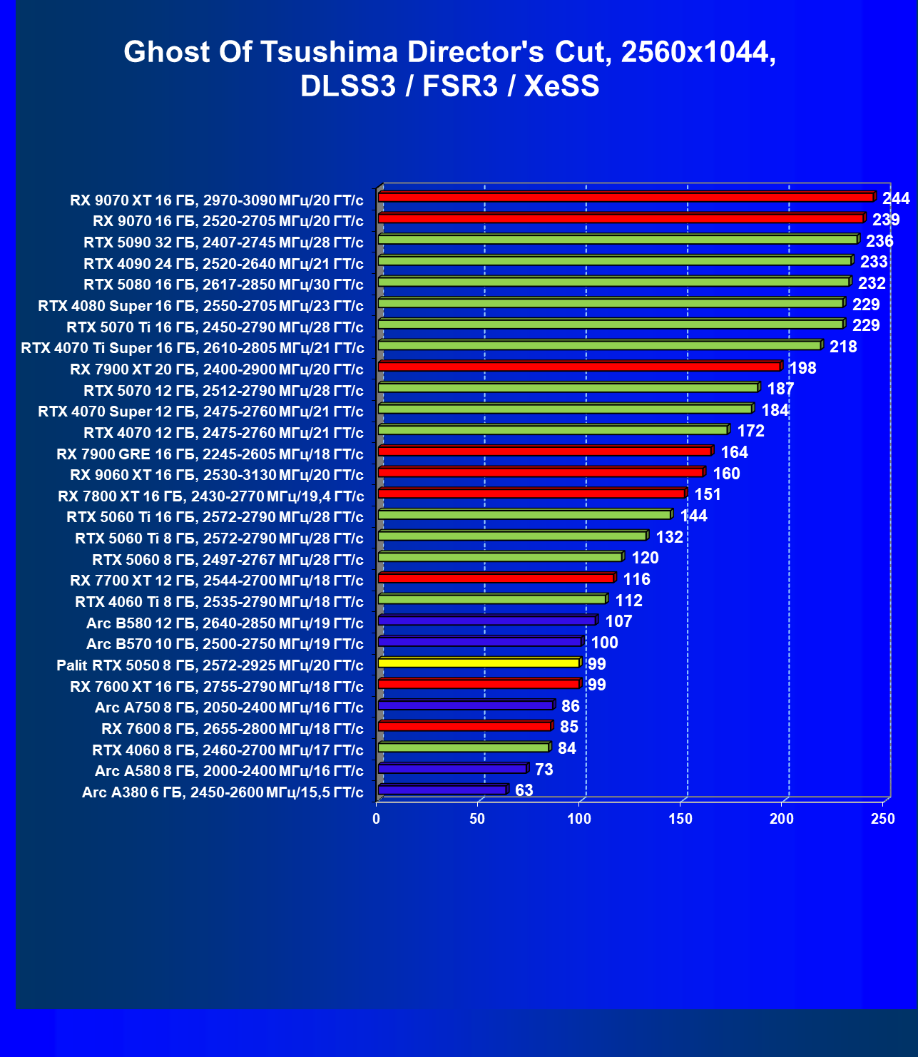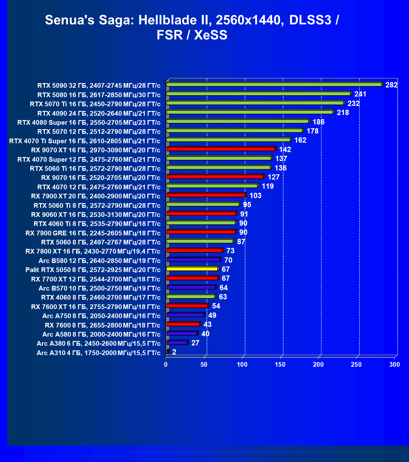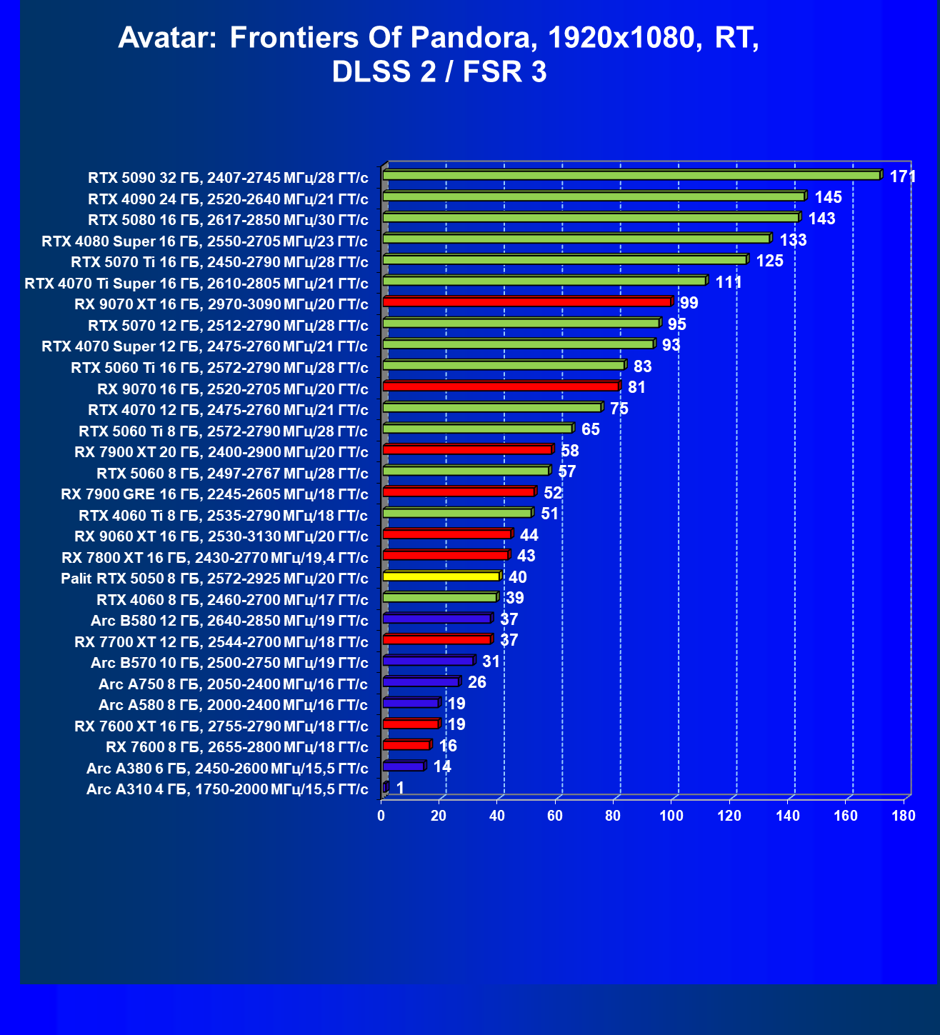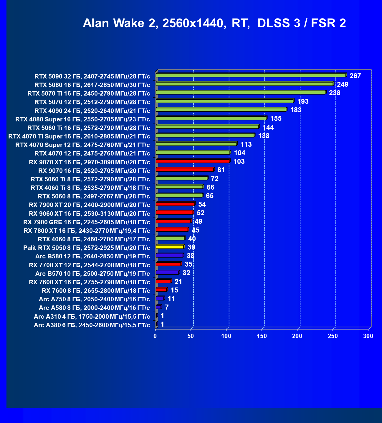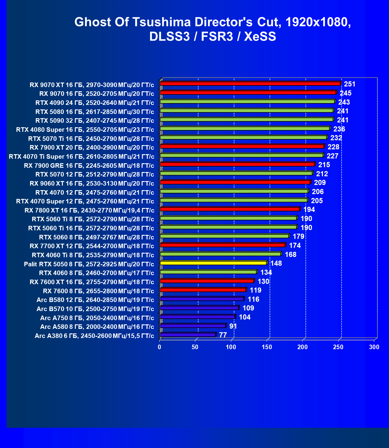 GeForce RTX 5050 уверенно занял первое место в своей группе (обойдя даже намного более дорогой Radeon RX 7700 XT), что объясняется поддержкой DLSS 4 с многокадровой генерацией (multiframe generation, MFG) в 5 из 10 тестовых игр. Эта технология позволяет картам поколения GeForce RTX 50 сильно, иногда в разы опережать предшественников по производительности. При этом можем повторить, что никаких серьезных проблем из-за применения MFG в таких играх мы не обнаружили, но только в разрешении 1080p.