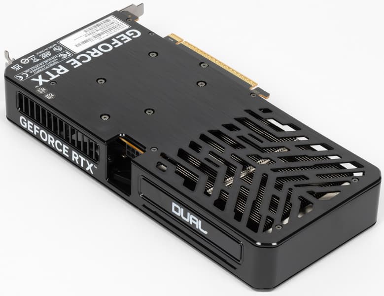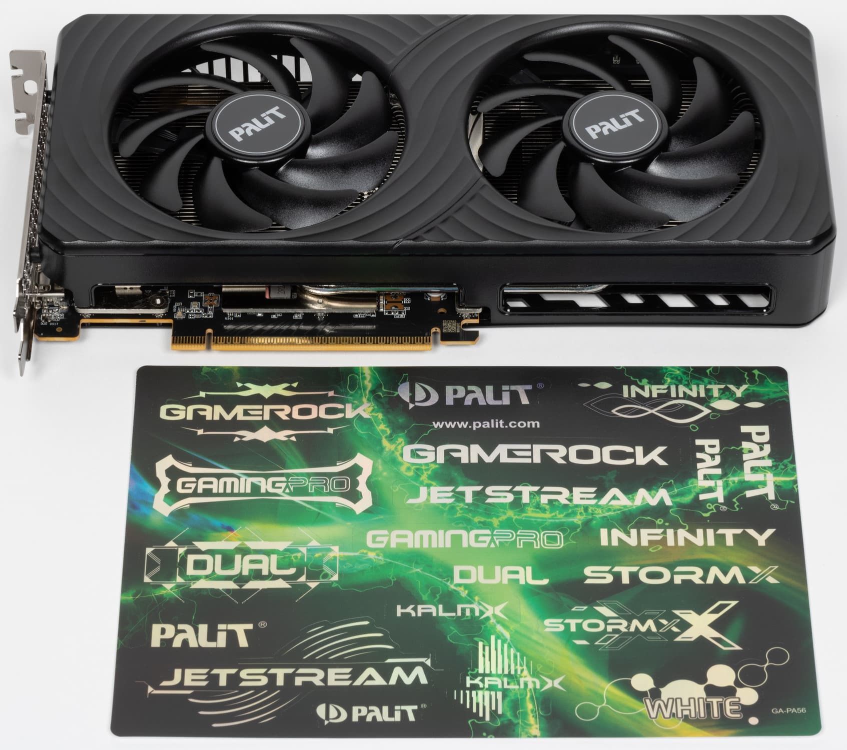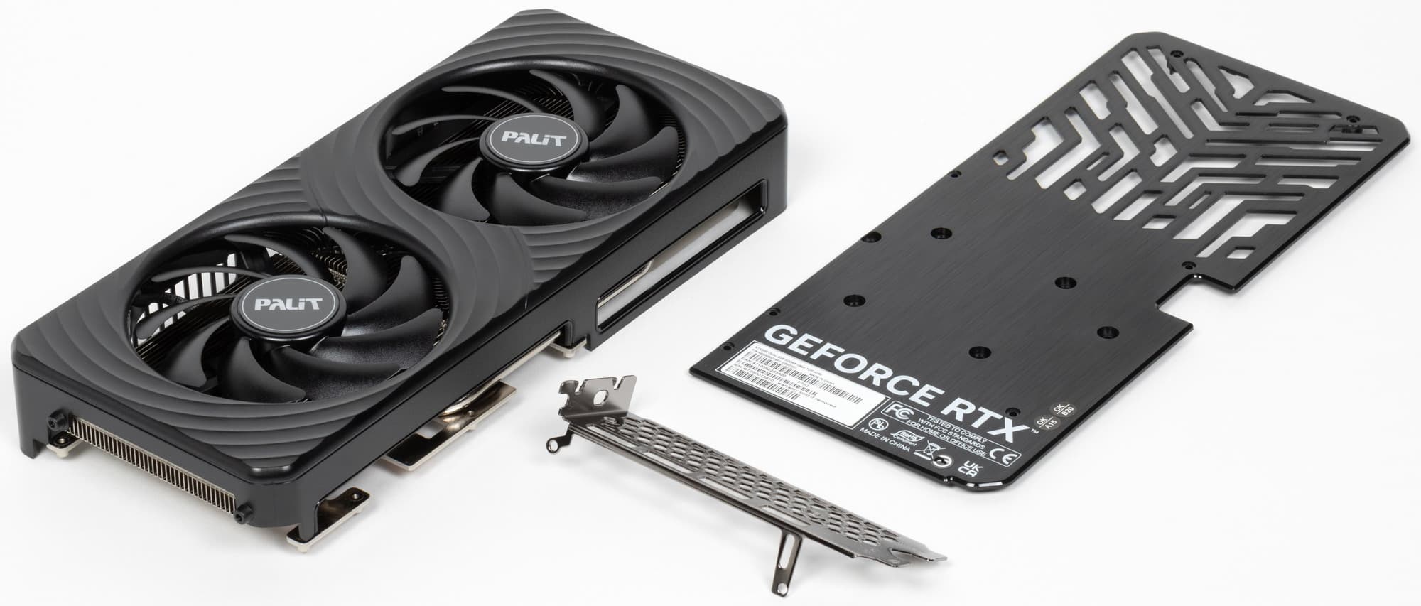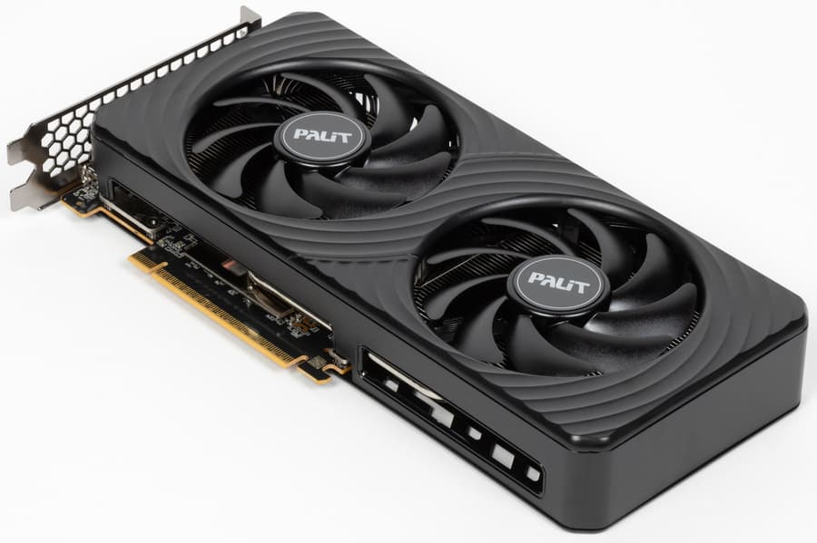 Конкретная протестированная карта Palit GeForce RTX 5050 Dual (8 ГБ) имеет сравнительно компактные размеры 26×13 см, занимая 2 слота в системном блоке. Использованный кулер не слишком шумный, при этом карта может потреблять до 131 Вт и имеет один 8-контактный разъем питания (PCIe 2.0). У карты 4 видеовыхода: 1 HDMI 2.1b и 3 DisplayPort 2.1b — последний обеспечивает пропускную способность до 80 Гбит/с в режиме передачи UHBR 20 и позволяет подключить 8K-дисплей с частотой обновления 60 Гц по одному кабелю.