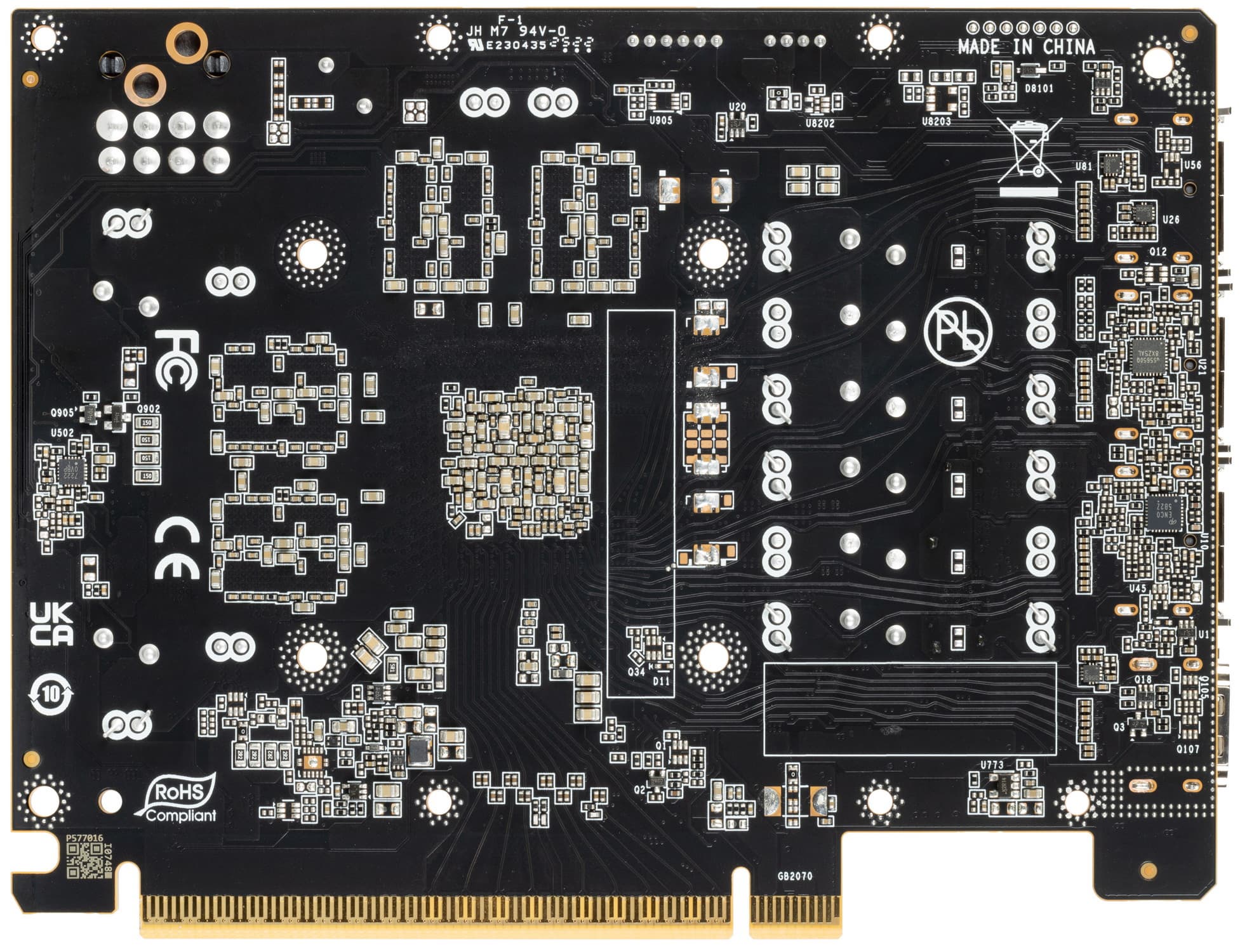 В случае GeForce RTX 5050 компания также решила обойтись без Founders Edition собственного производства, но самые дешевые видеокарты партнеров компании близки к этому — они сочетают короткую печатную плату и двухслотовую систему охлаждения с двумя вентиляторами. Плата питается по шине PCIe и дополнительному 8-контактному разъему, максимальное потребление энергии составляет 130 Вт, так что это неплохой выбор для игровых систем начального уровня с блоками питания мощностью от 550 Вт. Энергопотребление у новинки невысокое, а вот энергоэффективность ее ниже, чем у других видеокарт семейства Blackwell. Но при потреблении в 130 Вт это не особо важно, любые более-менее современные блоки с этой видеокартой справятся, да и с охлаждением проблем быть не должно. Что касается портов видеовывода, то предлагается вполне стандартный ассортимент для серии RTX 50, включающий один разъем HDMI 2.1b и три DisplayPort 2.1b.