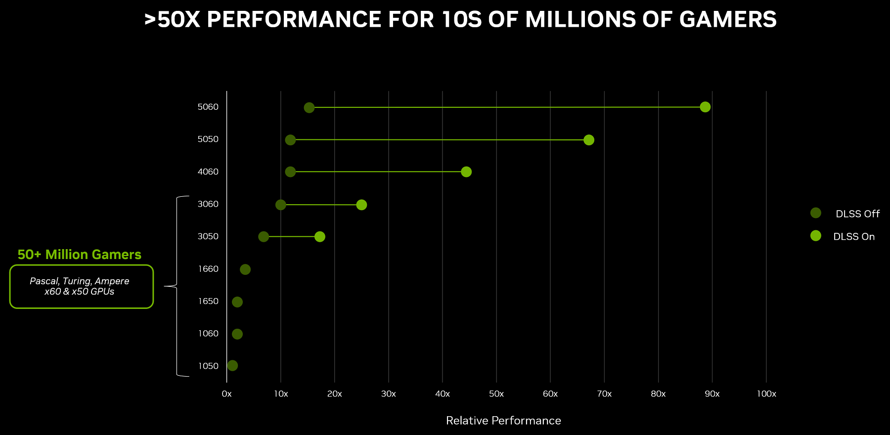 Напомним, что у Nvidia имеется фирменное приложение Nvidia App, позволяющее ускорителям поколения GeForce RTX 50 принудительно включать MFG в играх, поддерживающих старую технологию генерации промежуточных кадров (DLSS 3), а таких игр уже много. То есть список игр, в которых карты GeForce RTX 50 могут получить колоссальный прирост производительности, уже очень велик.