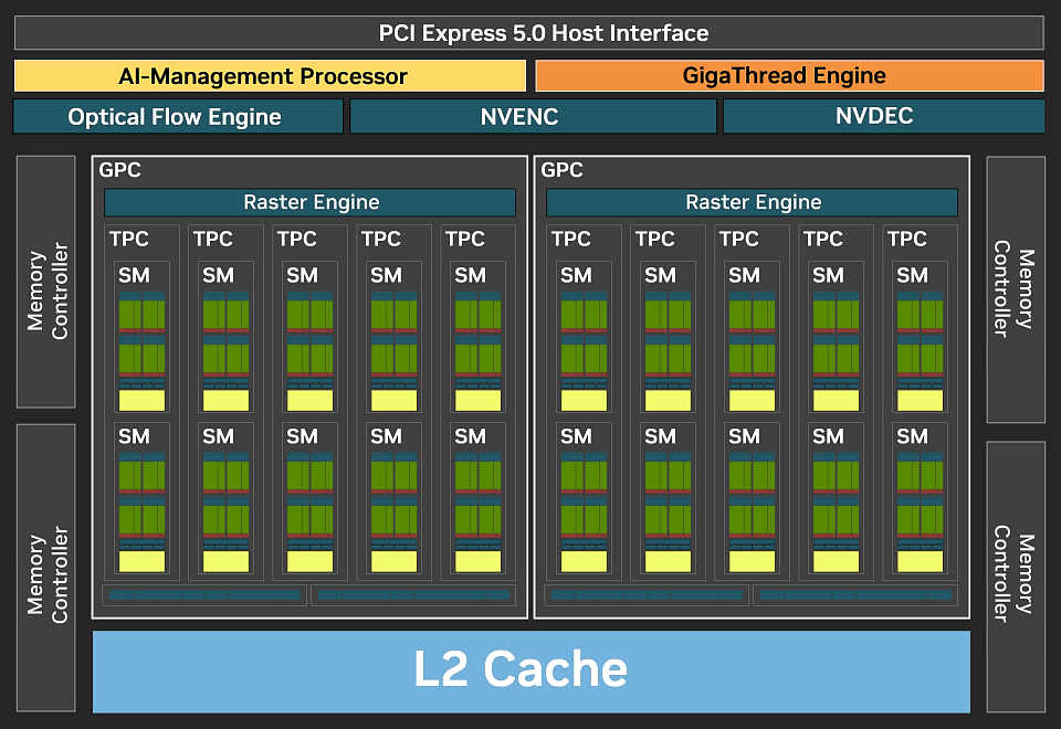 Высокоуровневое строение графических процессоров компании Nvidia не меняется с Ampere. Как и все графические процессоры компании, GB207 состоит из укрупненных кластеров Graphics Processing Cluster (GPC), которые включают несколько кластеров текстурной обработки Texture Processing Cluster (TPC), содержащих потоковые процессоры Streaming Multiprocessor (SM), блоки растеризации ROP и контроллеры памяти. Кластер GPC самостоятельно производит основные вычисления внутри кластера, и включает свой движок растеризации Raster Engine, несколько кластеров TPC, состоящих из вдвое большего количества мультипроцессоров SM. Рассмотрим блок-схему графического процессора в озвученной компанией конфигурации, и так как Nvidia не предоставляет публике диаграммы своих чипов, кроме топового, нам пришлось перерисовывать имеющуюся схему GB202, убрав всё лишнее и переформатировав ее — соответственно, в ней могут быть некоторые неточности.