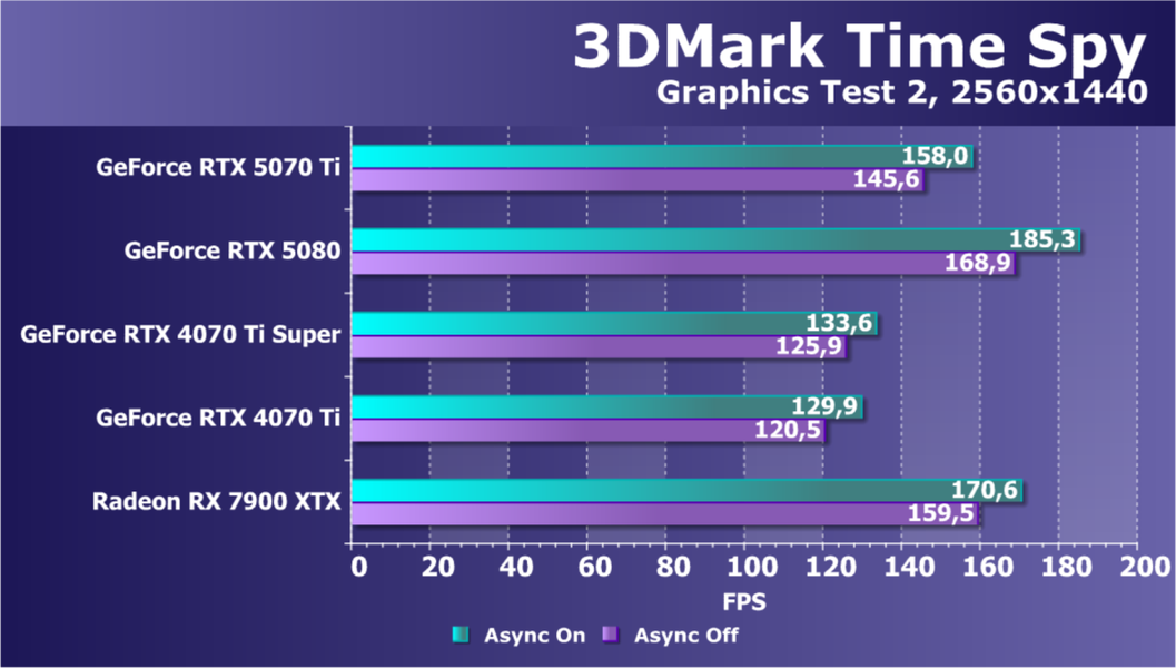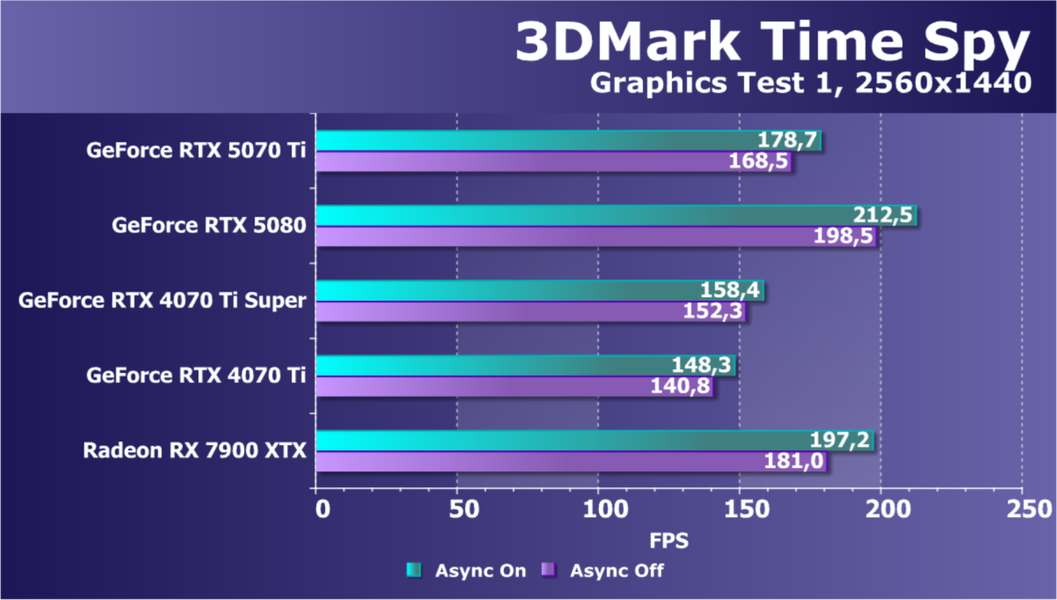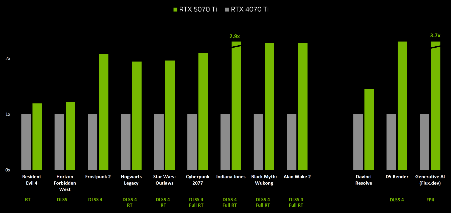 В классических играх без RT и прочих программных улучшений, а также в играх с RT и/или с технологиями динамического масштабирования DLSS(1/2/3)/FSR/XeSS новый ускоритель GeForce RTX 5070 Ti находится между GeForce RTX 4080 Super и GeForce RTX 4080 (почти на уровне первого). В играх же, где имеется возможность задействовать DLSS 4 (Multi Frame Generation, MFG), его производительность резко возрастает, и новинка может догнать даже GeForce RTX 4090.