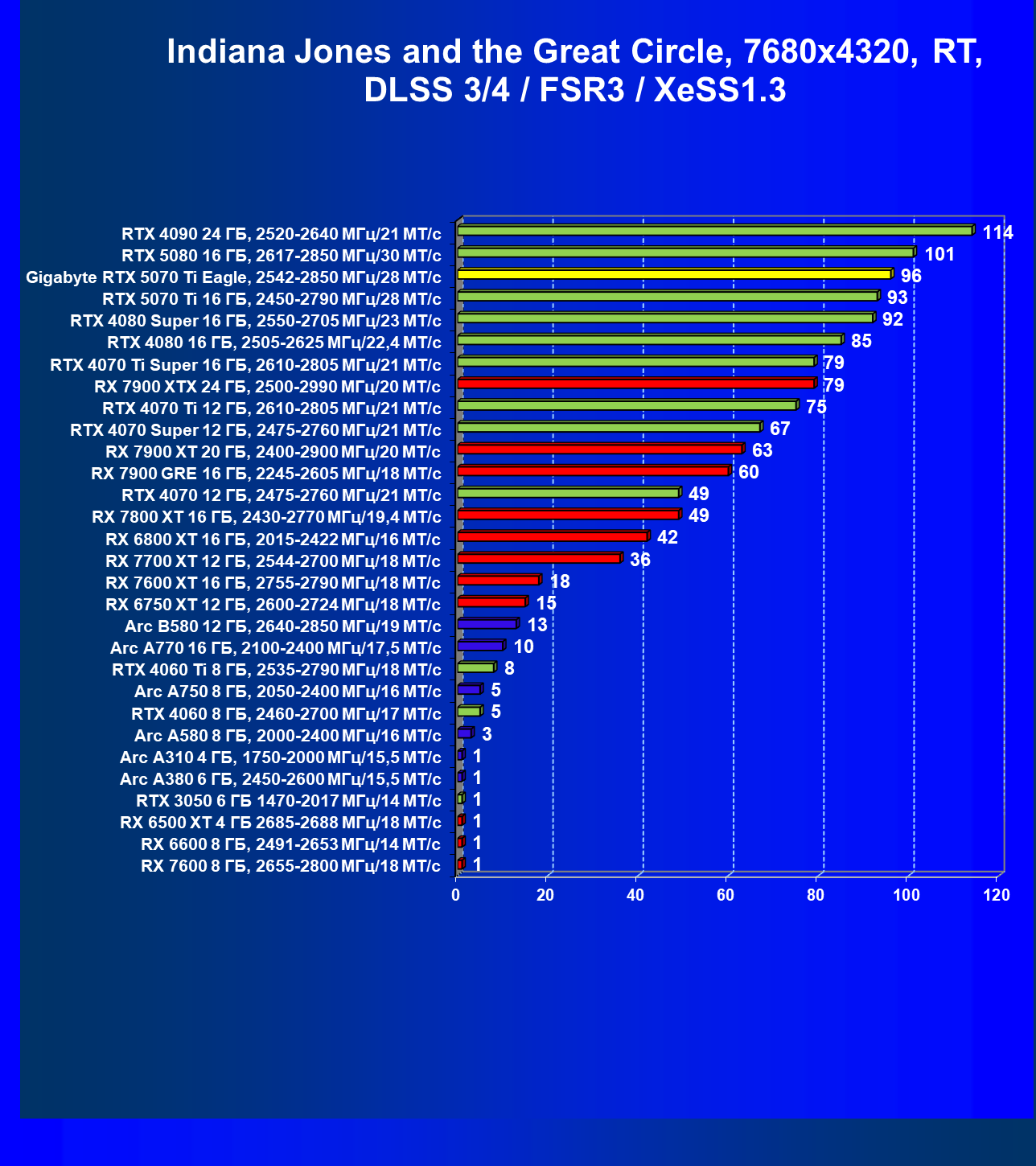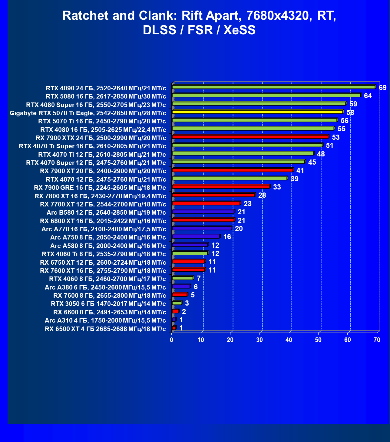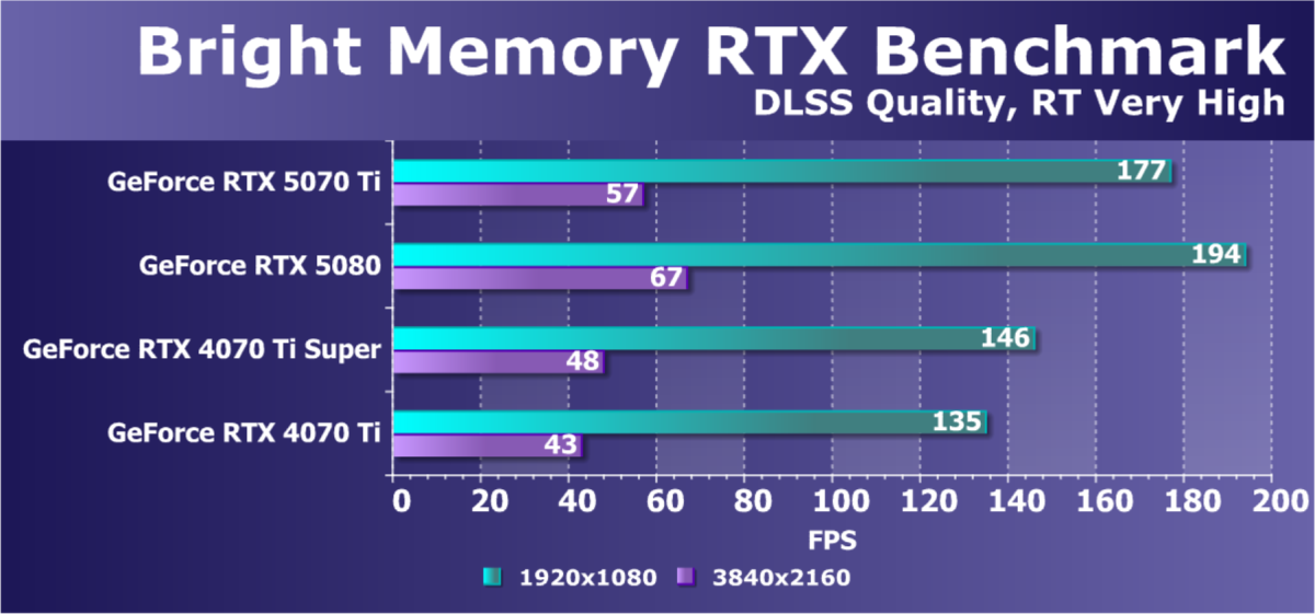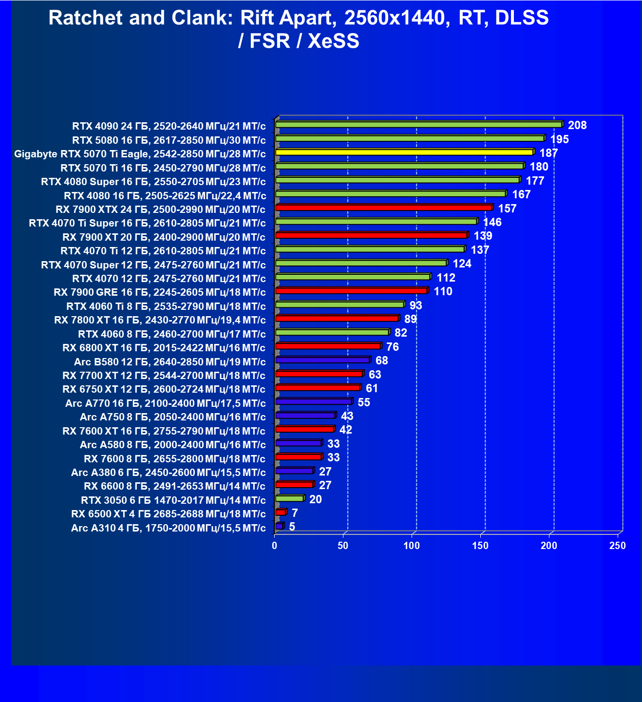 Отметим еще раз, что GeForce RTX 5070 Ti будет обеспечивать хороший и приемлемый комфорт во всех играх на высоких настройках качества при отключенных и включенных трассировке лучей и технологиях масштабирования в разрешениях до 2160p (4K) включительно. А в ряде игр при использовании тех же технологий DLSS/FSR/XeSS можно получить приемлемый комфорт и в разрешении 8K.