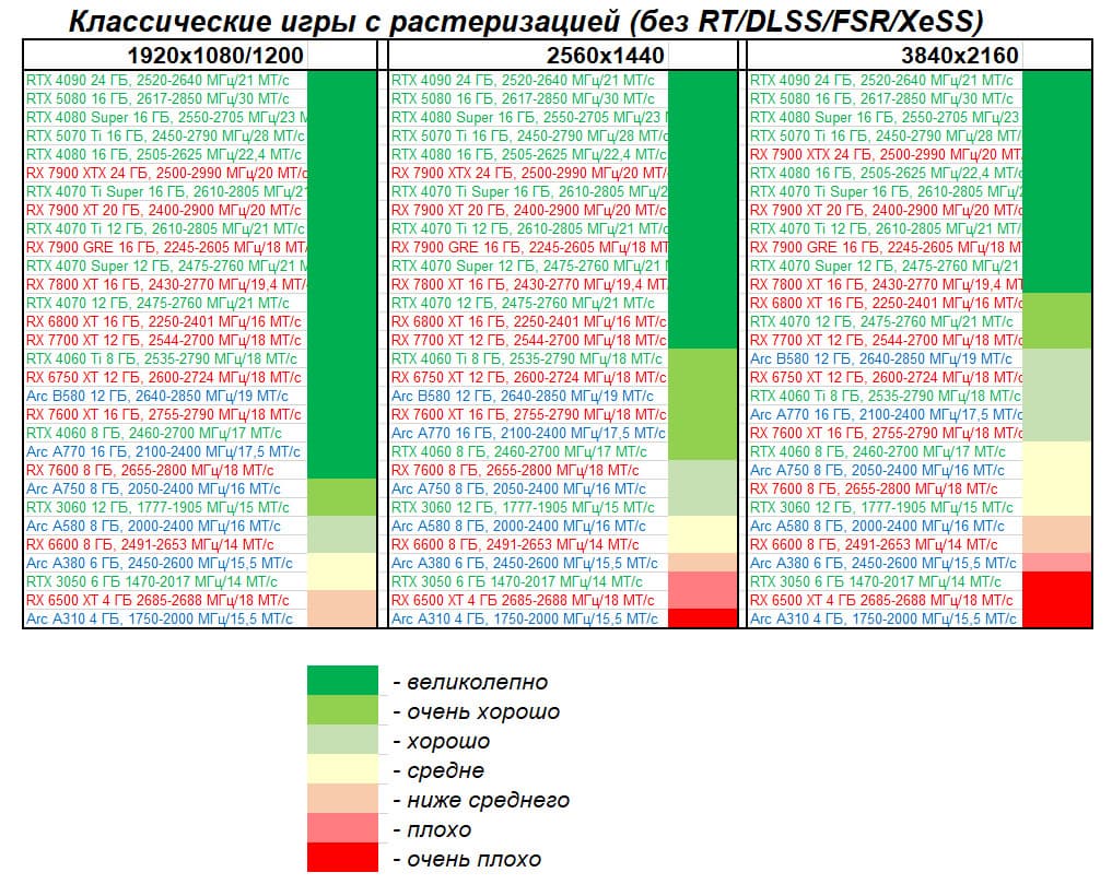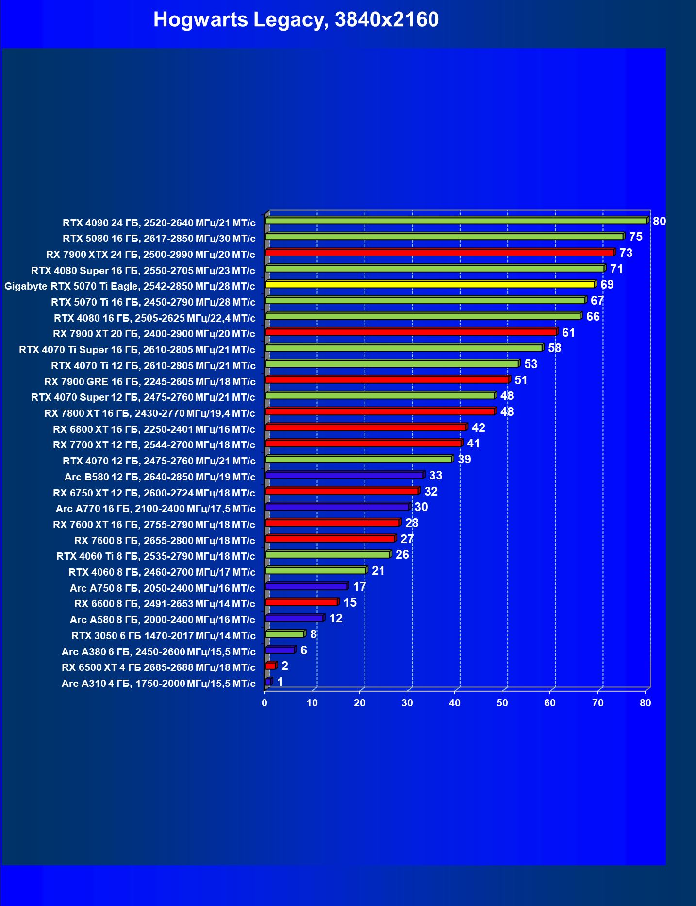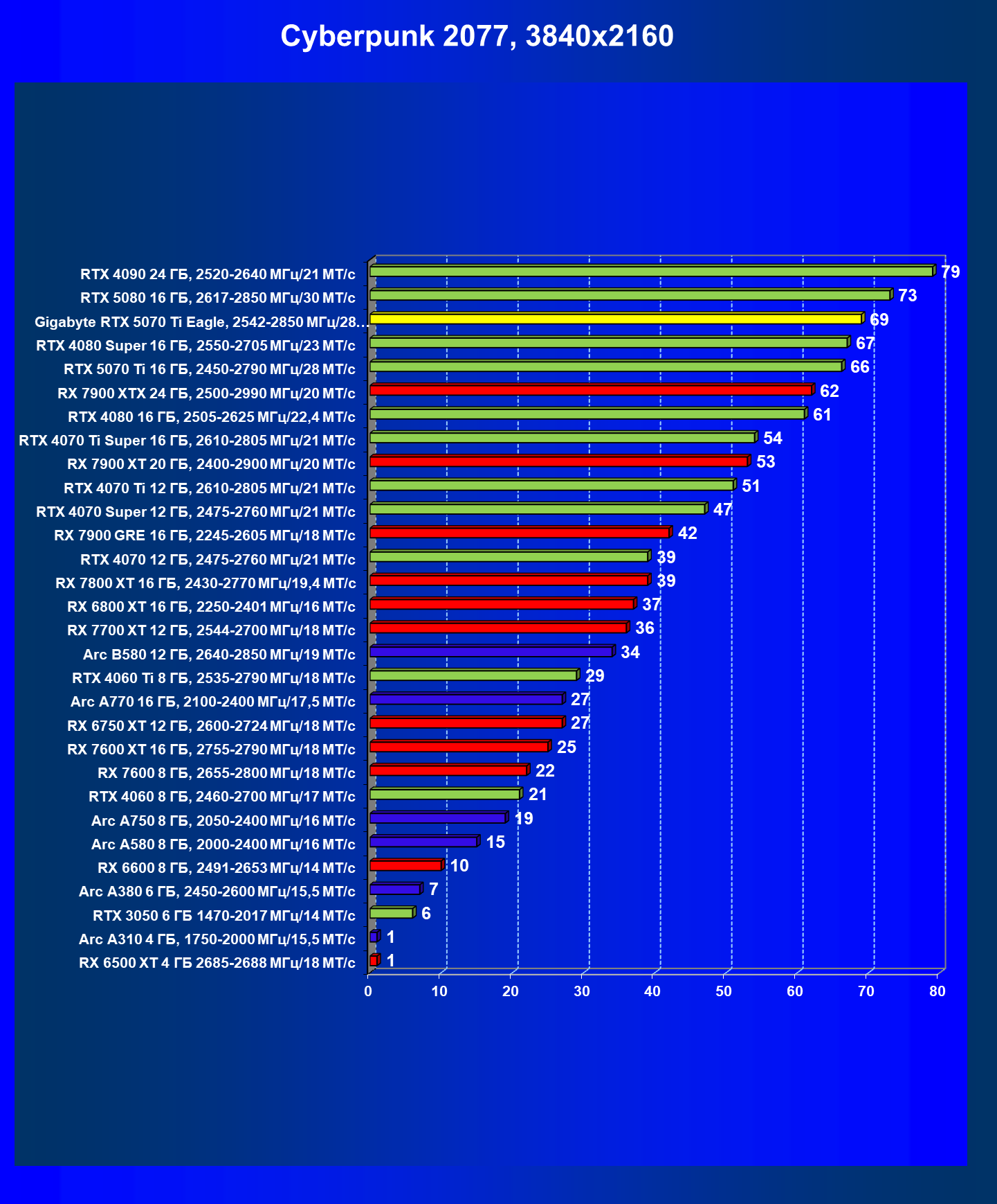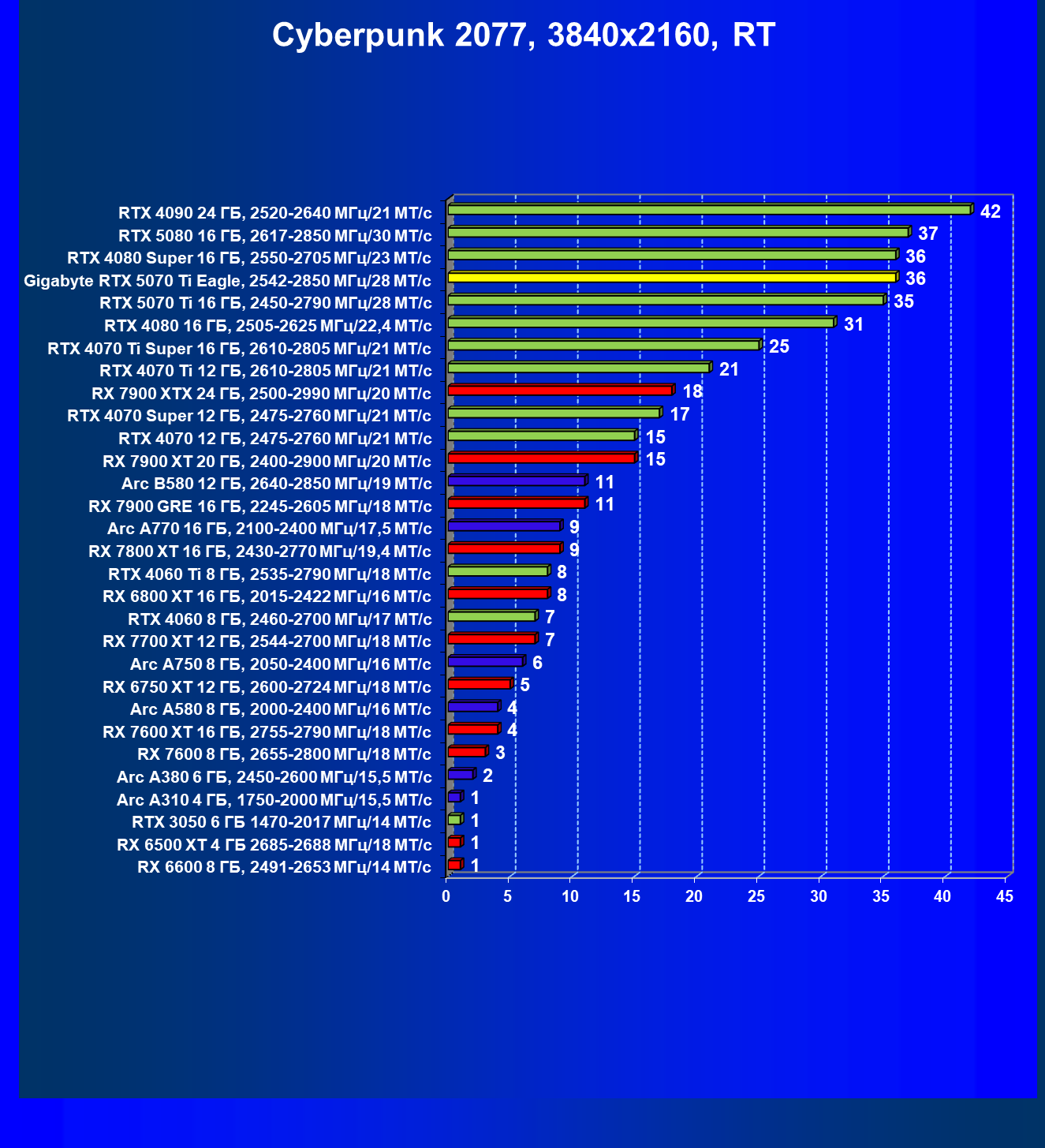 | 11 | RX 7900 XT 20 ГБ, 2400—2900 МГц/20 МТ/с | 387 | 3758 | 97 000 |