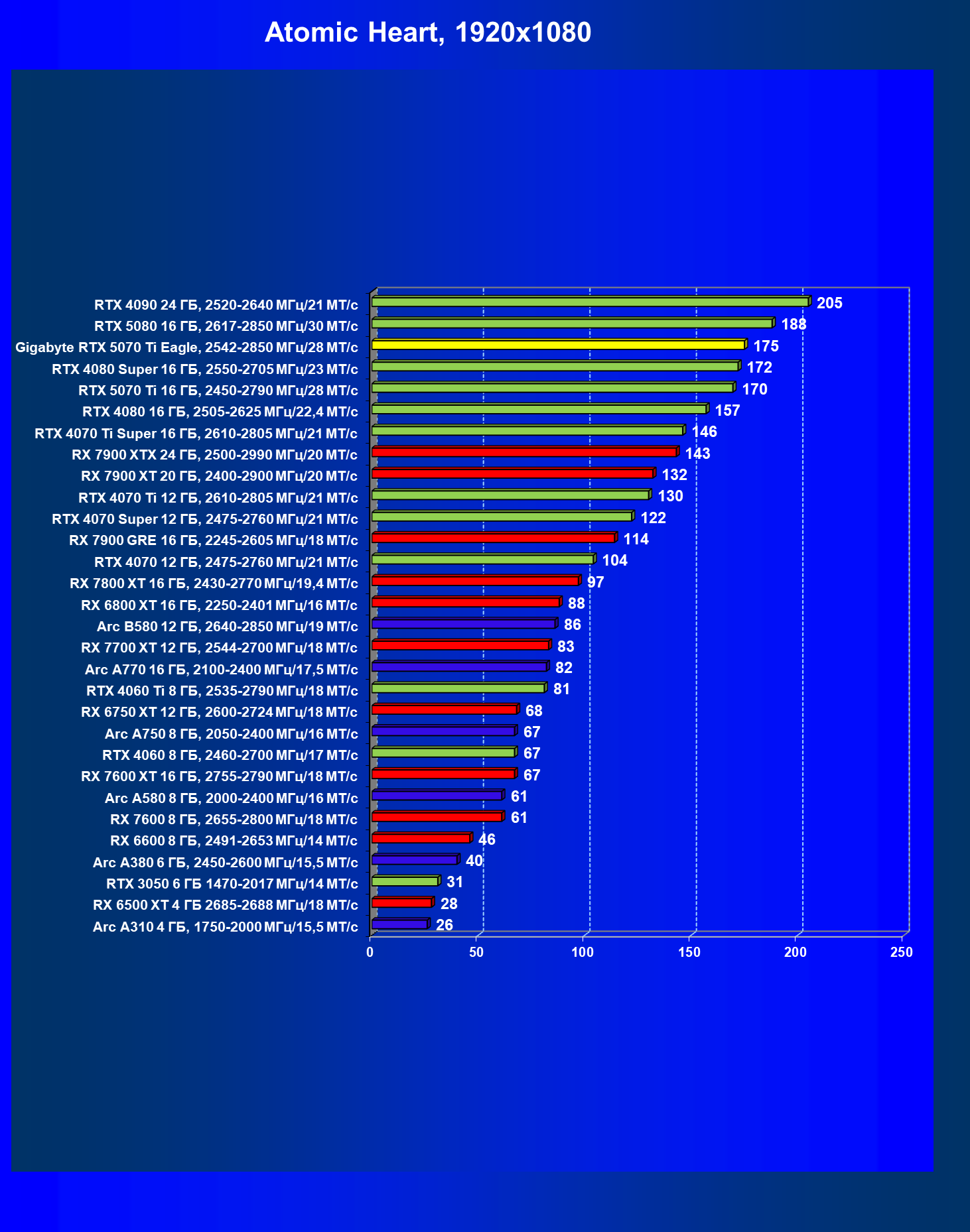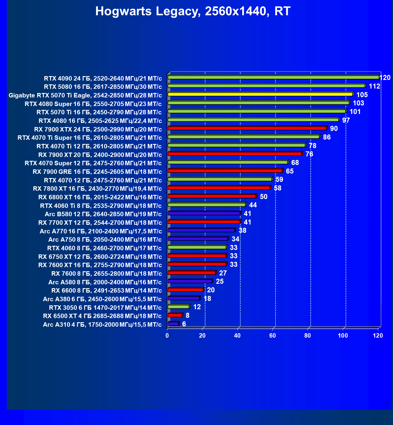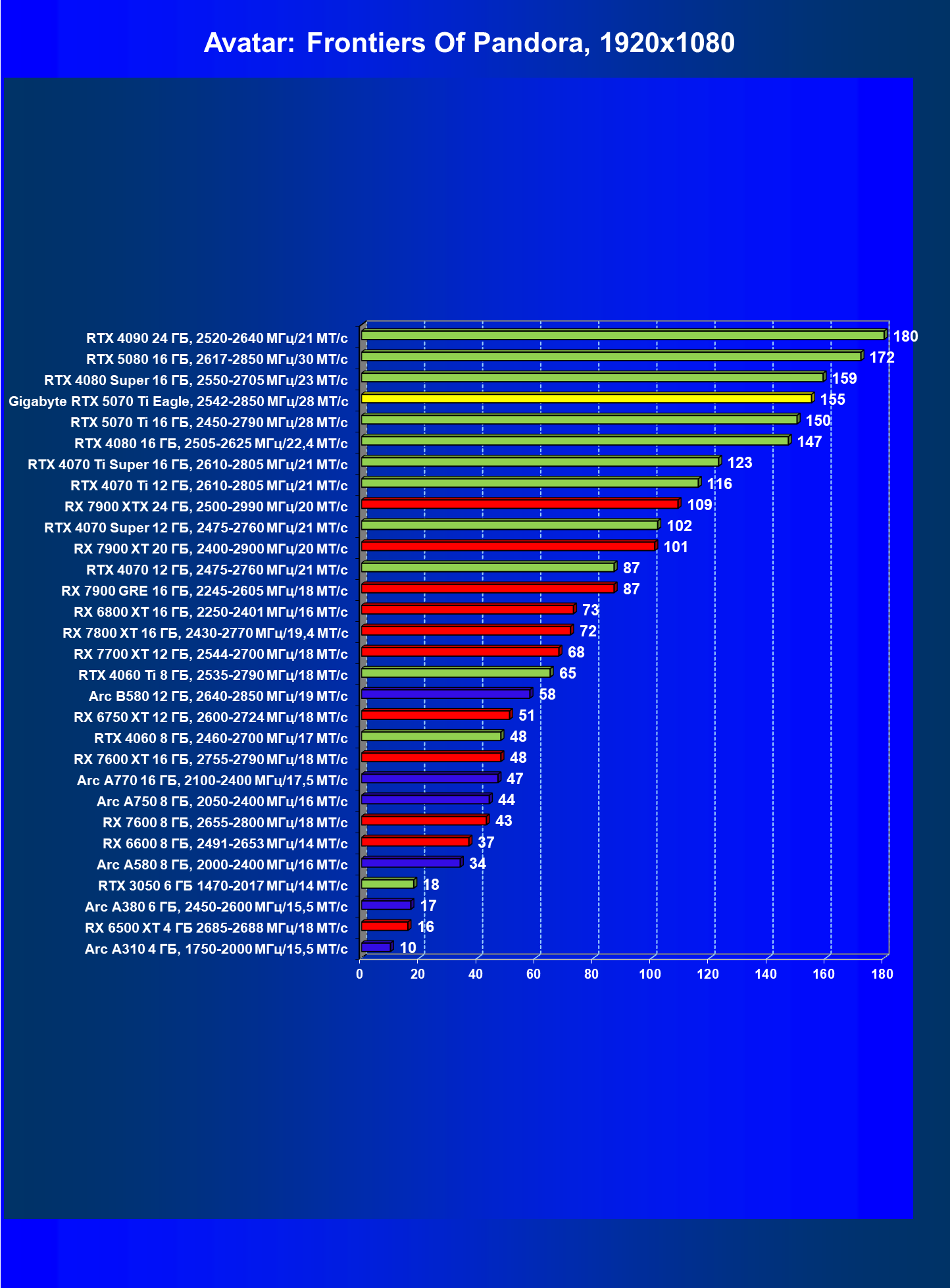 | 11 | RX 7900 XT 20 ГБ, 2400—2900 МГц/20 МТ/с | 387 | 3758 | 97 000 |