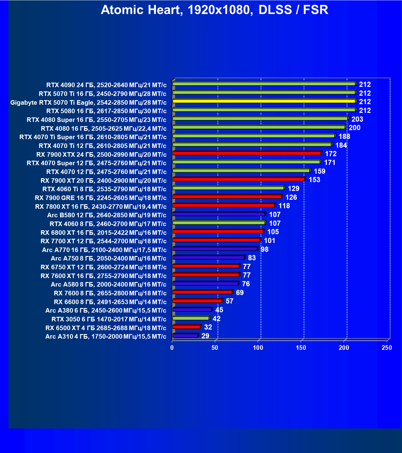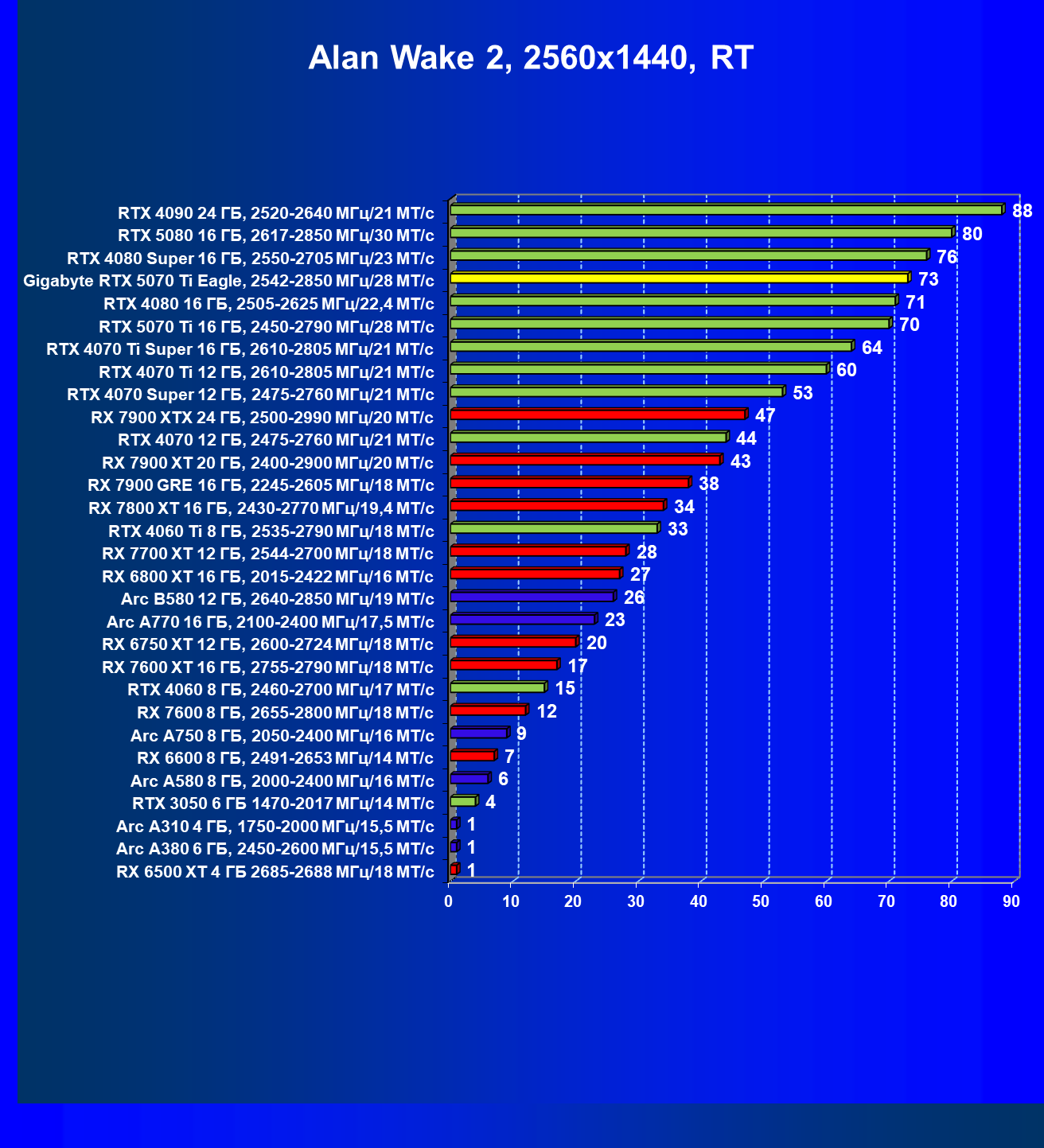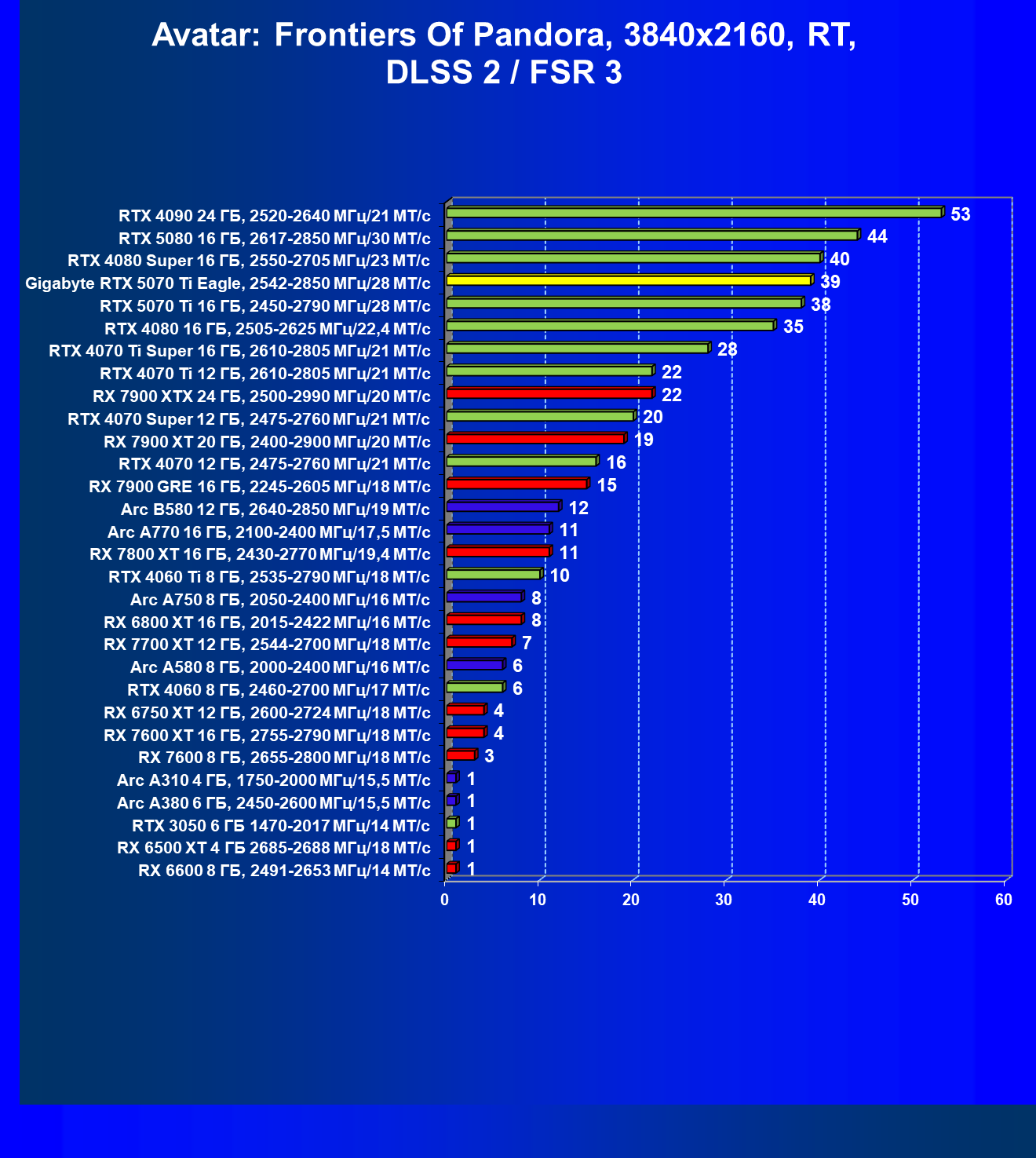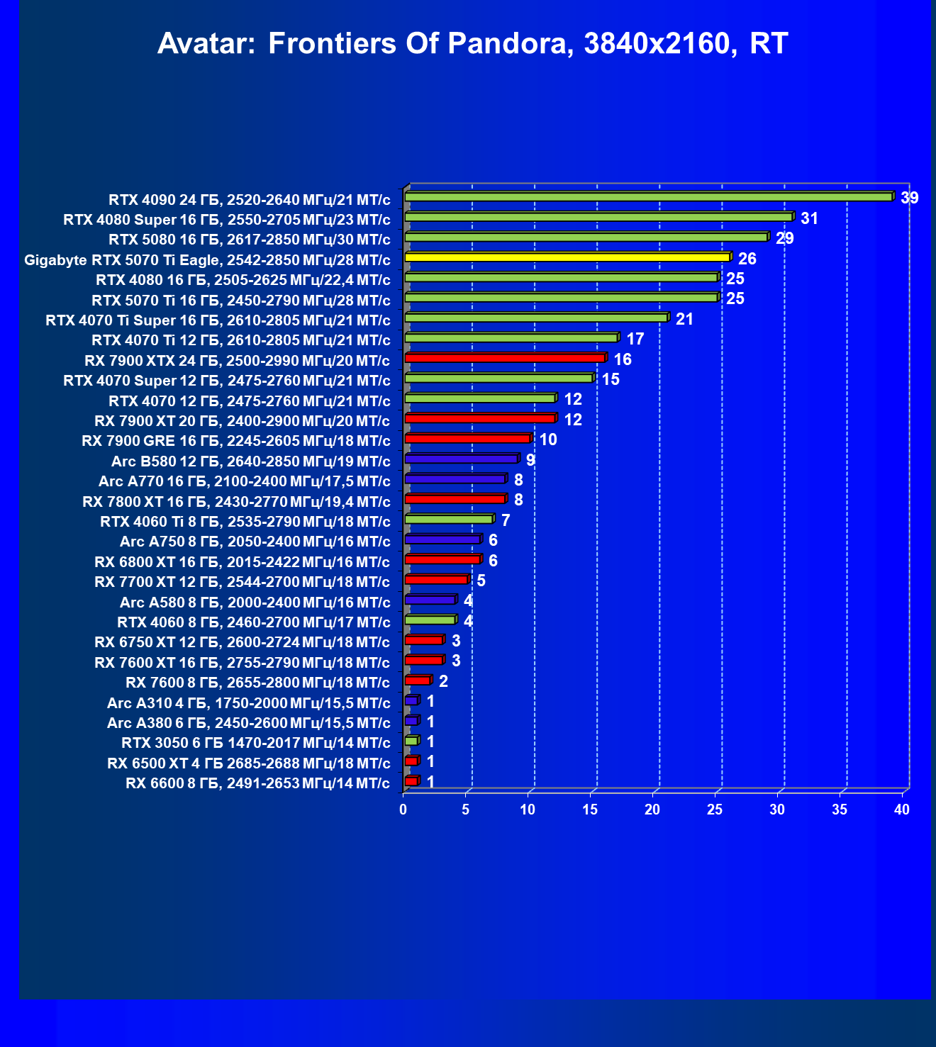 | 11 | RX 7900 XT 20 ГБ, 2400—2900 МГц/20 МТ/с | 387 | 3758 | 97 000 |