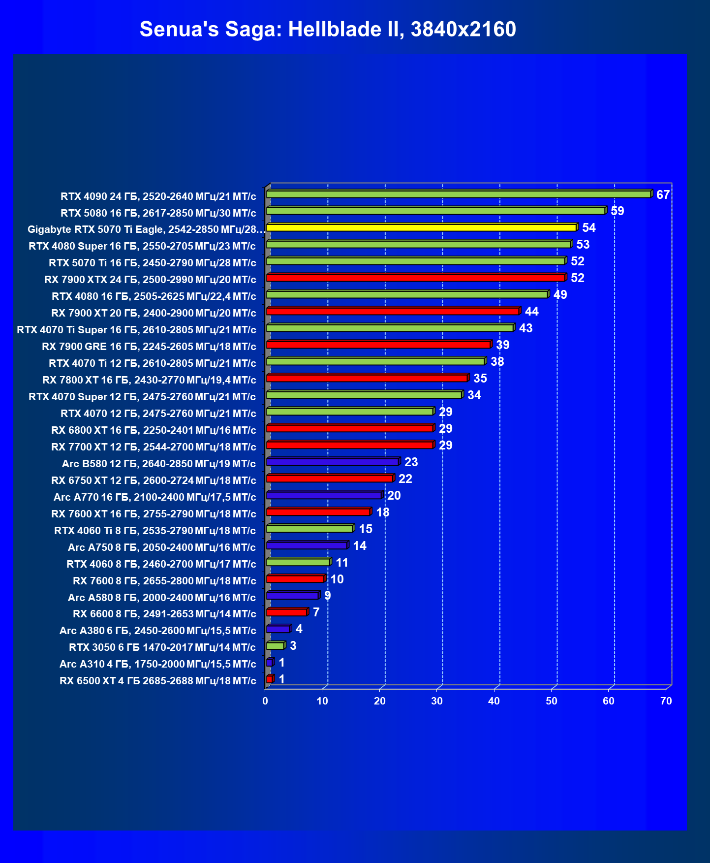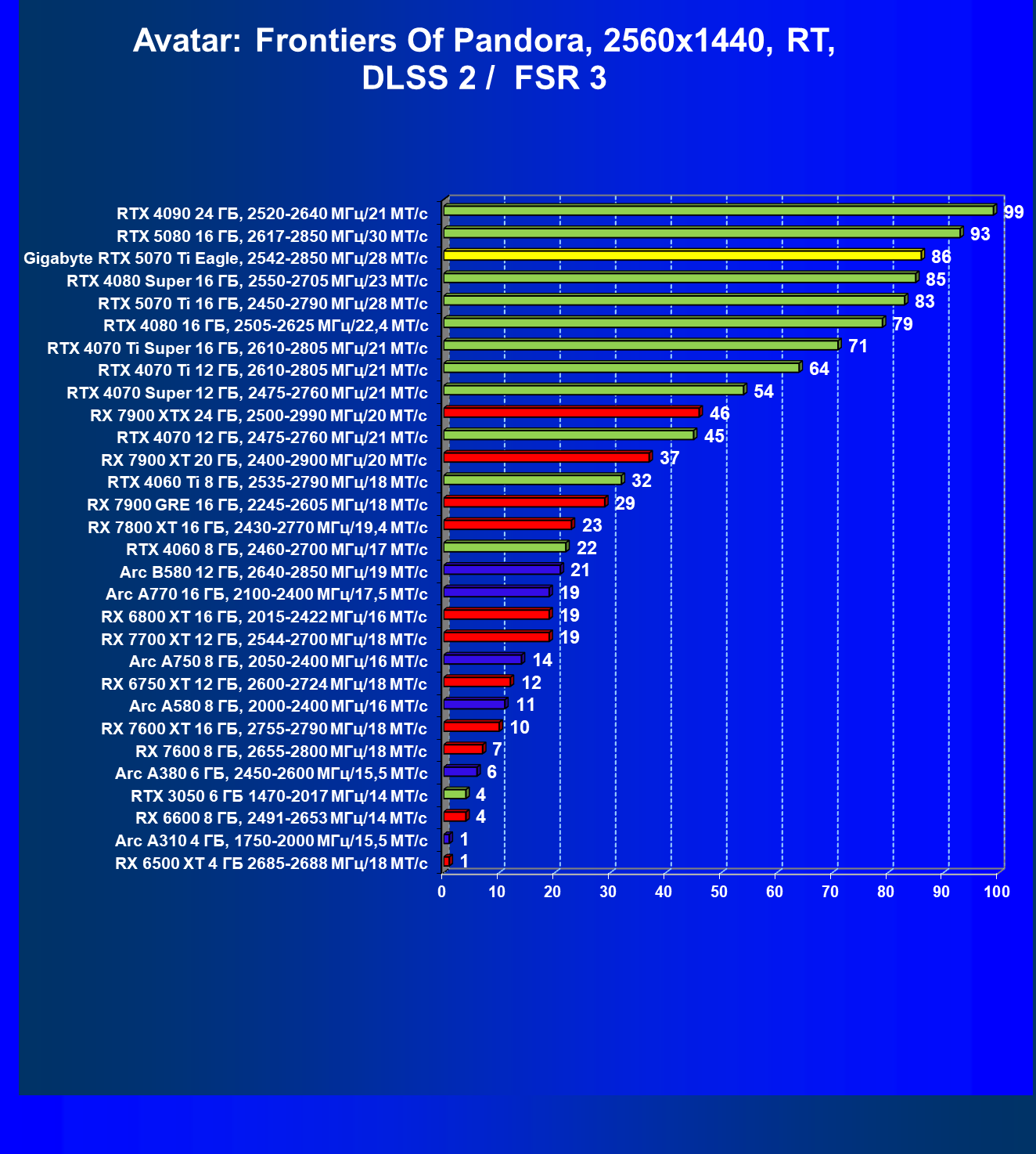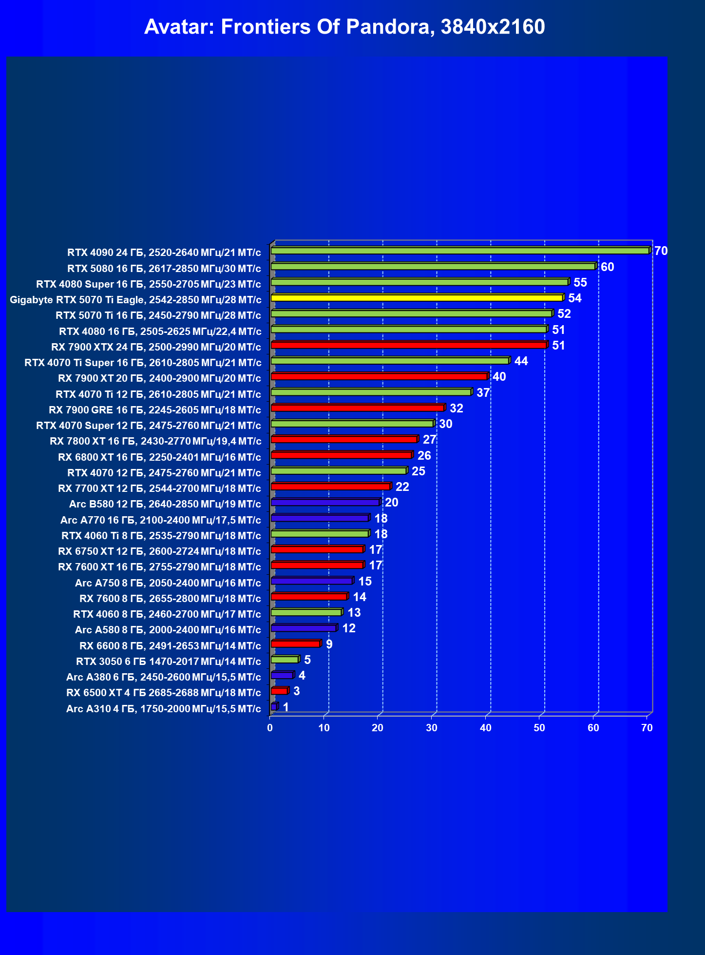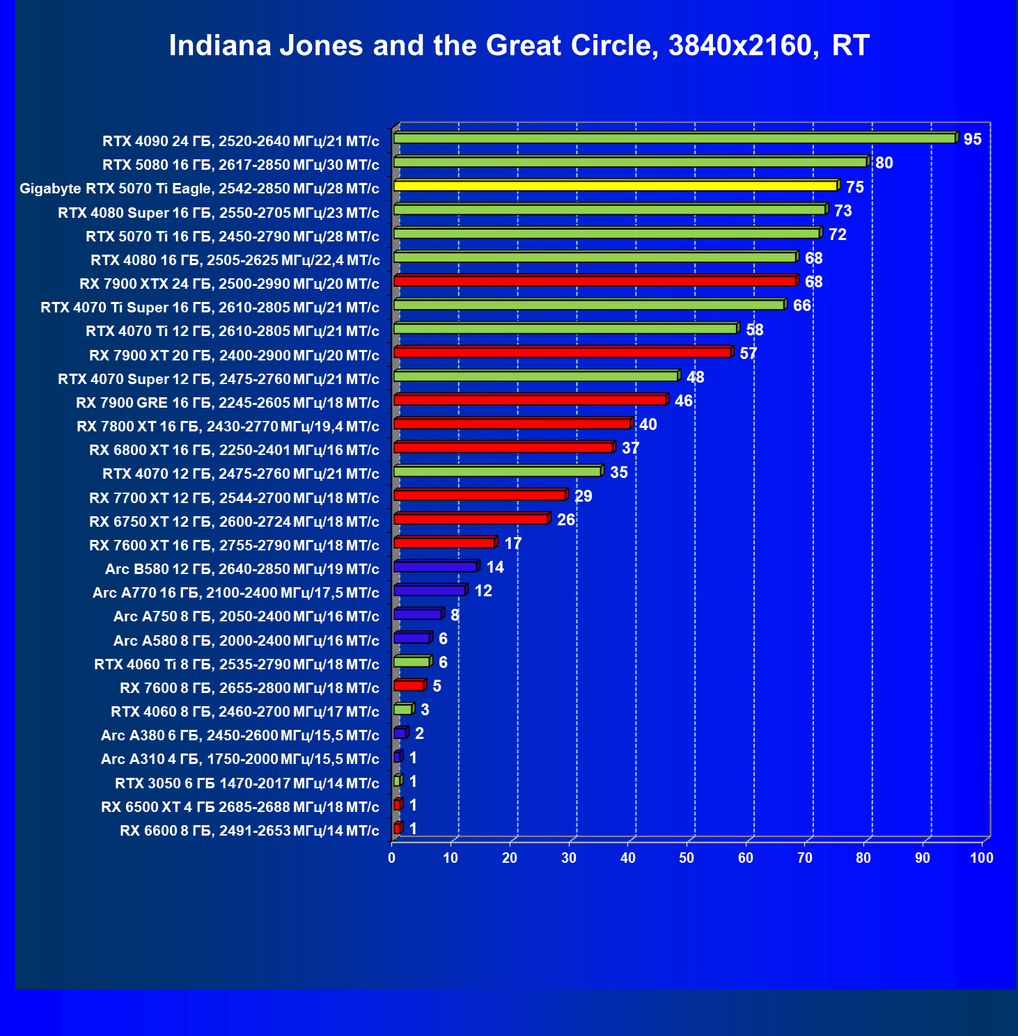 | 17 | RX 7900 XT 20 ГБ, 2400—2900 МГц/20 МТ/с | 543 | 5270 | 97 000 |