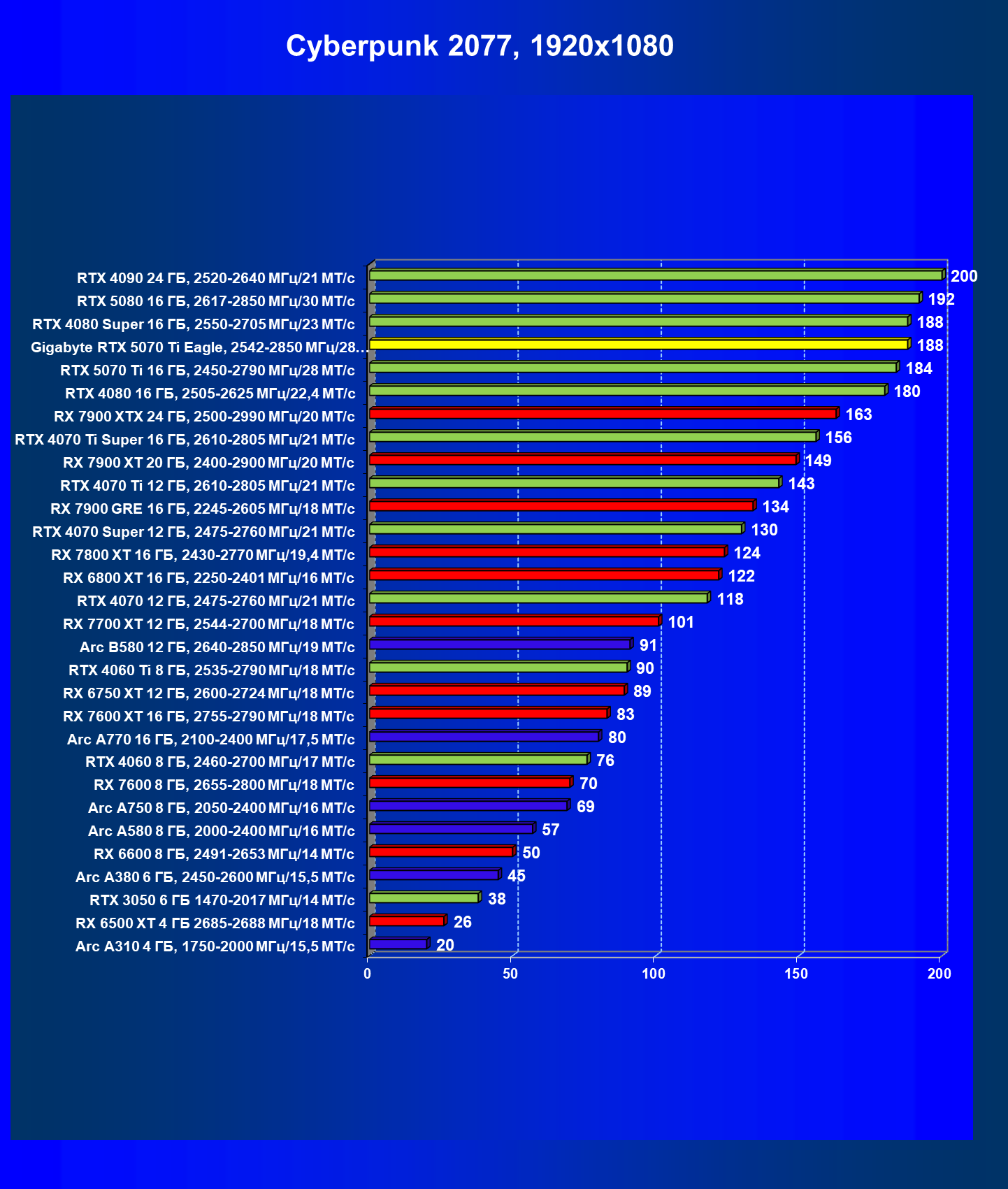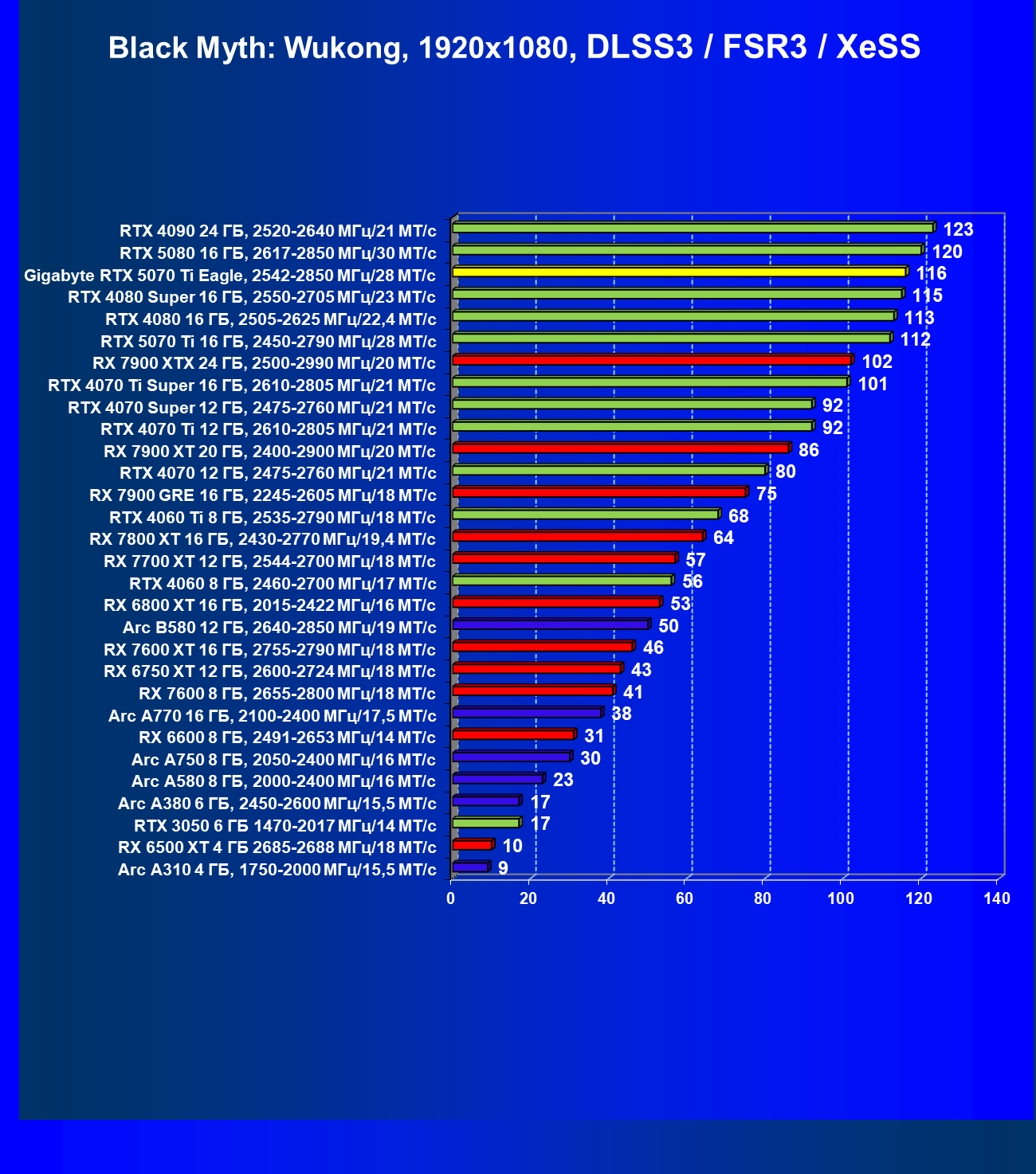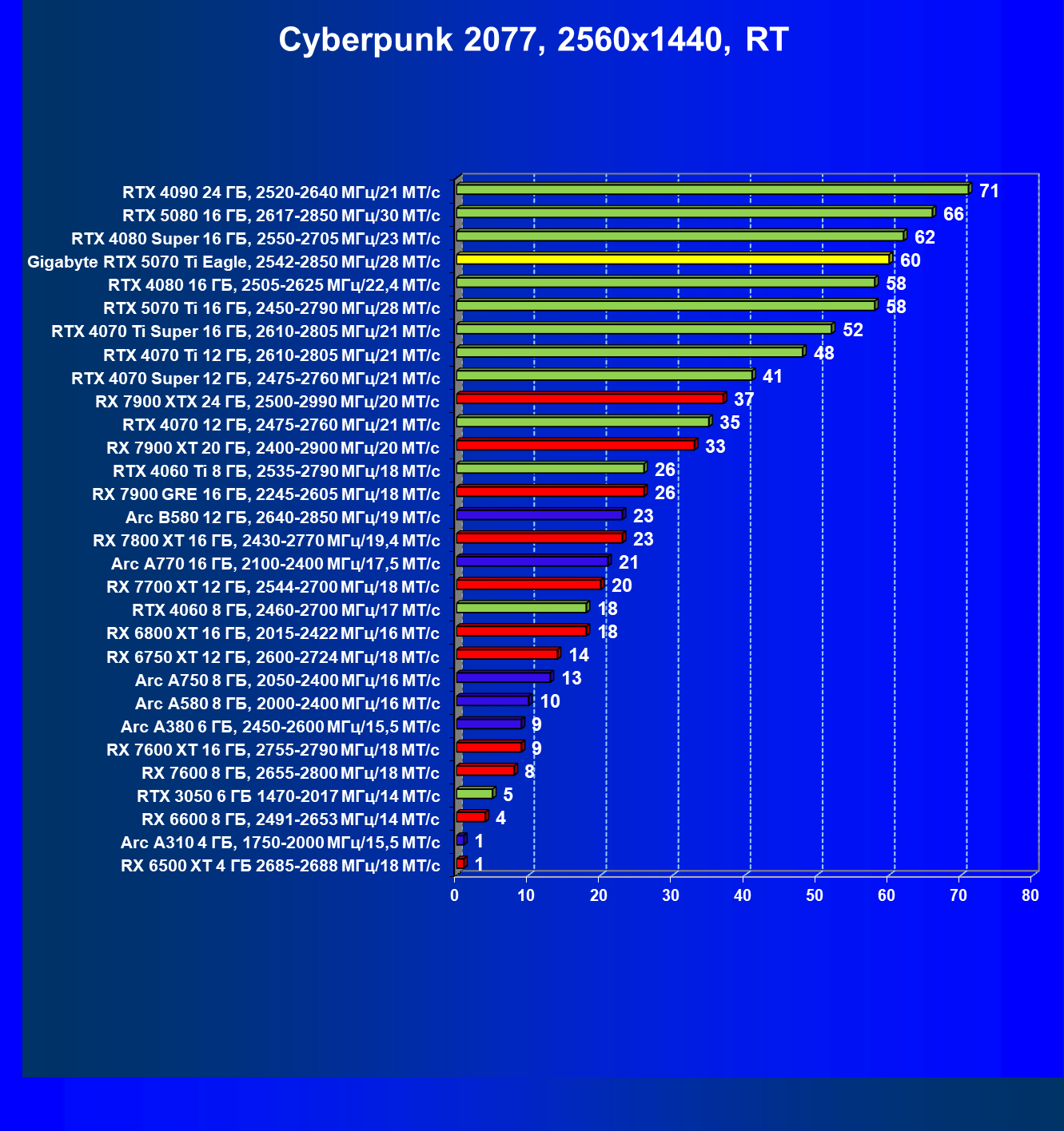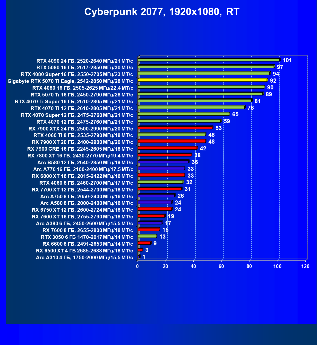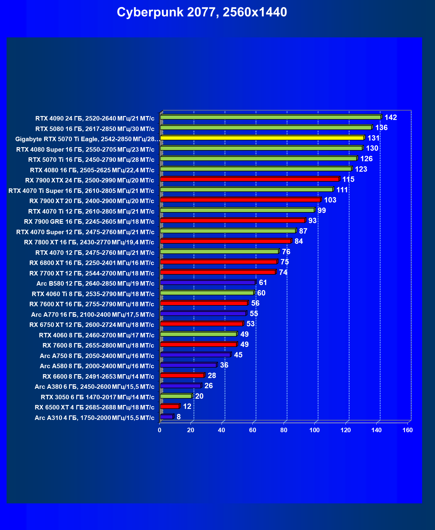 | 01 | Gigabyte GeForce RTX 5070 Ti Eagle, 2542—2850 МГц/28 МТ/с | 968 | 12388 | 128 000 |