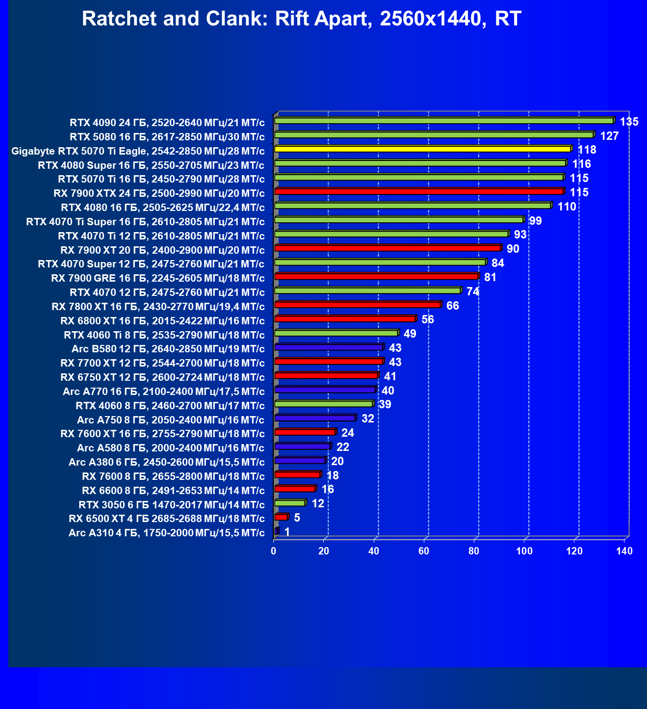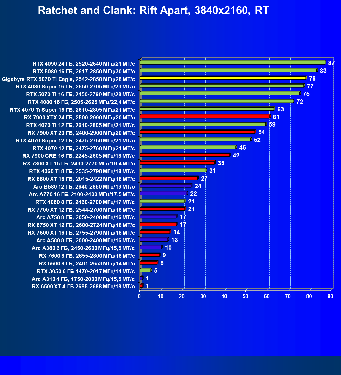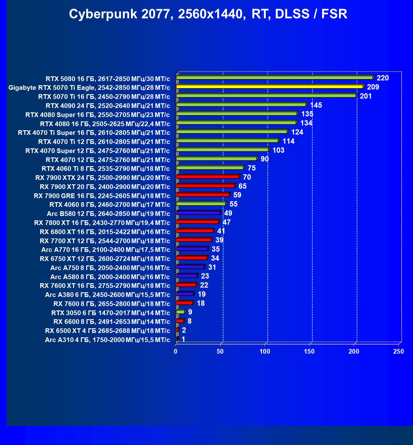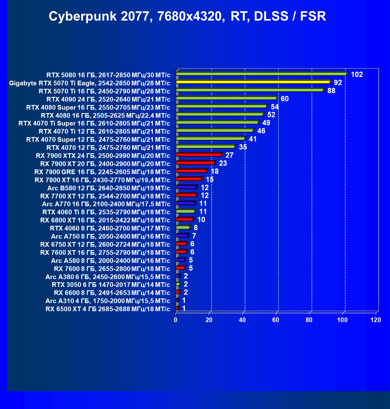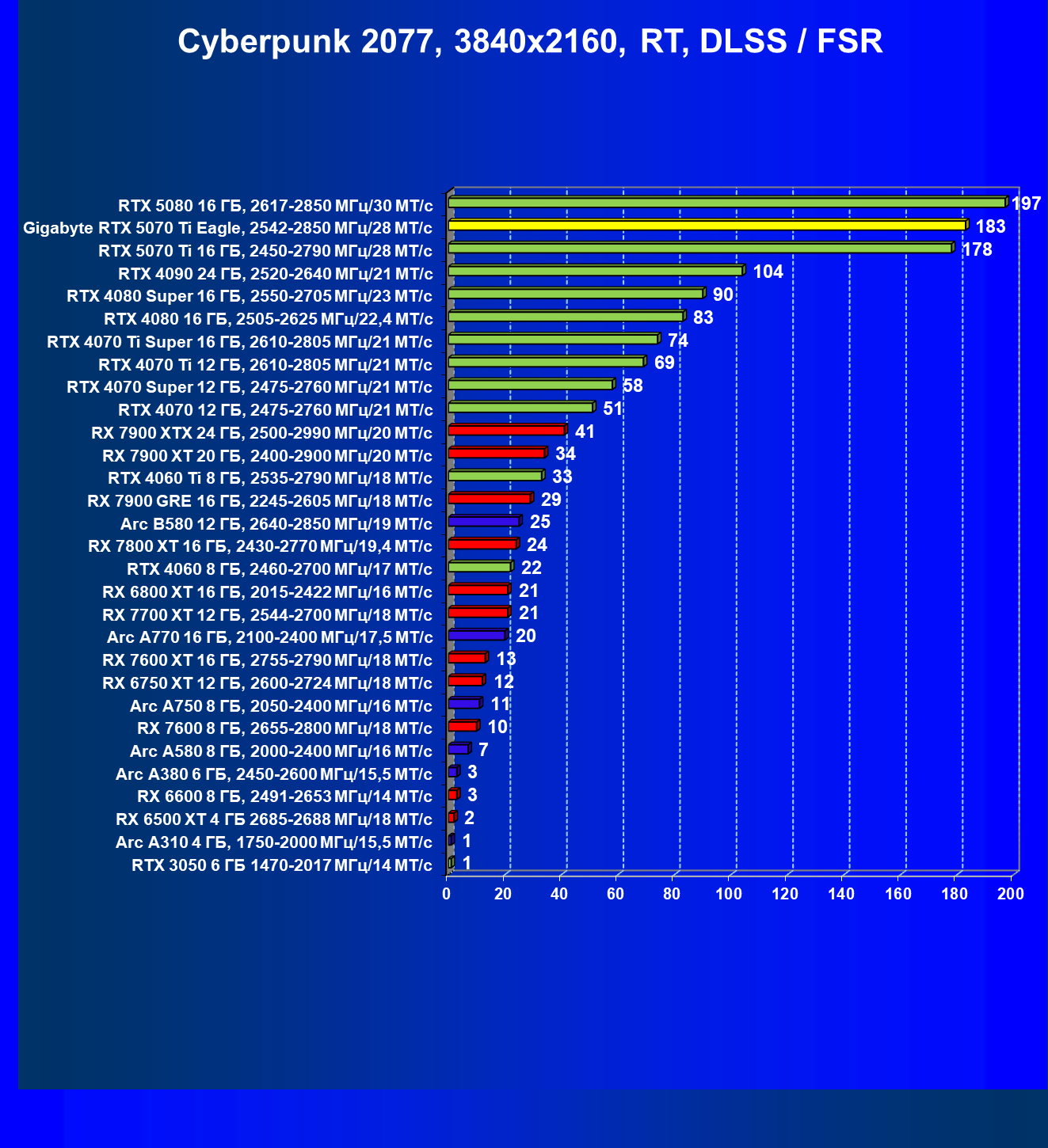 | 01 | Gigabyte GeForce RTX 5070 Ti Eagle, 2542—2850 МГц/28 МТ/с | 968 | 12388 | 128 000 |