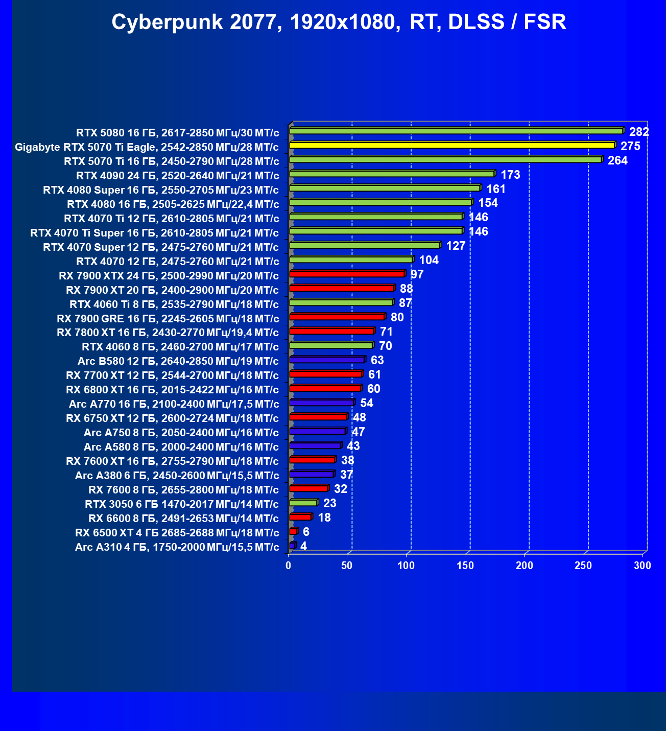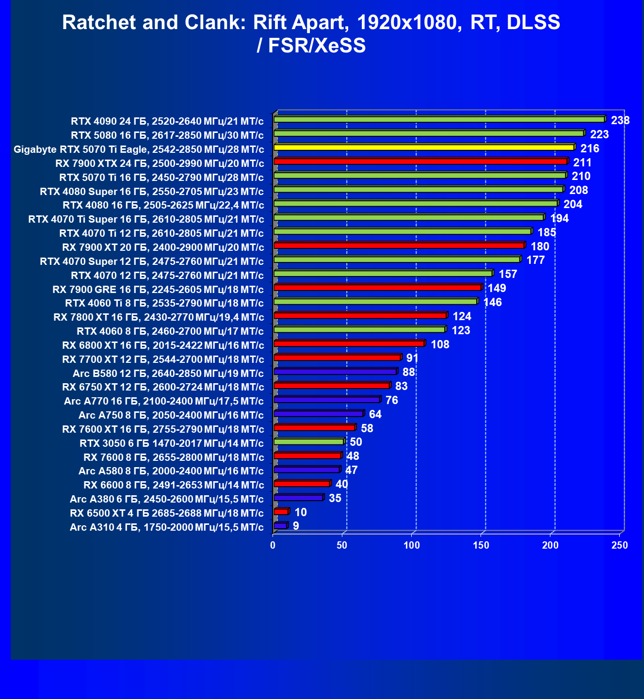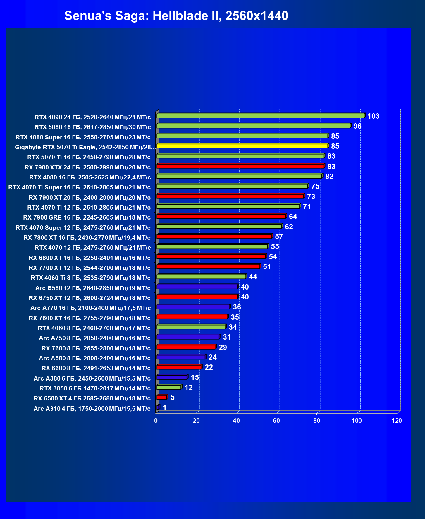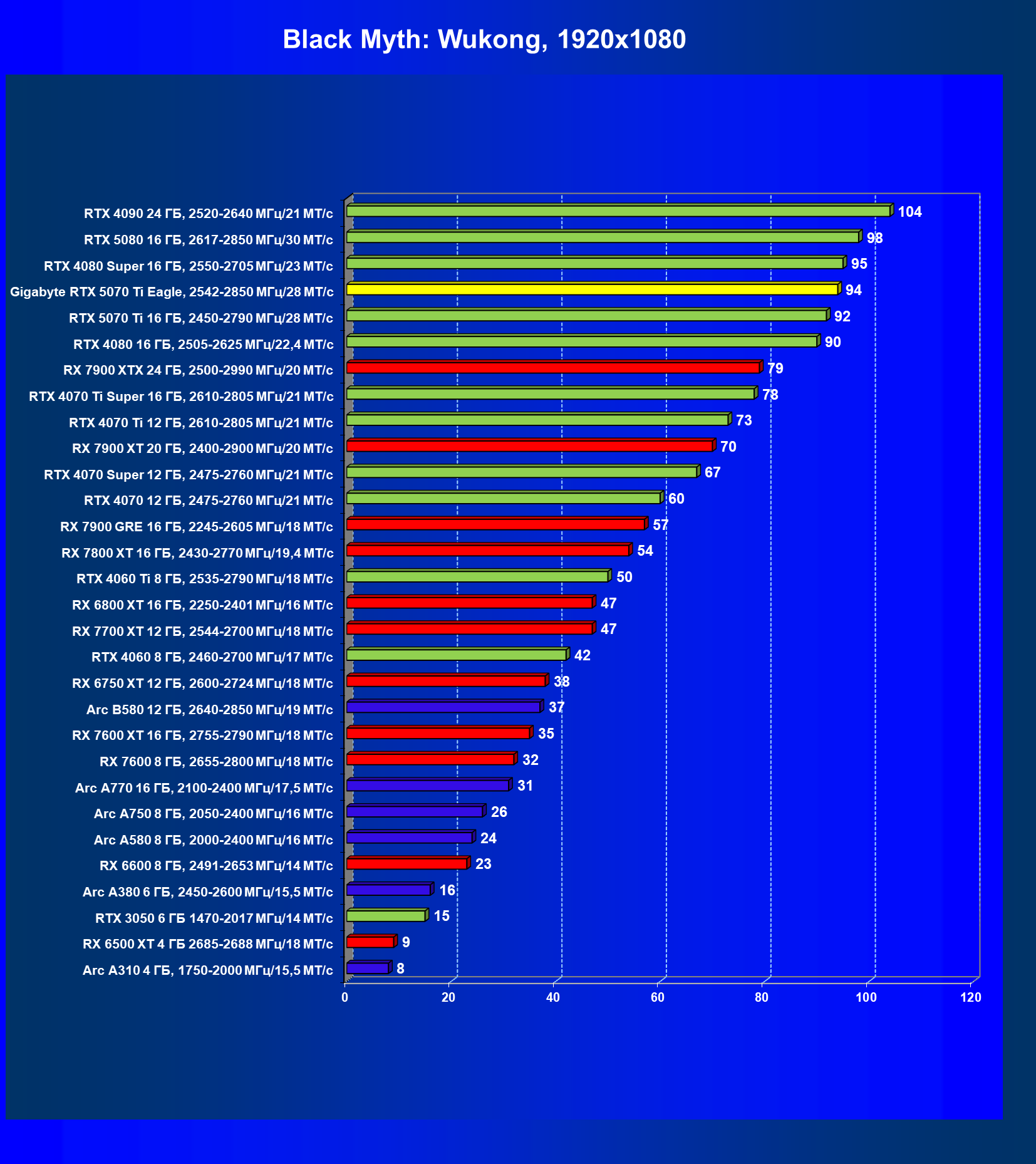 | 01 | Gigabyte GeForce RTX 5070 Ti Eagle, 2542—2850 МГц/28 МТ/с | 968 | 12388 | 128 000 |