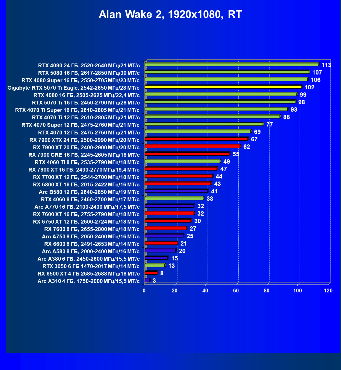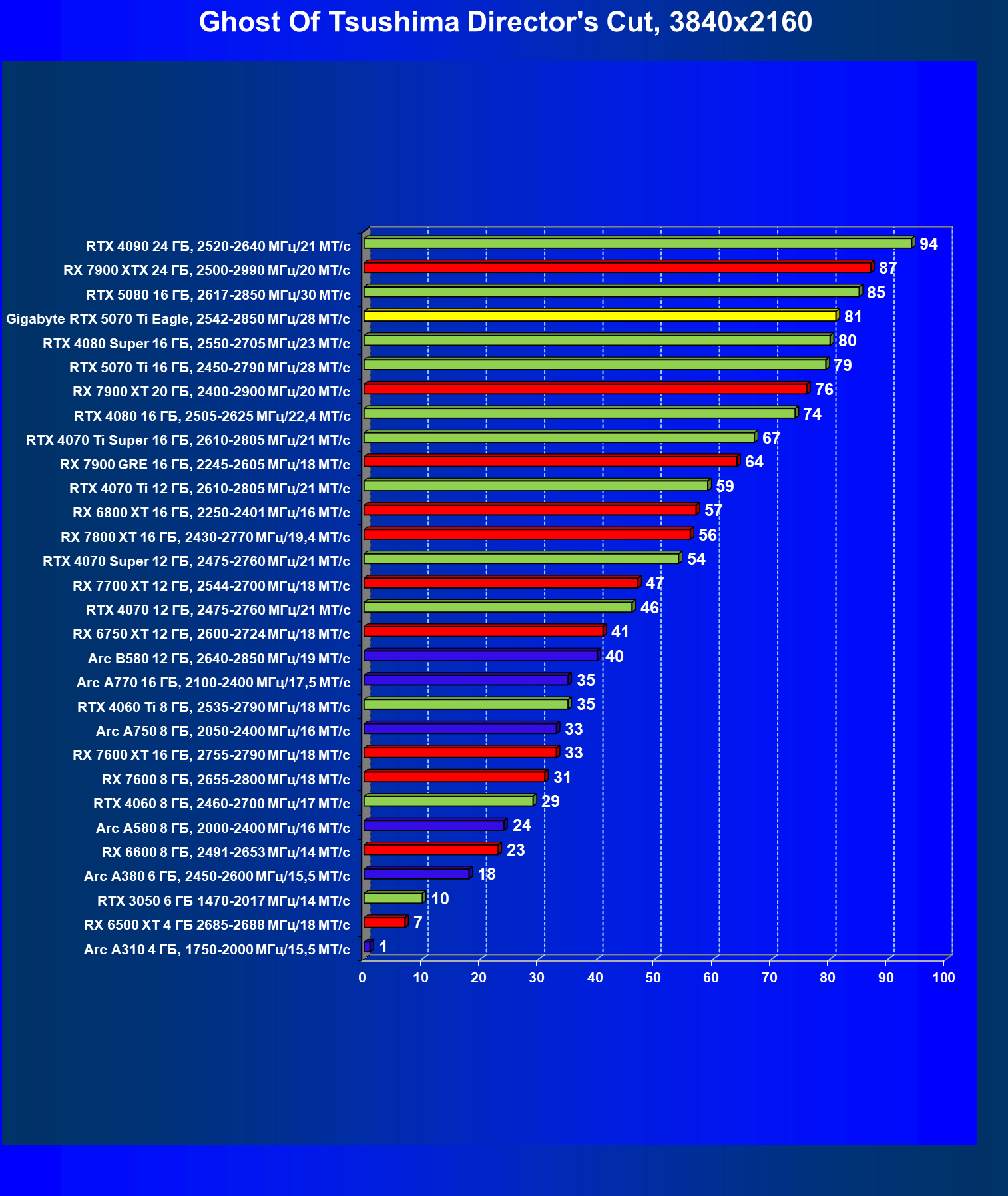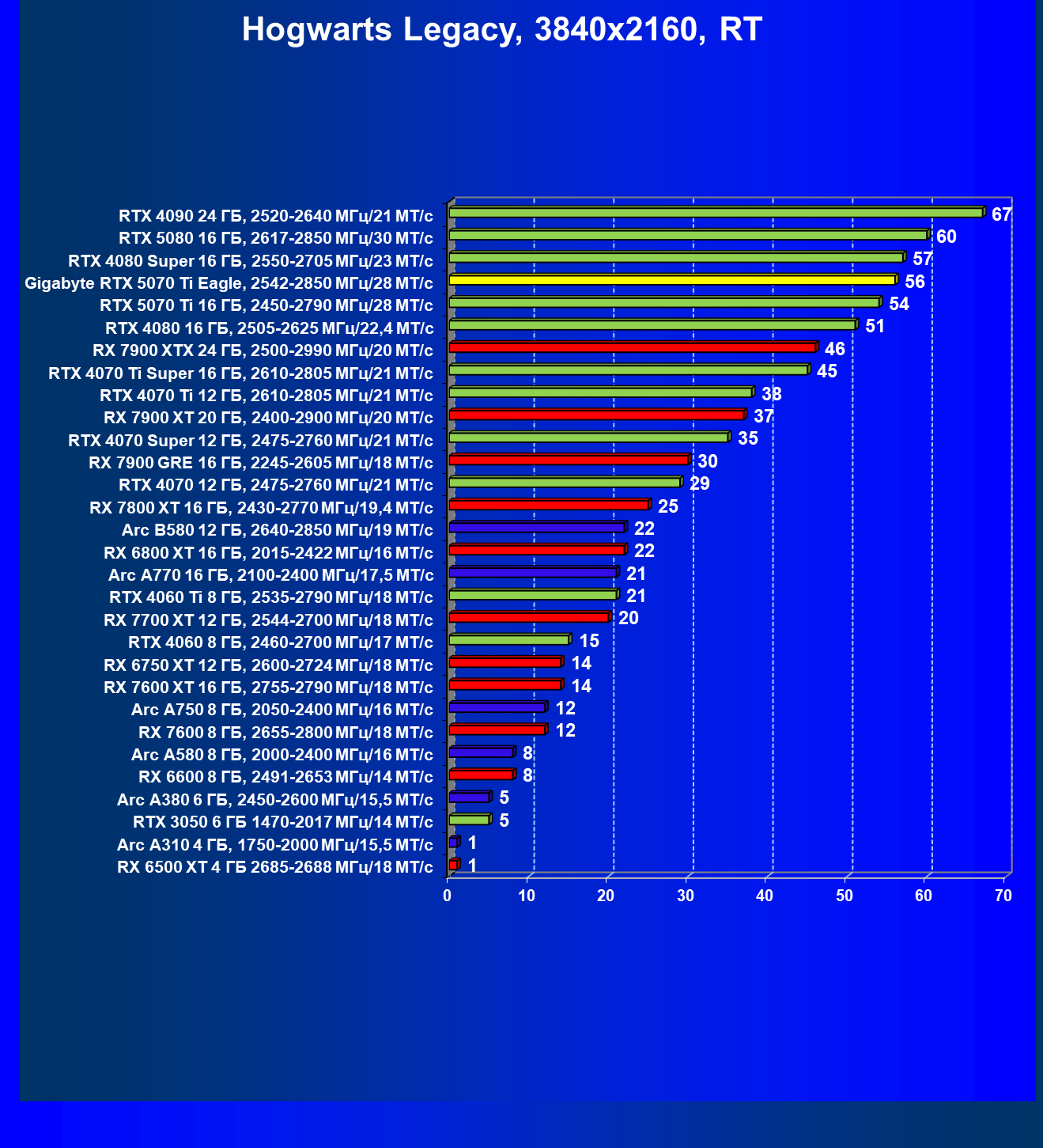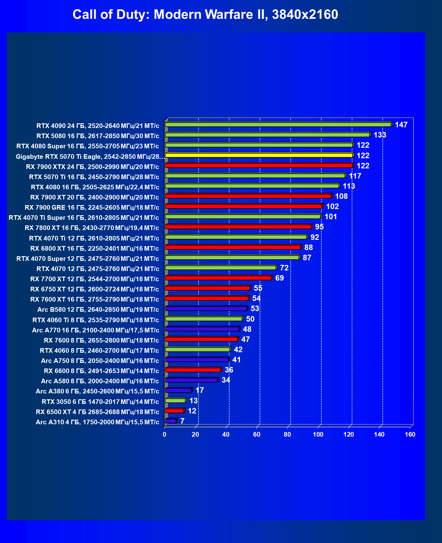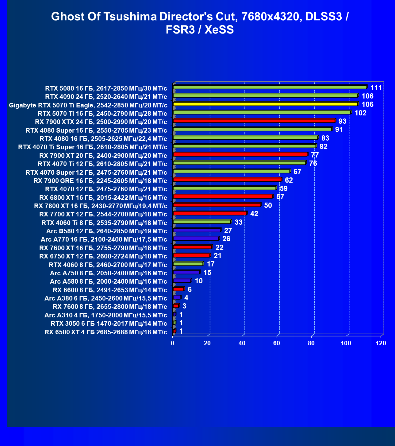 | 01 | Gigabyte GeForce RTX 5070 Ti Eagle, 2542—2850 МГц/28 МТ/с | 968 | 12388 | 128 000 |