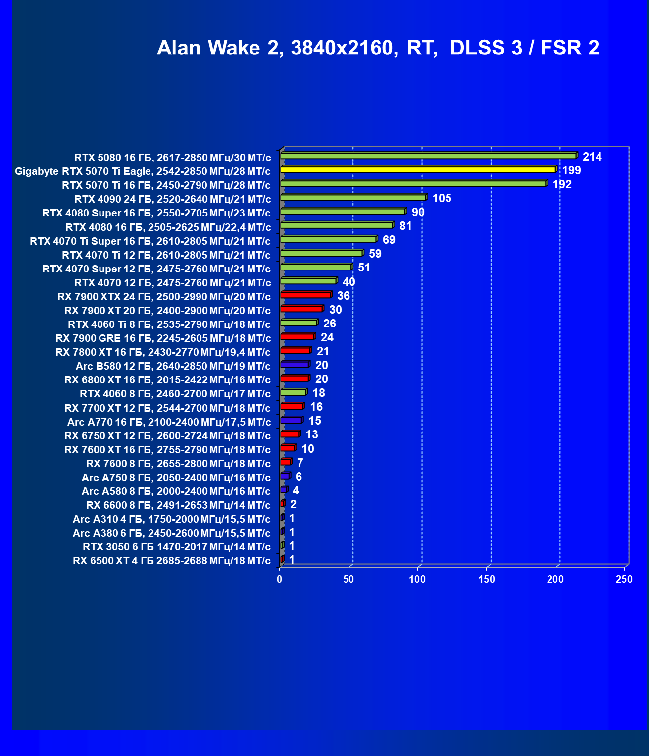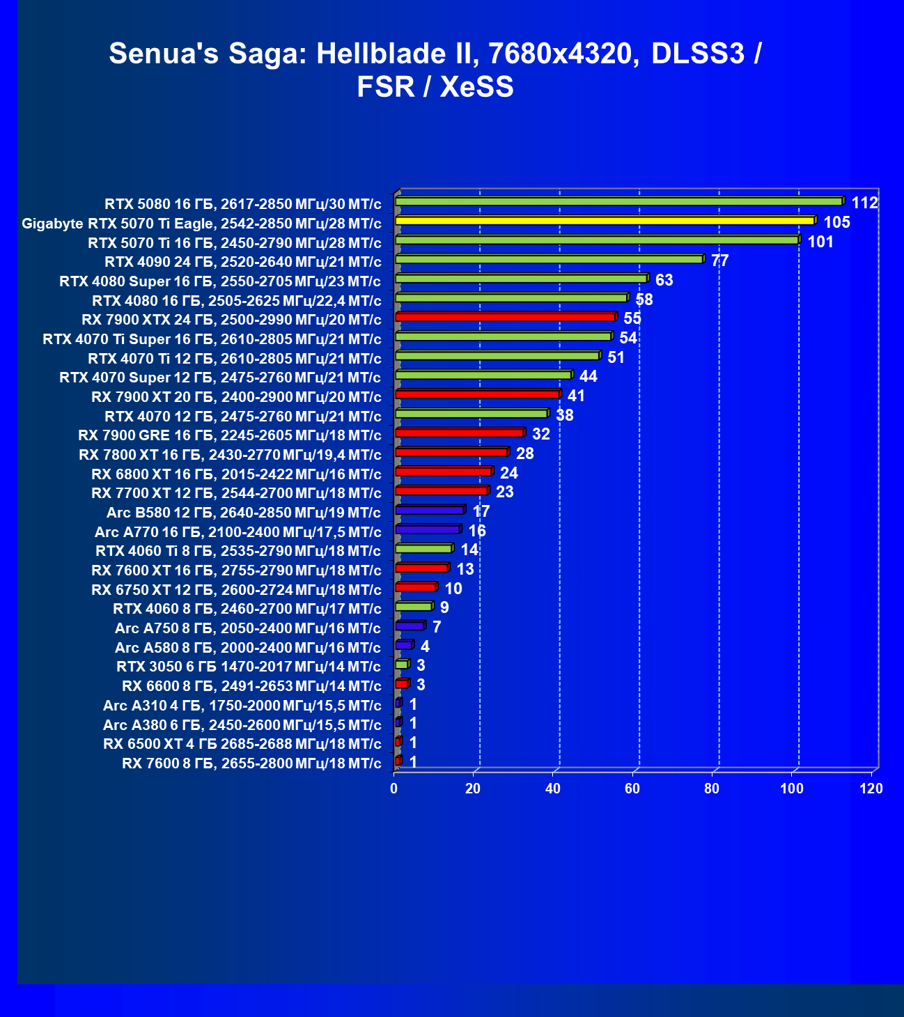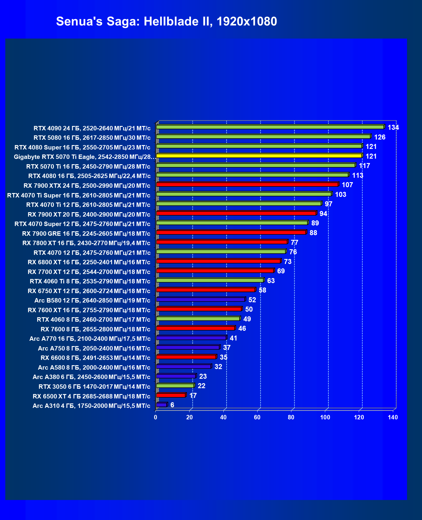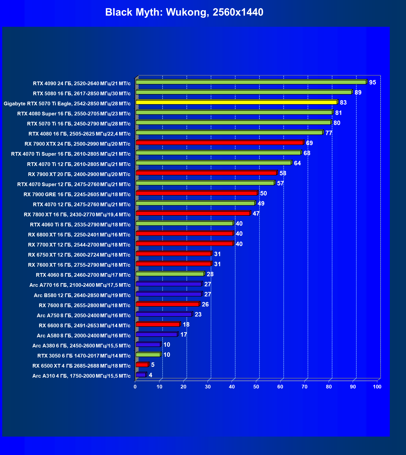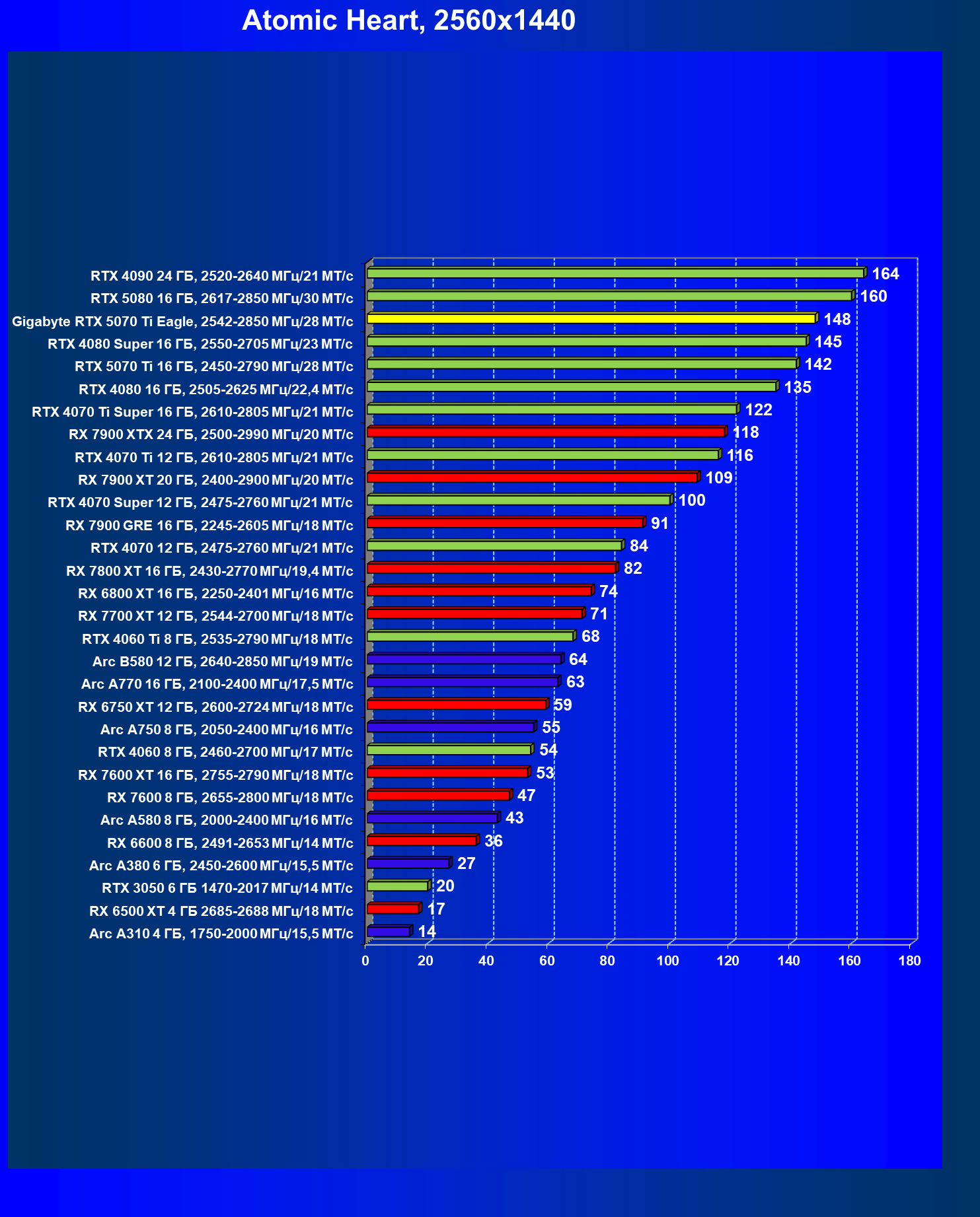| 01 | Gigabyte GeForce RTX 5070 Ti Eagle, 2542—2850 МГц/28 МТ/с | 968 | 12388 | 128 000 |