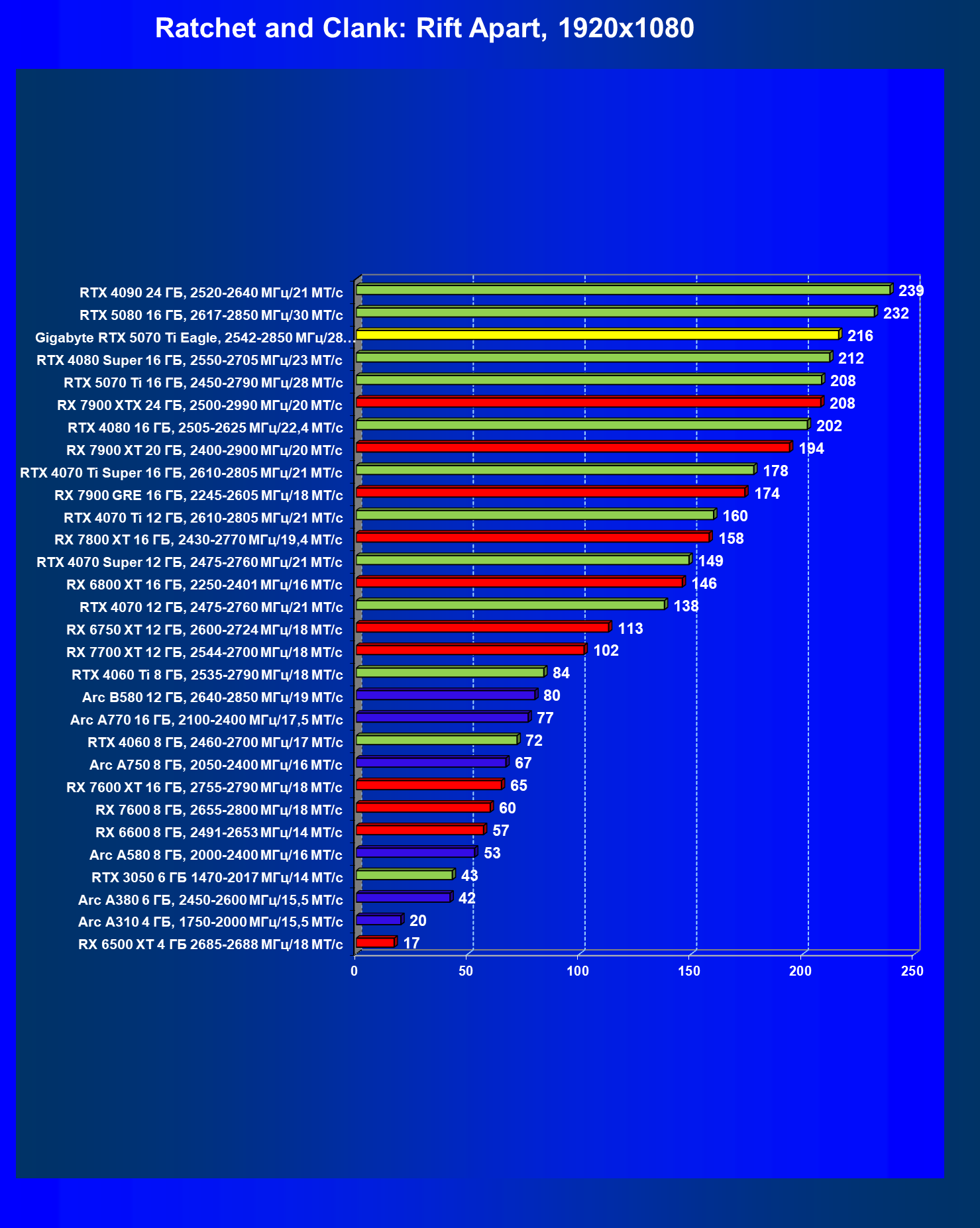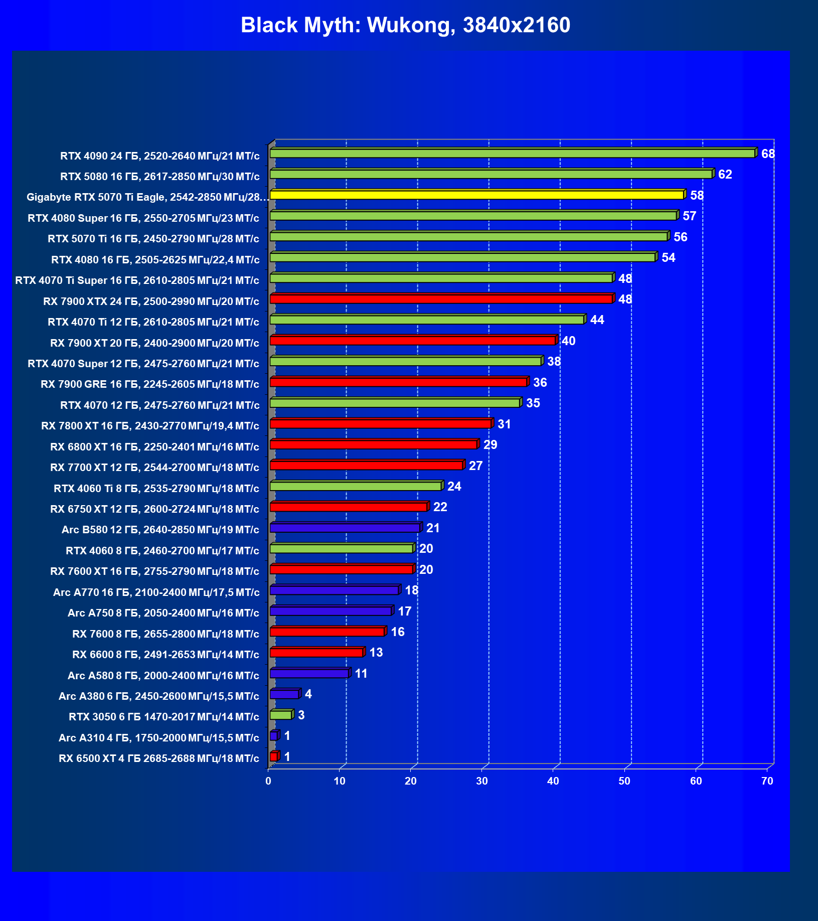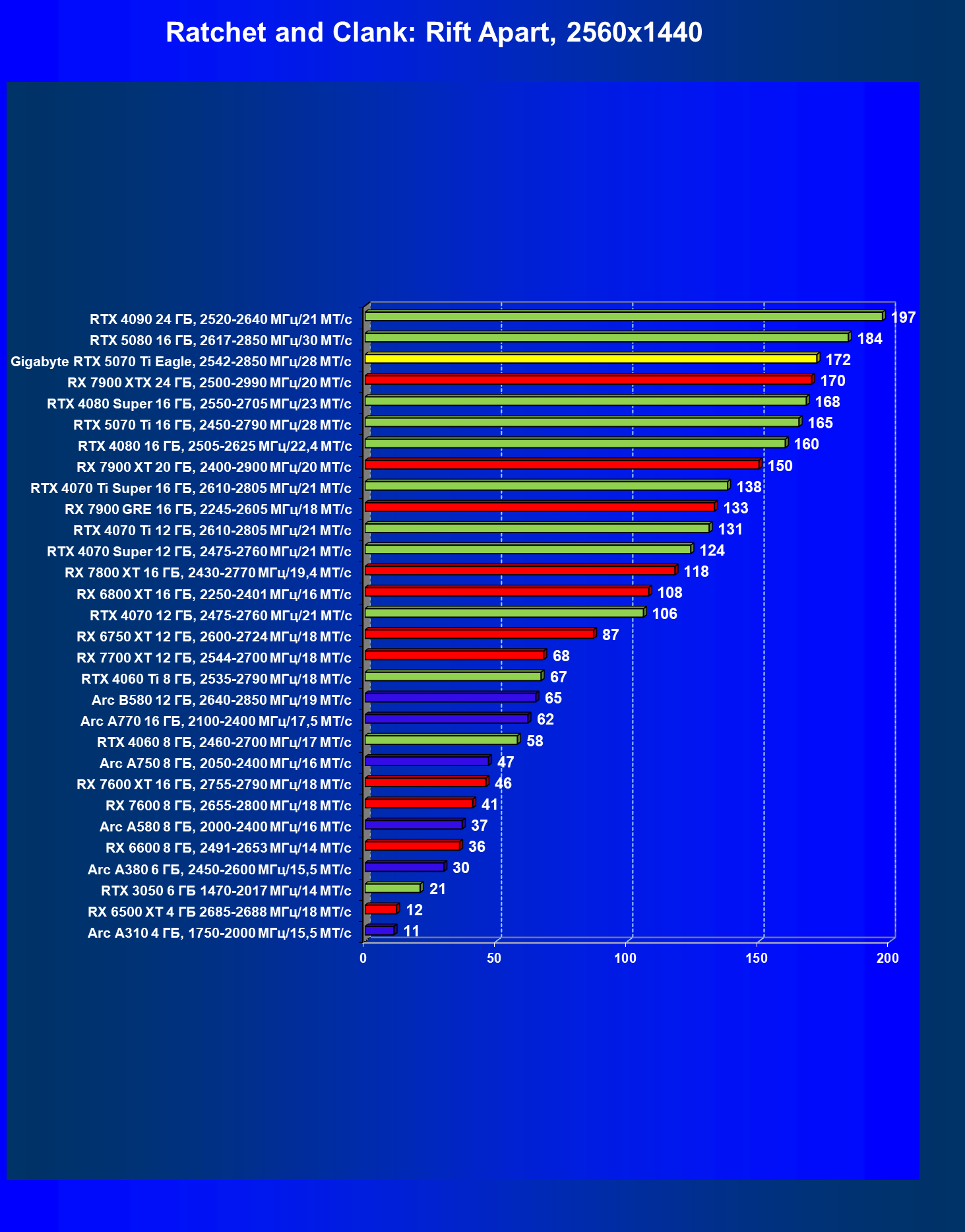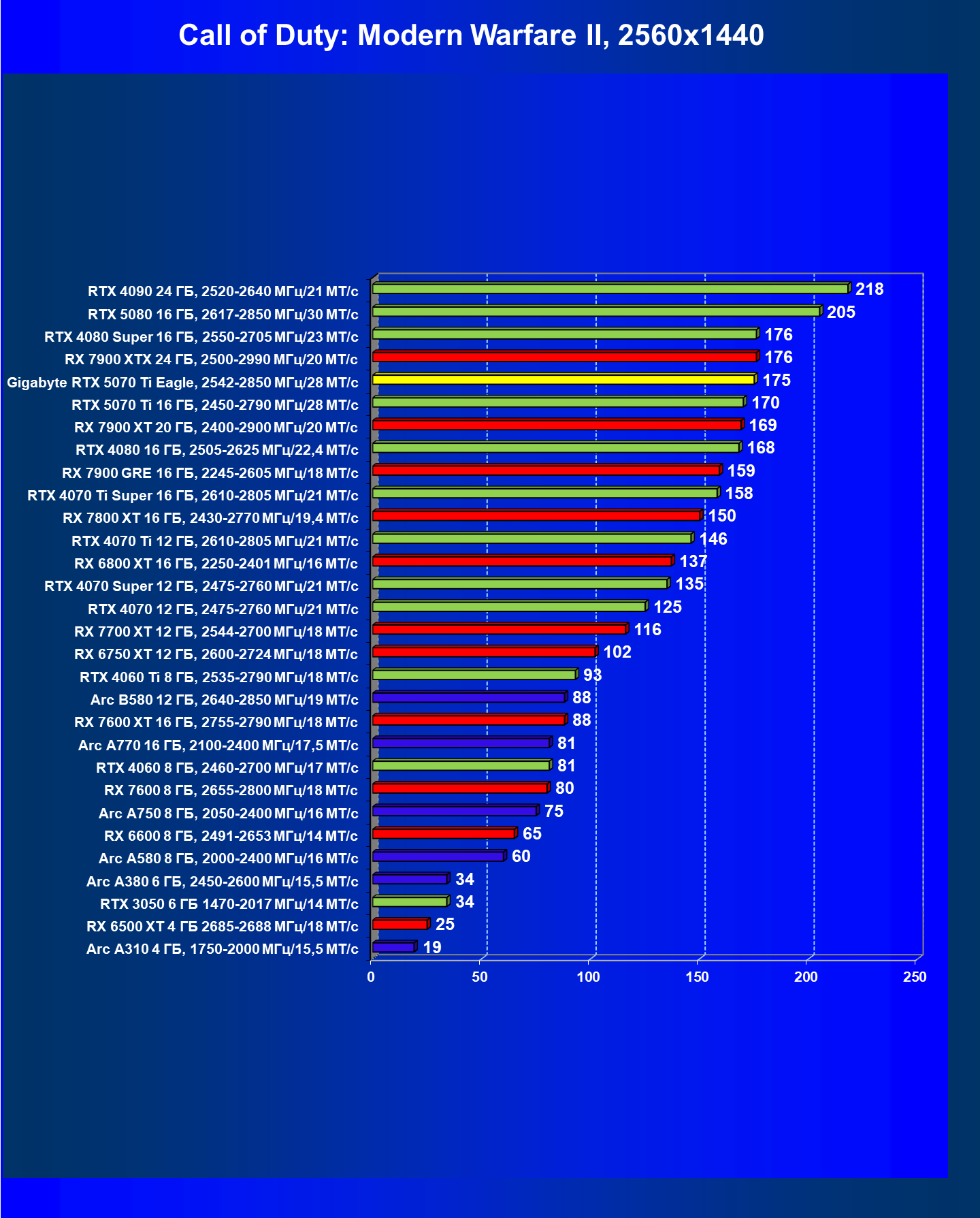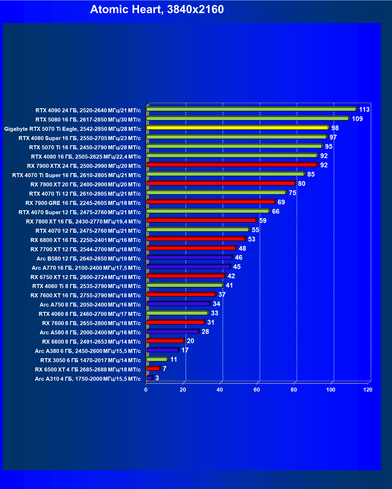 | 01 | Gigabyte GeForce RTX 5070 Ti Eagle, 2542—2850 МГц/28 МТ/с | 968 | 12388 | 128 000 |