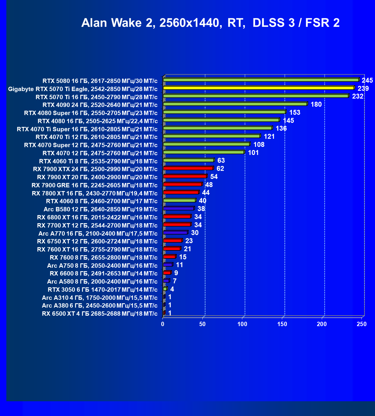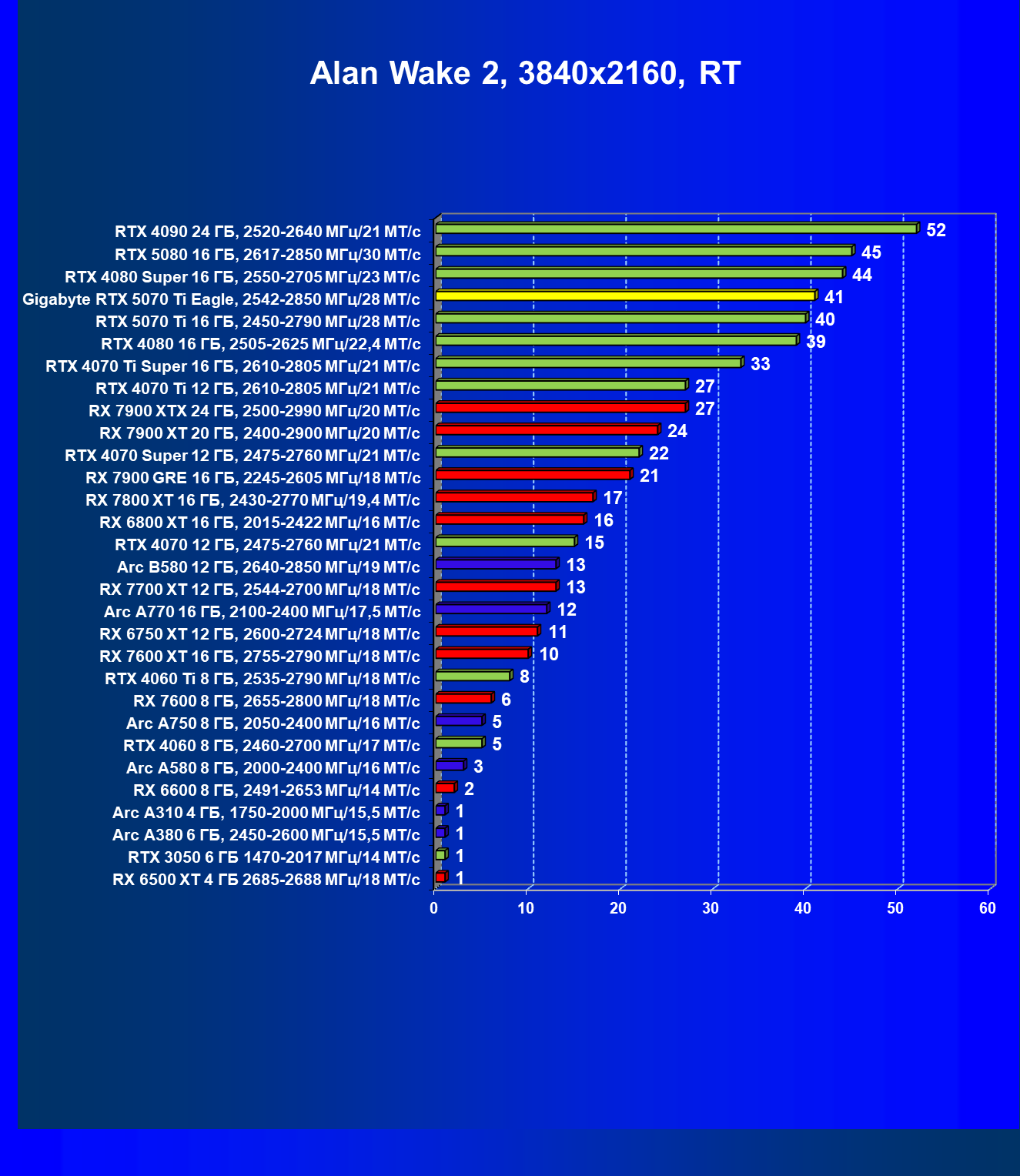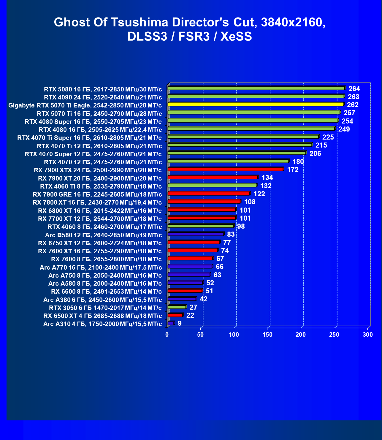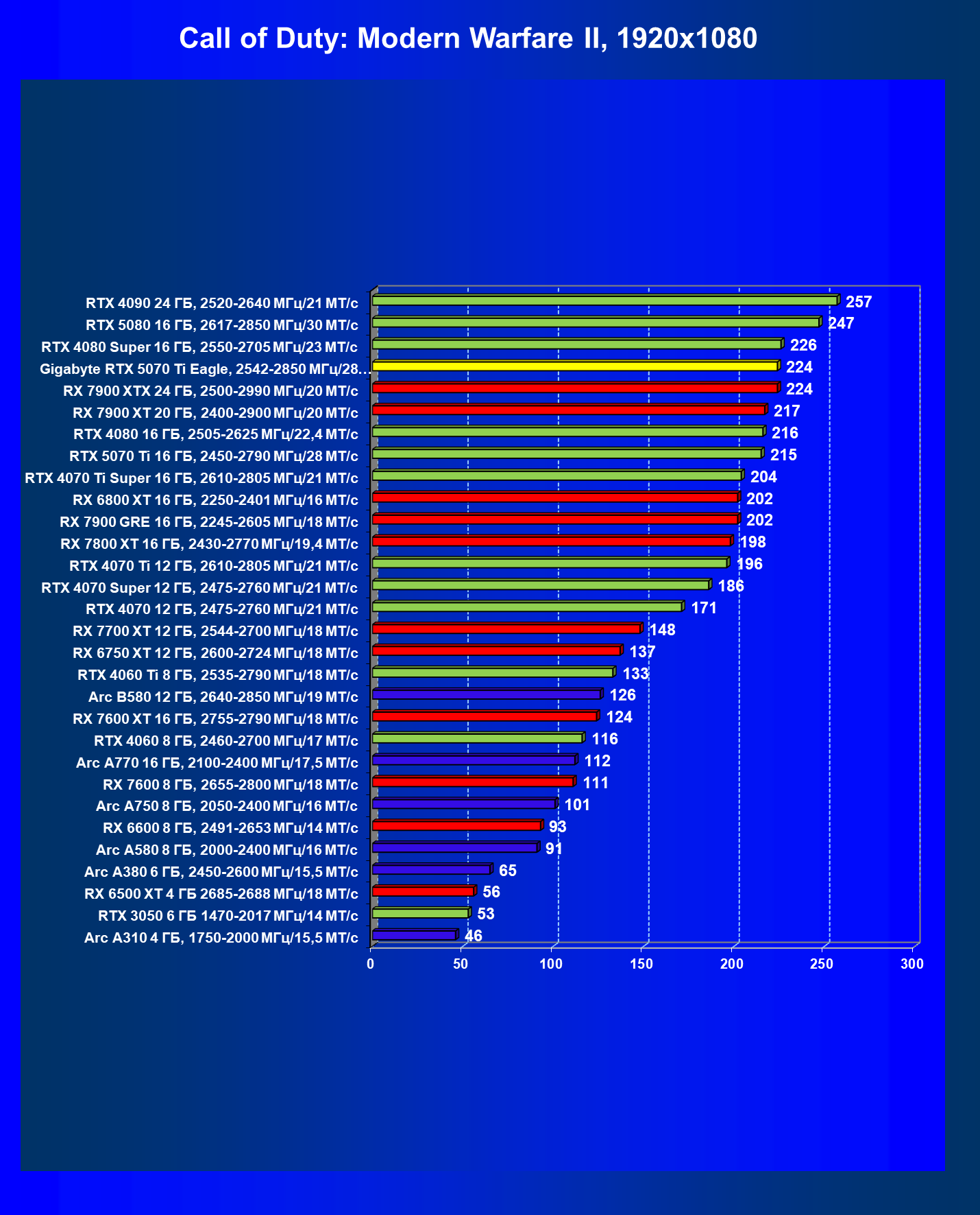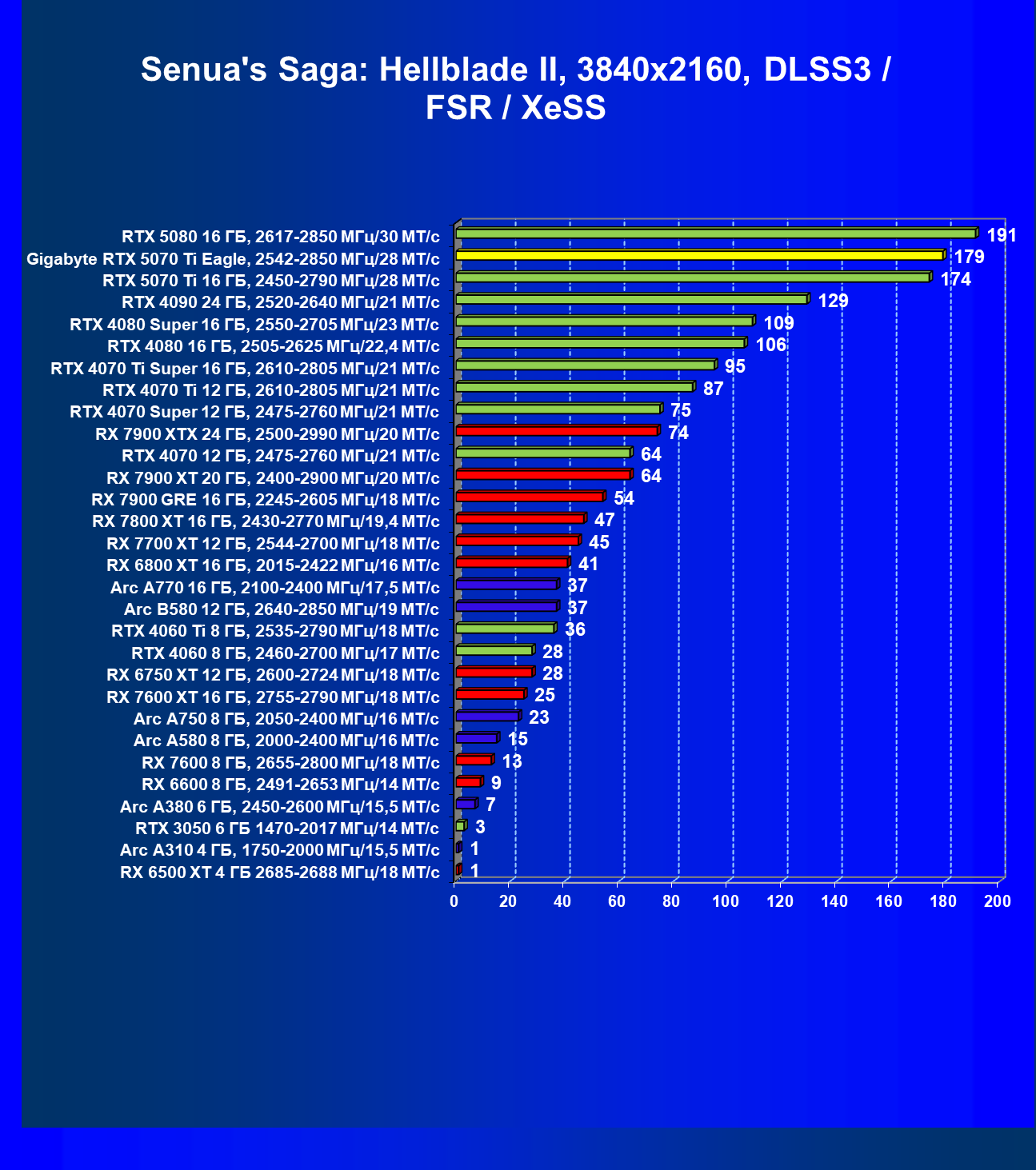 | 01 | Gigabyte GeForce RTX 5070 Ti Eagle, 2542—2850 МГц/28 МТ/с | 968 | 12388 | 128 000 |