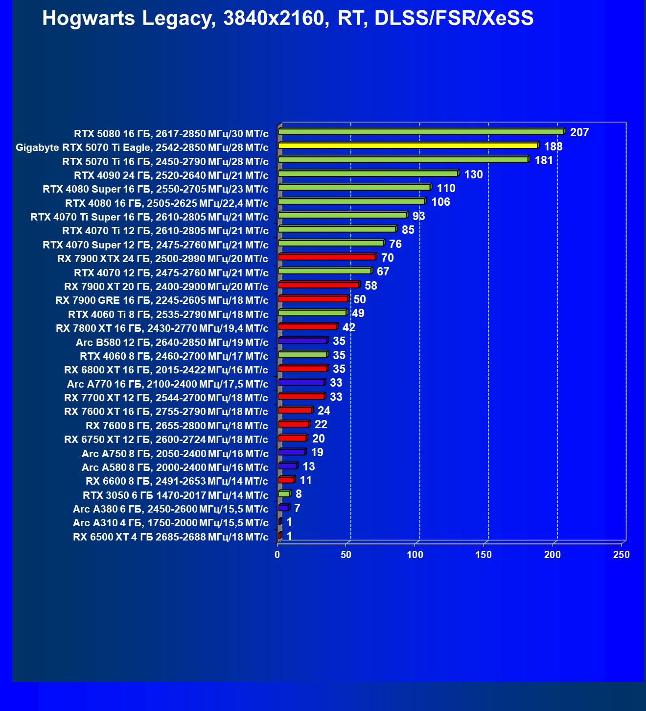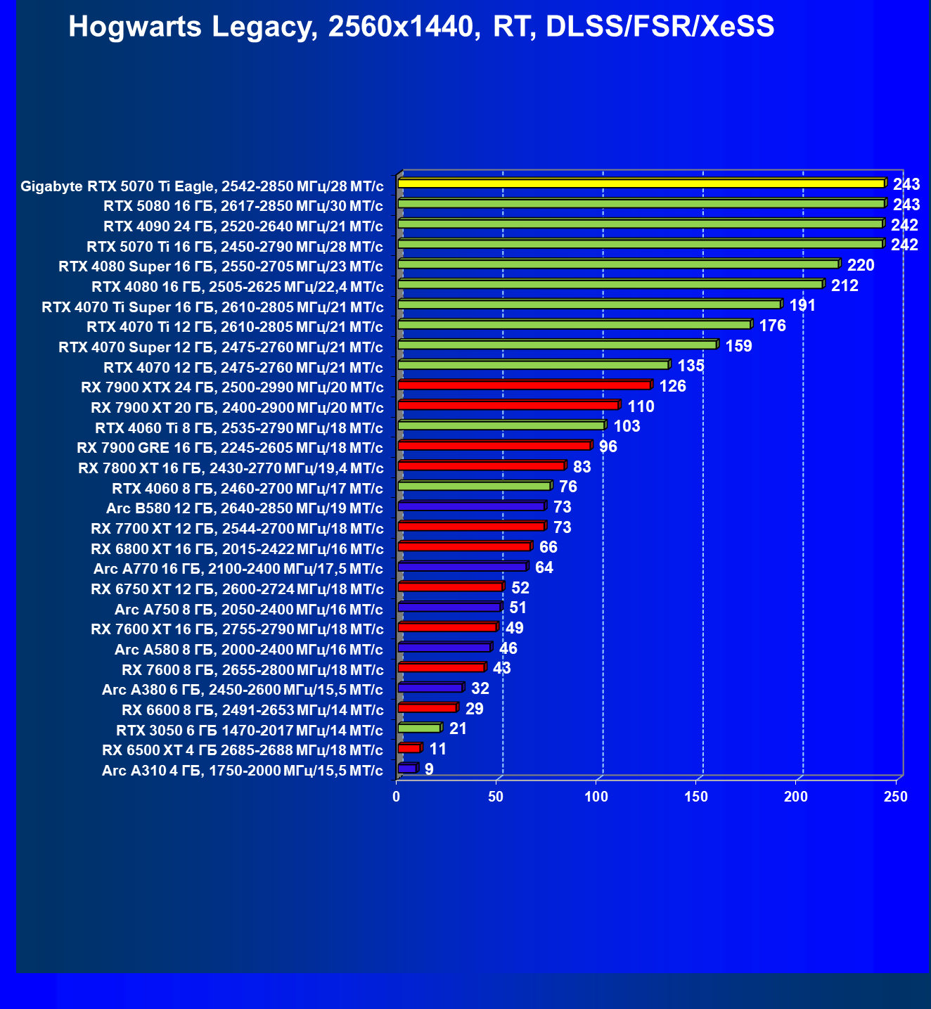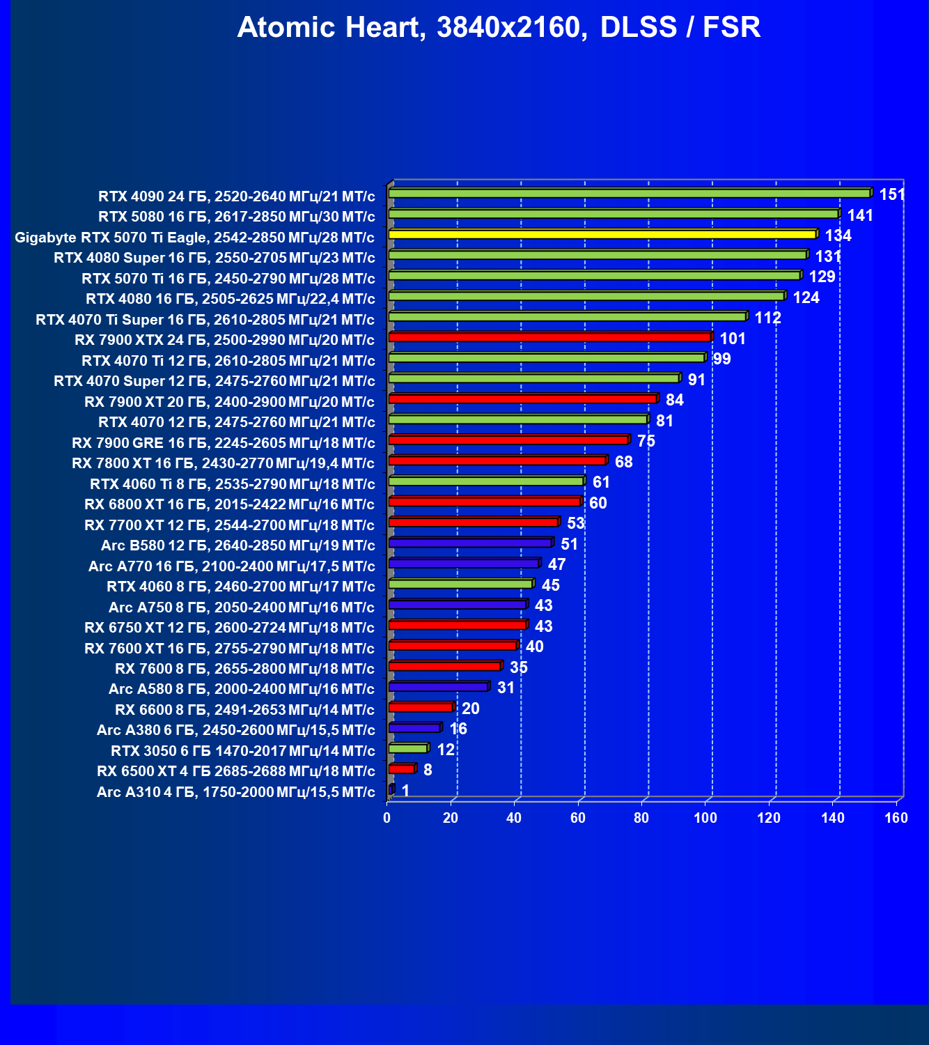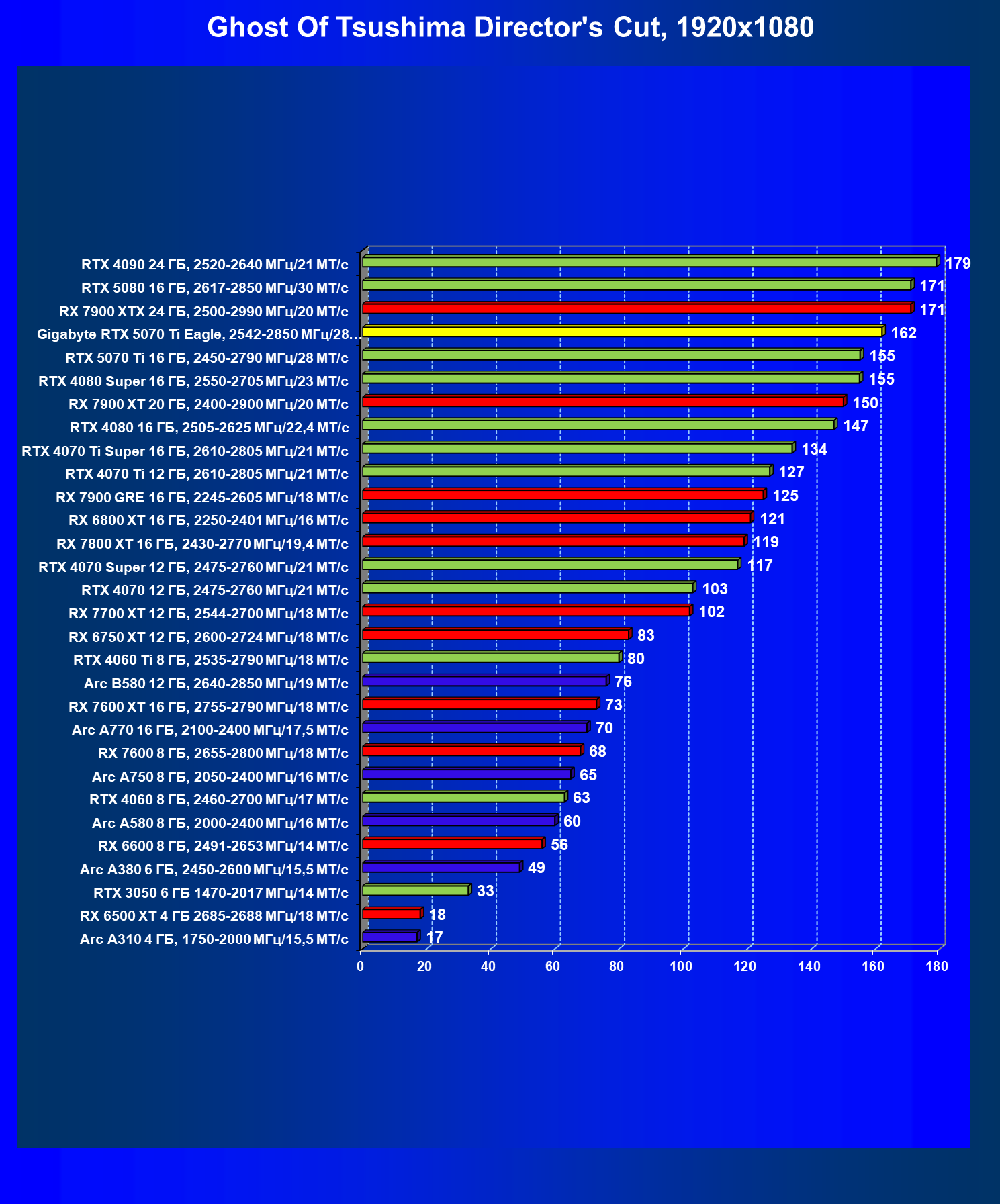| 01 | Gigabyte GeForce RTX 5070 Ti Eagle, 2542—2850 МГц/28 МТ/с | 968 | 12388 | 128 000 |