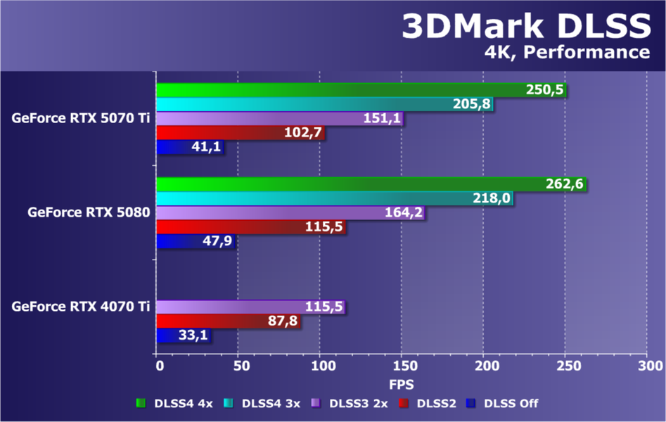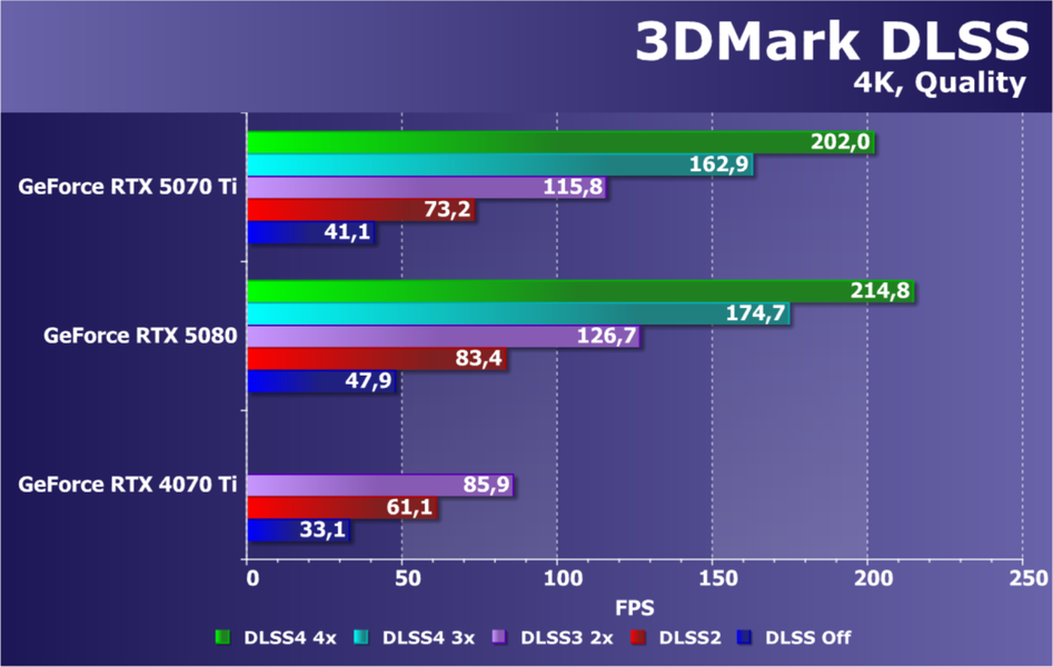 Мы уже подробно рассказали про особенности архитектуры Blackwell, в том числе сделав акцент на новой технологии мультикадровой генерации (MFG). И наши тесты с использованием технологии DLSS 4, особенно при генерации трех и более кадров на основе разных моделей ИИ, показывают, что в таких условиях GeForce RTX 5070 Ti не только легко обходит свой аналог из предыдущего поколения, но и может догнать флагманскую модель того поколения GeForce RTX 4090.