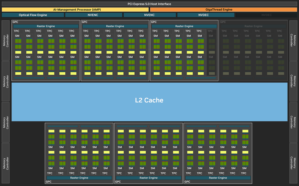 Модификация GB203-300-A1 для GeForce RTX 5070 Ti имеет отключенный целый кластер GPC и еще один кластер TPC в одном из шести оставшихся GPC — все они затемнены на диаграмме. Полный чип GB203 в составе GeForce RTX 5080 имеет 7 кластеров GPC и 42 TPC, 84 мультипроцессоров SM и восемь 32-битных контроллеров памяти. И всего в полном GPU содержится 10752 CUDA-ядер, 84 RT-ядра, 336 тензорных ядра, 336 текстурных блоков TMU и 112 блоков ROP. По кэшу GB203 включает 10752 КБ L1-кэша, 21504 КБ регистрового файла и 64 МБ L2-кэша. В случае модификации GB203-300-A1 активными остались только 6 GPC, 35 TPC и 70 мультипроцессоров SM, что дает общее количество 8960 CUDA-ядер, 280 блоков TMU, 280 тензорных ядер и 70 RT-ядер. По количеству блоков ROP урезание несколько меньше — их осталось 96 штук (есть еще бракованные варианты с 88 активными блоками, но они довольно редки). Объем L1-кэша снизился до 8960 КБ, а L2-кэш — до 48 МБ. Эта модификация графического процессора работает на базовой частоте 2300 МГц, которая увеличивается в играх до 2452 МГц.