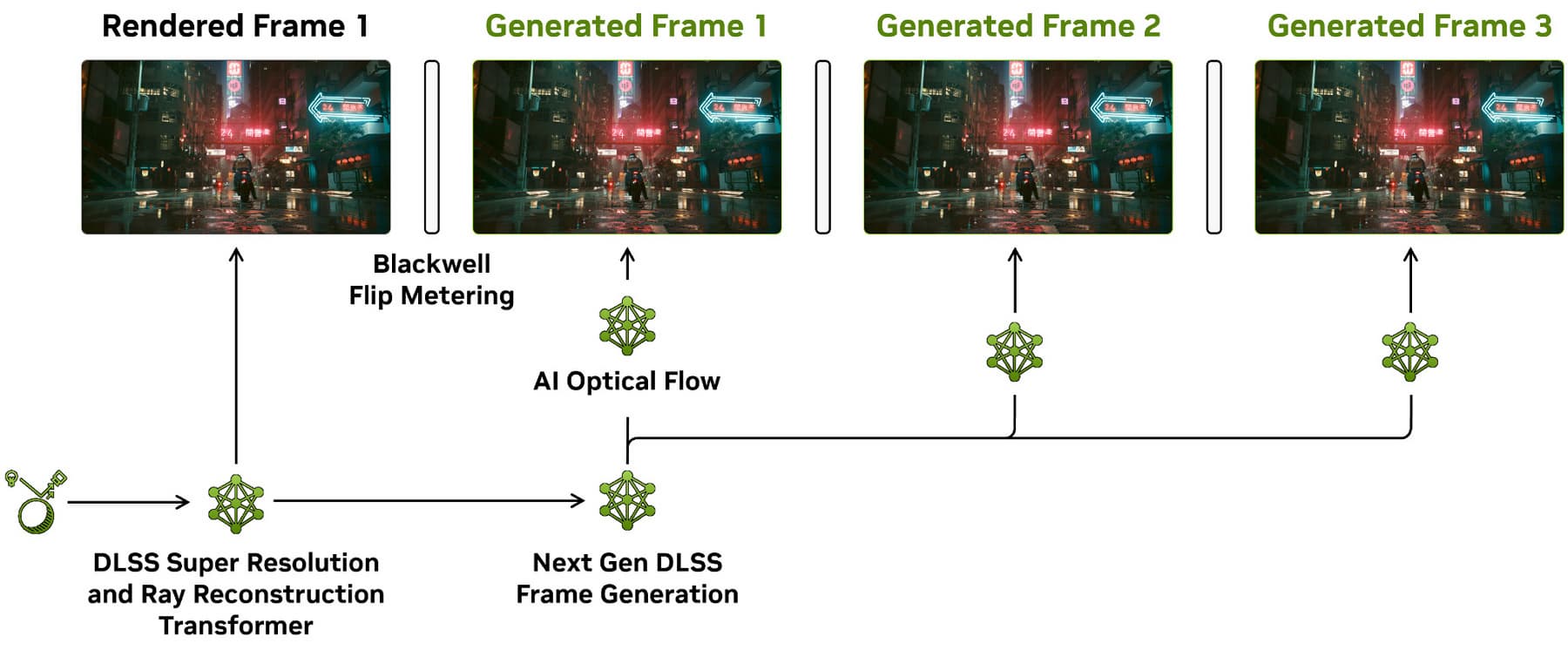 Невозможно не рассказать в очередной раз и про новые технологии DLSS 4 — именно во множественном числе, так как их там несколько. Если в решениях Ada Lovelace появилась генерация одного промежуточного кадра, то в новом поколении Blackwell таких кадров нейросеть может сгенерировать до трех дополнительных — это технология Multi Frame Generation (MFG). Алгоритм генерации кадров изменился и теперь выполняется быстрее, расходуя меньше видеопамяти, он позволяет добиться в несколько раз большей частоты кадров по сравнению с традиционным рендерингом. Также очень важно появление новых моделей ИИ на основе трансформера — они заменяют предыдущие модели генеративных нейросетей при масштабировании разрешения и реконструкции лучей при трассировке. Причем, последние возможности доступны и на решениях старых серий GeForce RTX 40 и GeForce RTX 30, а совершенно новой для GeForce RTX 50 является только генерация сразу нескольких кадров.