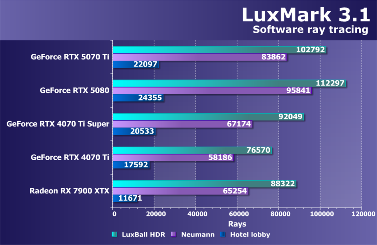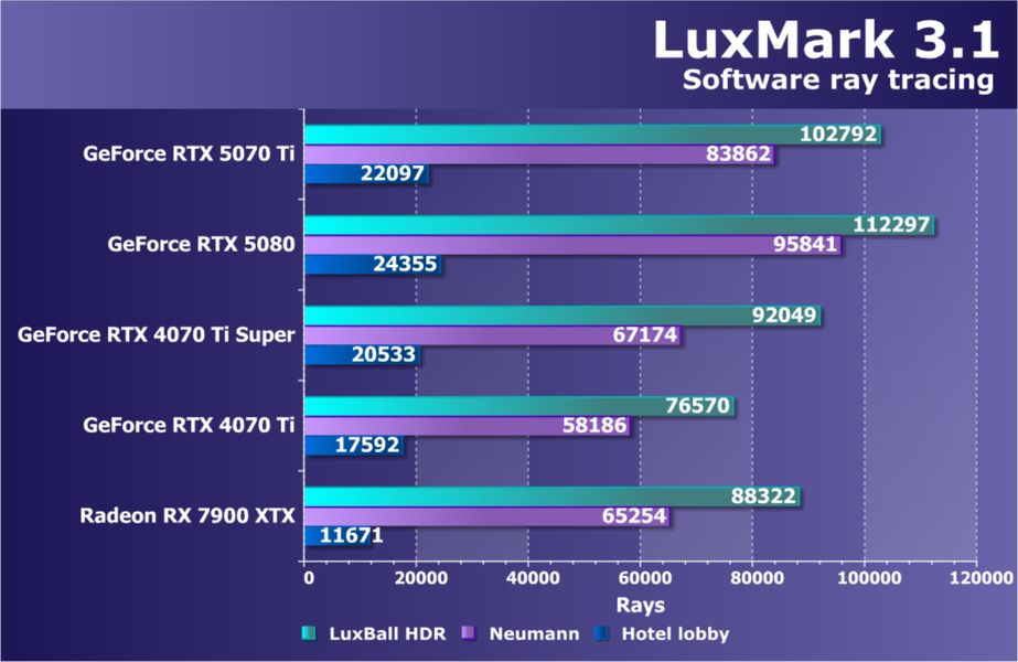 | RTX 5070 Ti 16 ГБ (DLSS 3), 2450—2790 МГц/28 МТ/с | 744 | 9301 | 125 000 | |