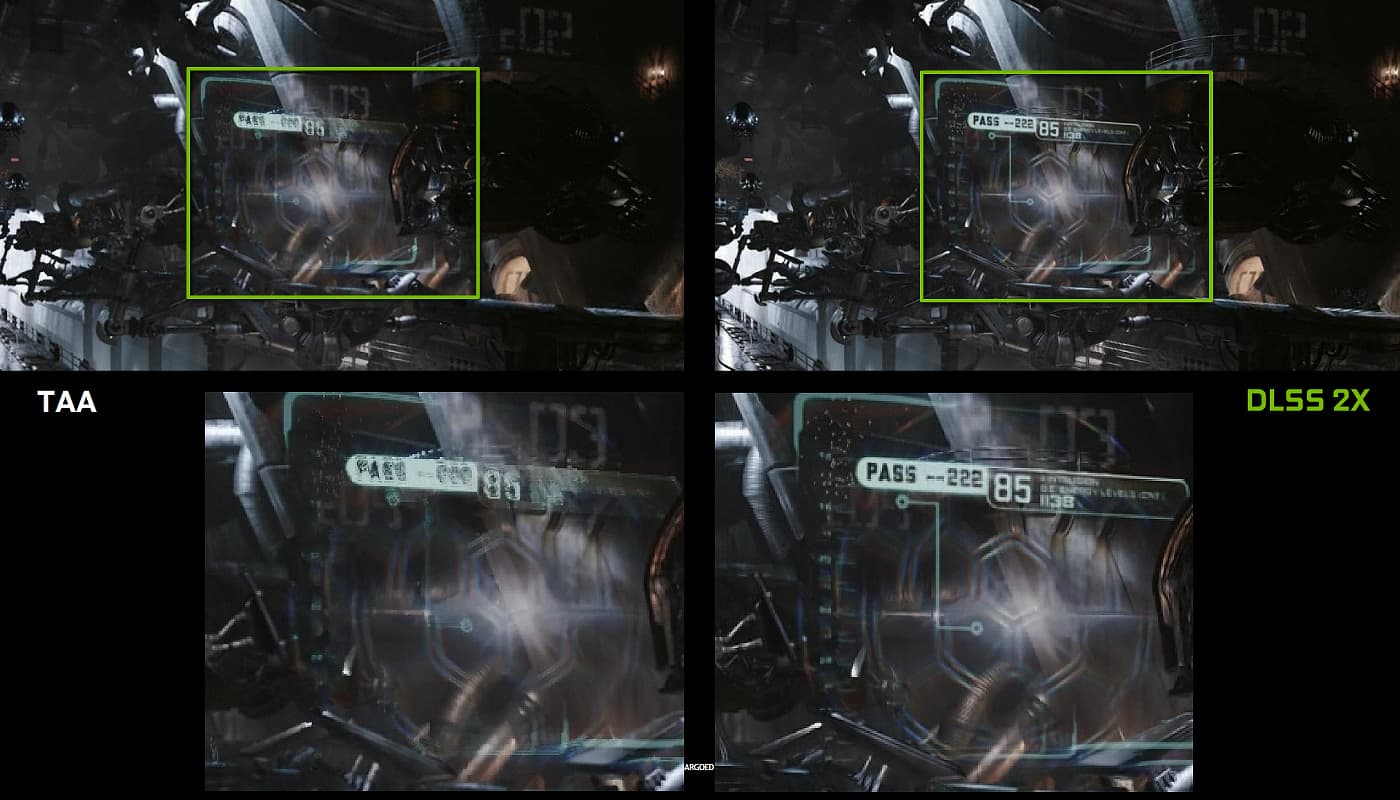 То есть, нейросеть на примере тысяч хорошо сглаженных изображений учат «додумывать» пиксели, делая из грубой картинки сглаженную, и она успешно делает это затем уже для любого изображения из игры. И такой метод работает значительно быстрее любого традиционного метода с аналогичным качеством. В результате игрок получает четкие изображения вдвое быстрее, чем GPU предыдущего поколения с использованием традиционных методов сглаживания типа TAA. Да еще и с лучшим качеством, если присмотреться к приведенным выше примерам.