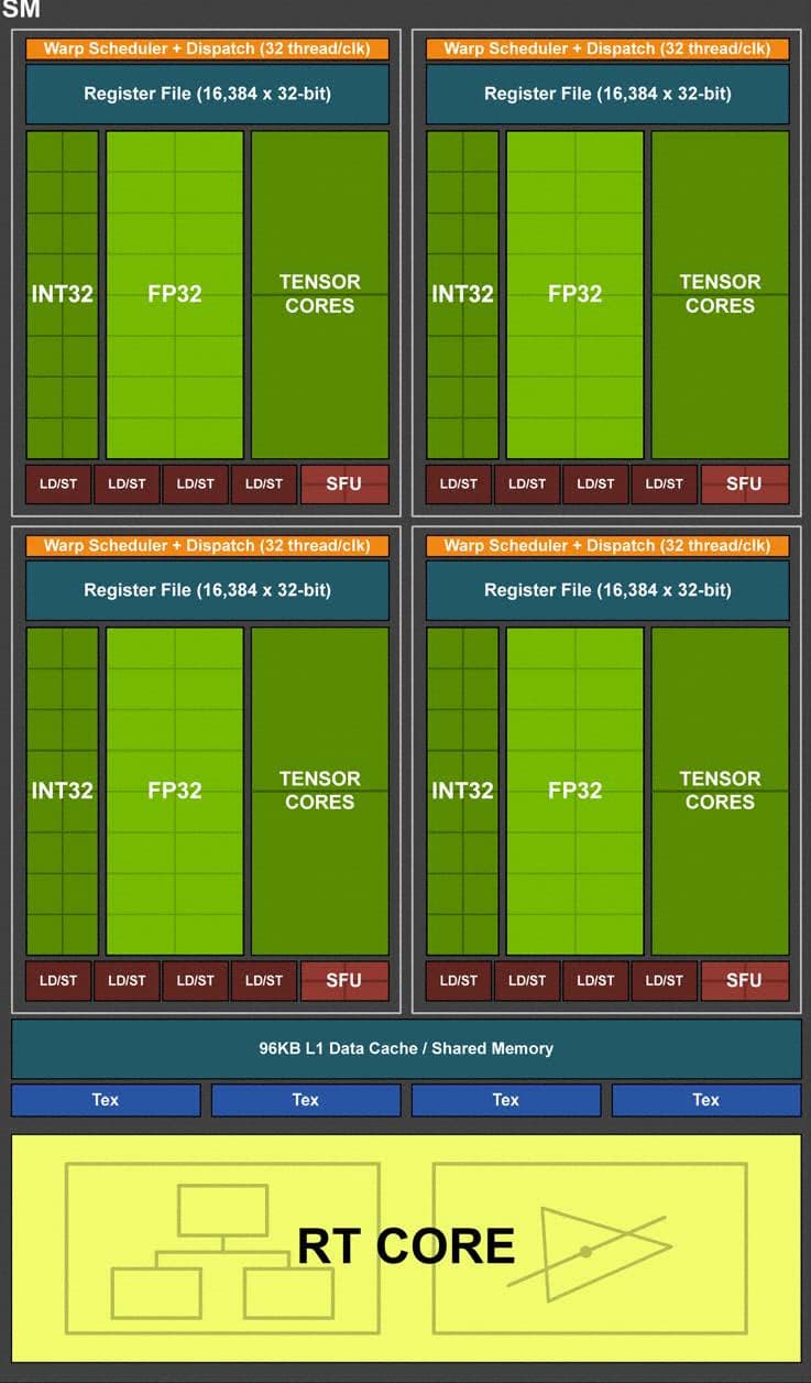 Теперь же в ядра были внесены изменения аналогично Volta, которые позволяют исполнять INT32- и FP32-операции параллельно и независимо. По данным Nvidia, типичные игровые шейдеры, помимо операций с плавающей запятой, в среднем используют при исполнении и около 36% дополнительных целочисленных операций (адресация, специальные функции и т. п.), так что уже одно это нововведение способно серьезно повысить производительность во всех играх, а не только с трассировкой лучей и DLSS.
