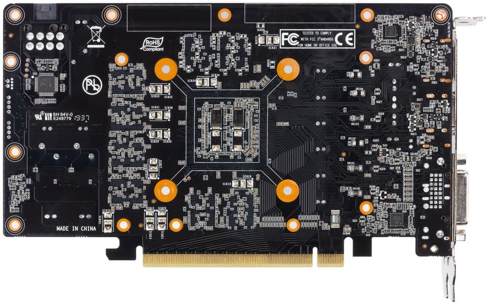 Здесь используется один большой пластинчатый радиатор, его пересекают две тепловые трубки для улучшения разноса тепла по ребрам. Трубки припаяны к основанию, которое и прижимается к GPU. Для охлаждения микросхем памяти и силовых элементов используется то же основание. На обороте карты установлена толстая пластина, служащая исключительно элементом жесткости. В итоге система охлаждения видеокарты укладывается по толщине в 2 слота.