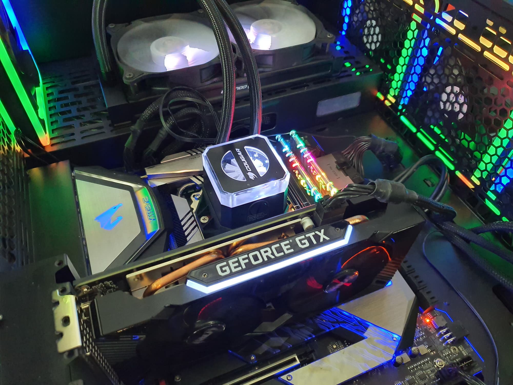 Поверх радиатора установлен кожух с двумя вентиляторами 90 мм, работающими на одинаковой частоте. Вентиляторы не останавливаются даже в простое.