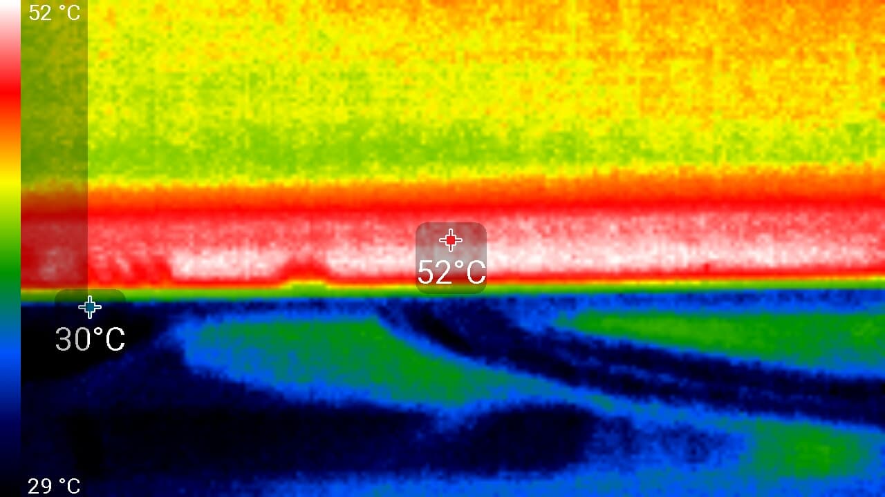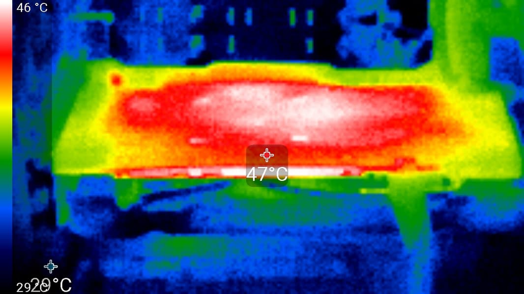 Максимальный нагрев — край платы и центральный участок PCB около GPU и силовых преобразователей.