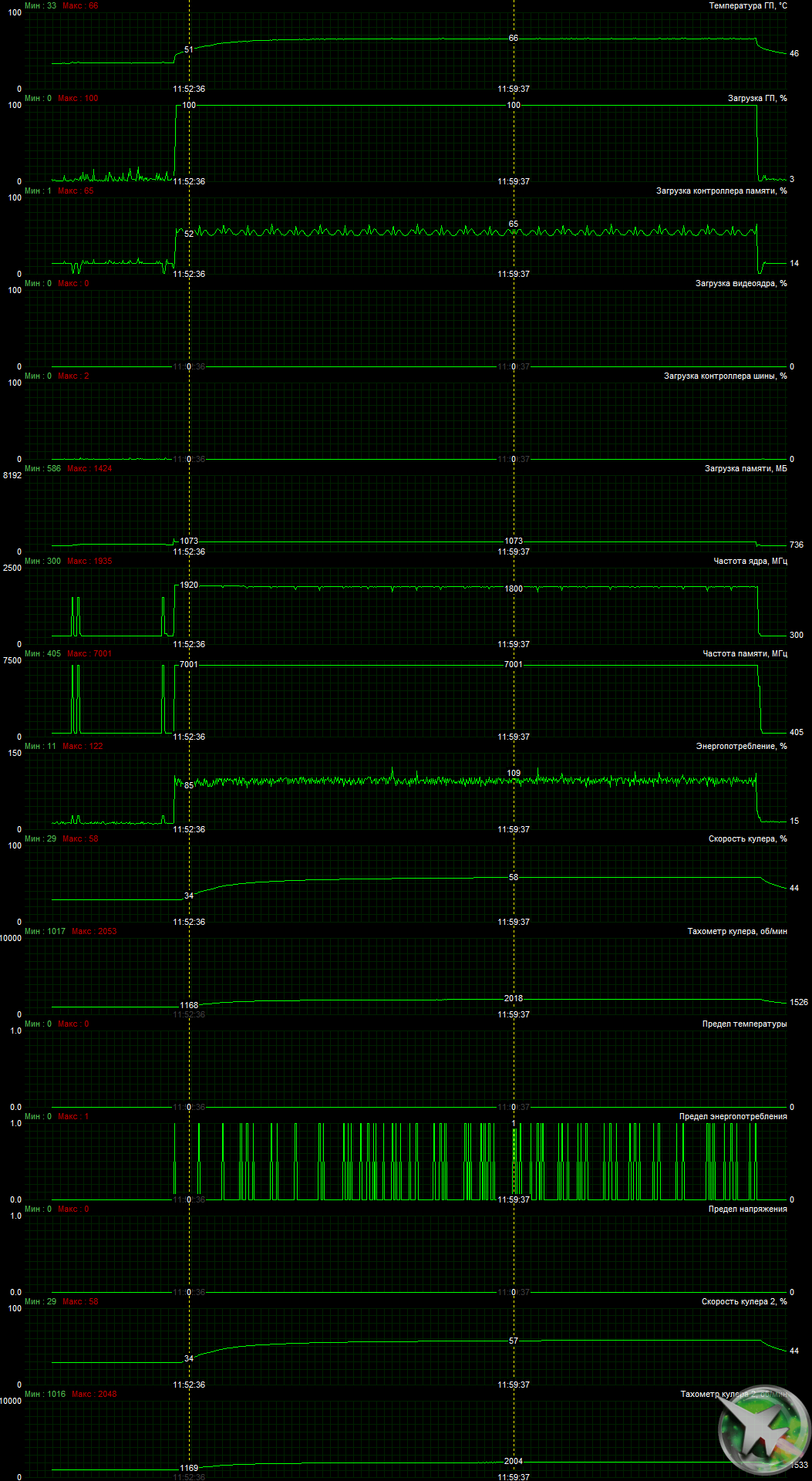 После 6-часового прогона под нагрузкой максимальная температура ядра не превысила 66 градусов, что является хорошим результатом для видеокарты такого уровня.