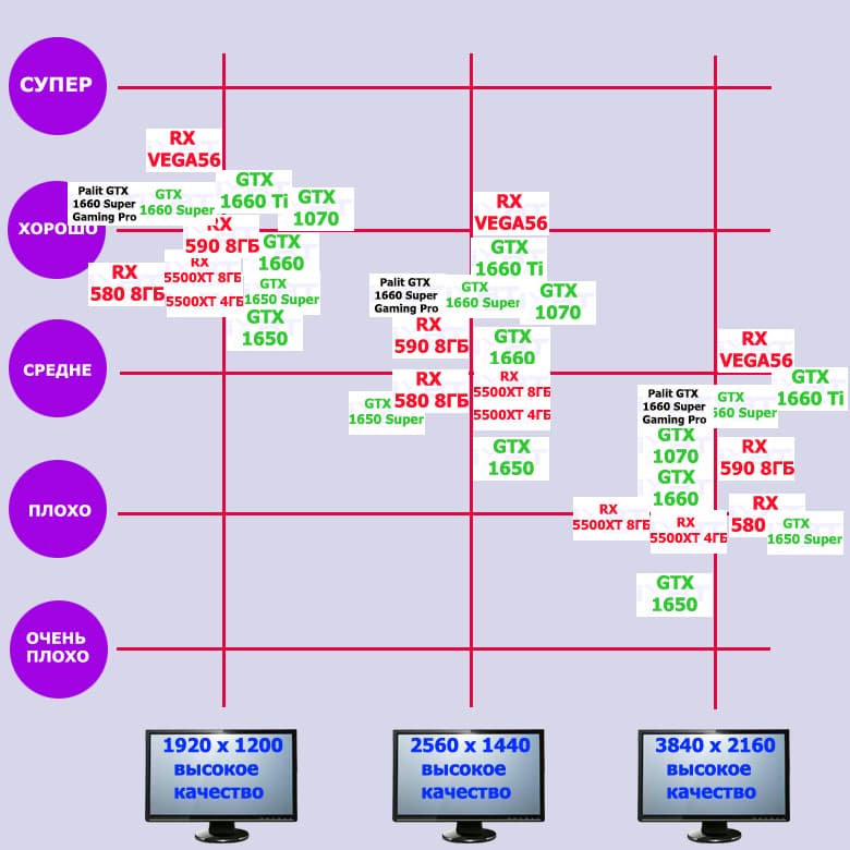 По результатам тестов мы пришли к выводу, что в целом GeForce GTX 1660 Super (как и его чуть более быстрый собрат GTX 1660 Ti) идеально подойдет для игры в разрешении Full HD (1920×1200/1080) при выставлении максимальных настроек качества графики. В некоторые не особо продвинутые по графике игры он позволит поиграть и в разрешении 2.5К. По производительности GTX 1660 Super «обитает» где-то посредине между конкурентами в лице Radeon RX Vega56 и RX 590.