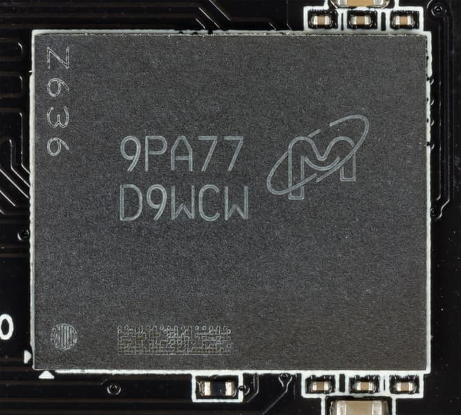 Карта имеет 6 ГБ памяти GDDR6 SDRAM, размещенной в 6 микросхемах по 8 Гбит на лицевой стороне PCB. Микросхемы памяти Micron (GDDR6, MT61K256M32JE-14) рассчитаны на номинальную частоту работы в 3500 (14000) МГц. Расшифровщик кодов на упаковках FBGA находится здесь.