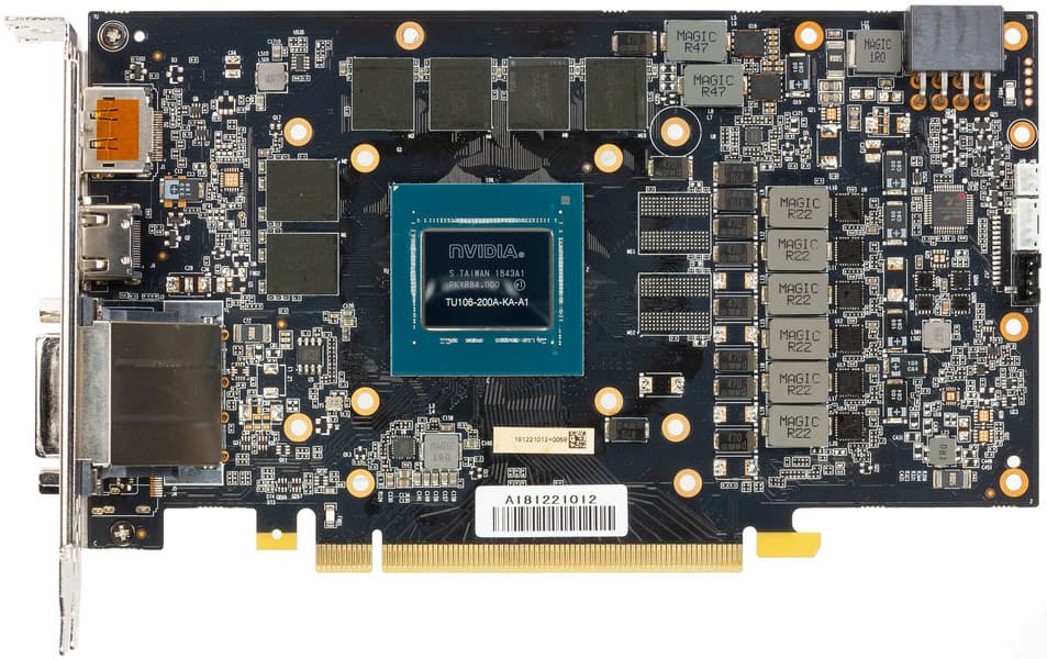 Карта имеет 6 ГБ памяти GDDR6 SDRAM, размещенной в 6 микросхемах по 8 Гбит на лицевой стороне PCB. Микросхемы памяти Micron (GDDR6) рассчитаны на номинальную частоту работы в 3500 (14000) МГц
