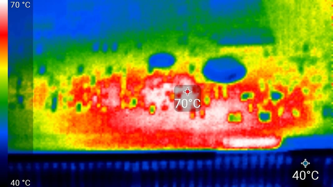 Максимальный нагрев — верхний край оборотной стороны PCB.