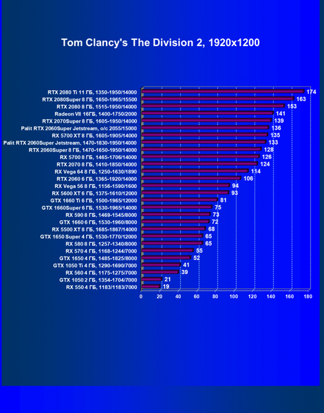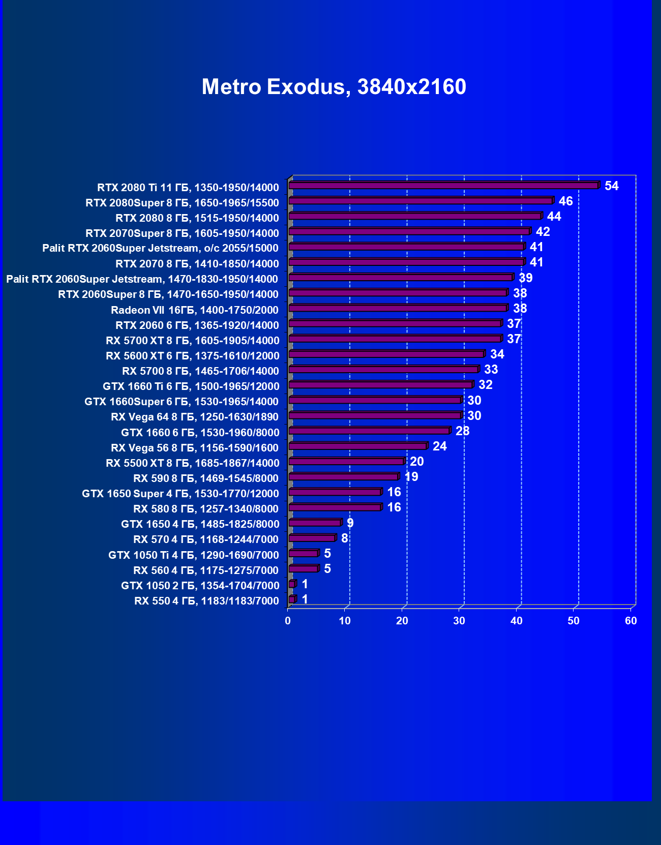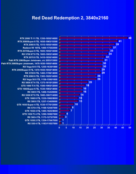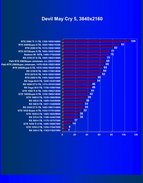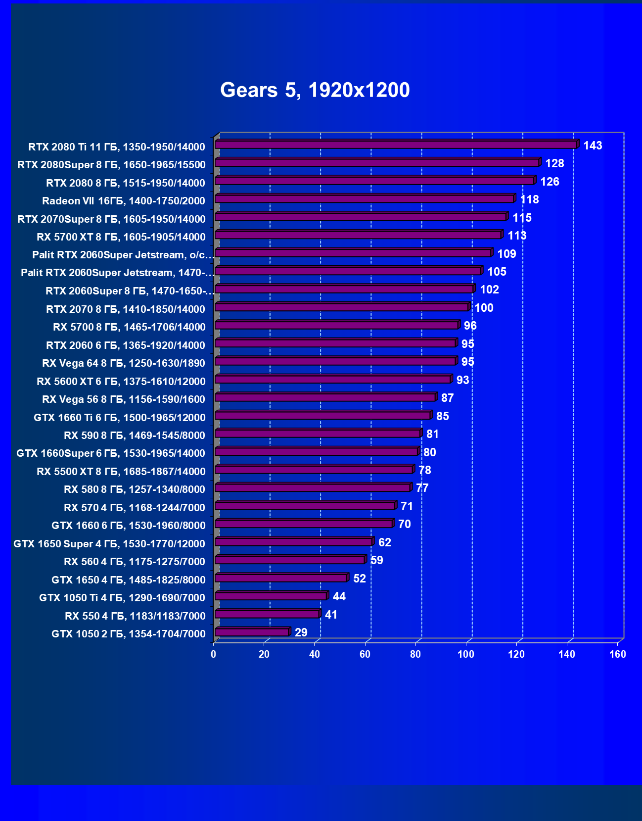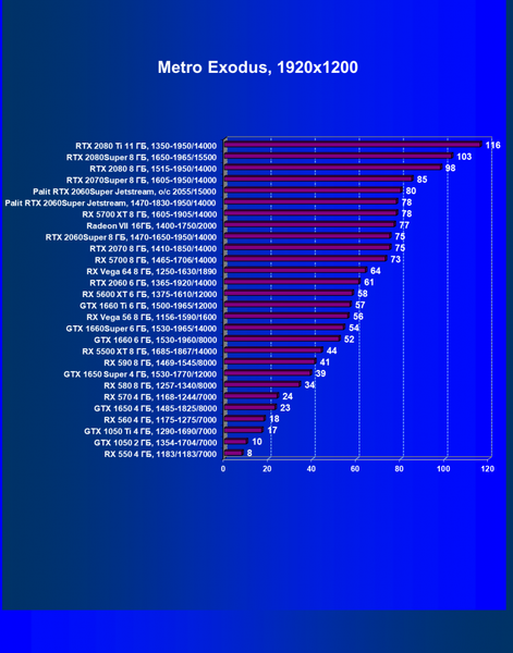 | 08 | RX 5700 XT 8 ГБ, 1605—1905/14000 | 1080 | 348 | 31 000 |