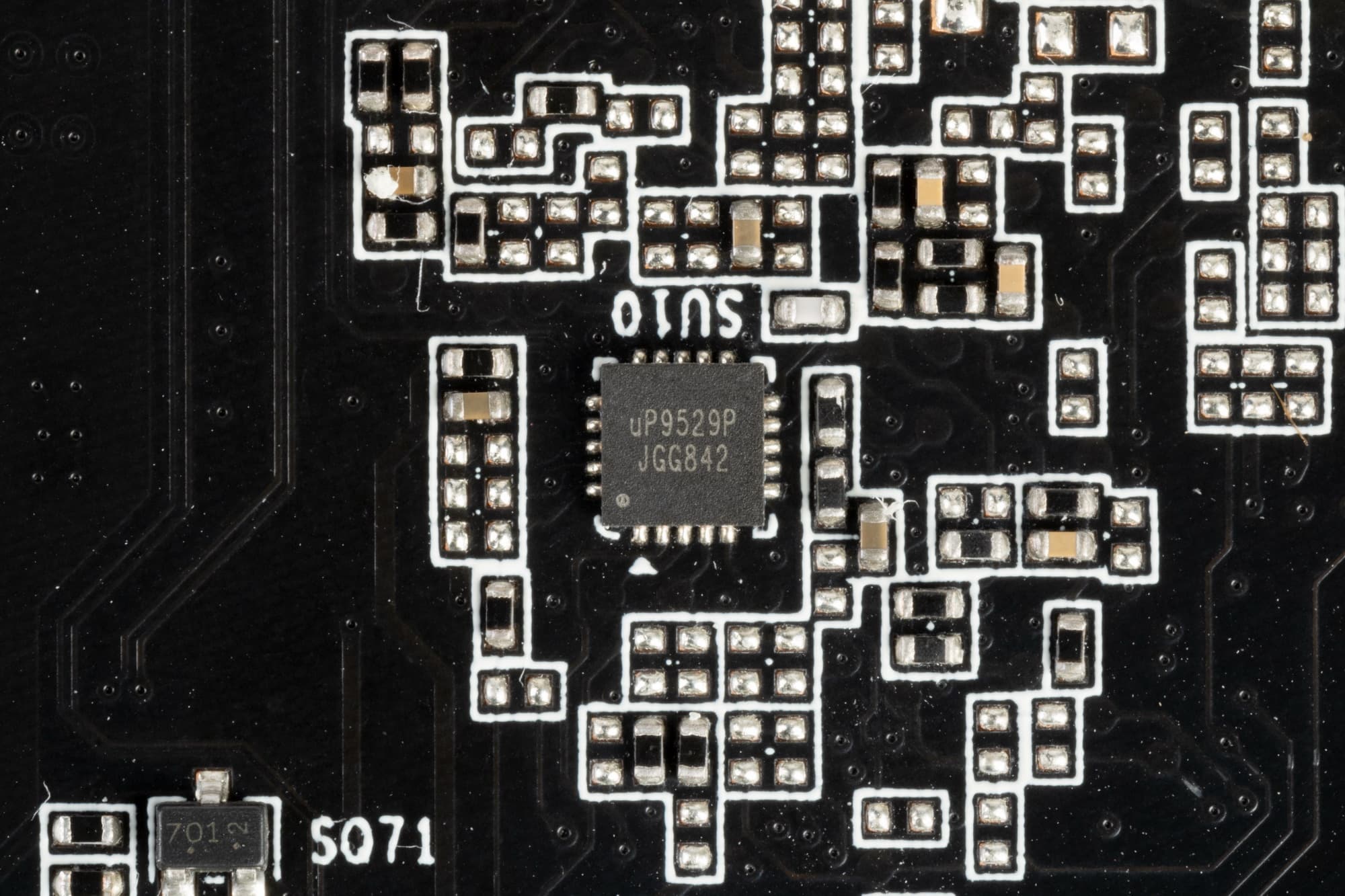 Для управления 2-фазной схемой питания микросхем памяти имеется отдельный контроллер uP9529P (uPI Semiconductor).