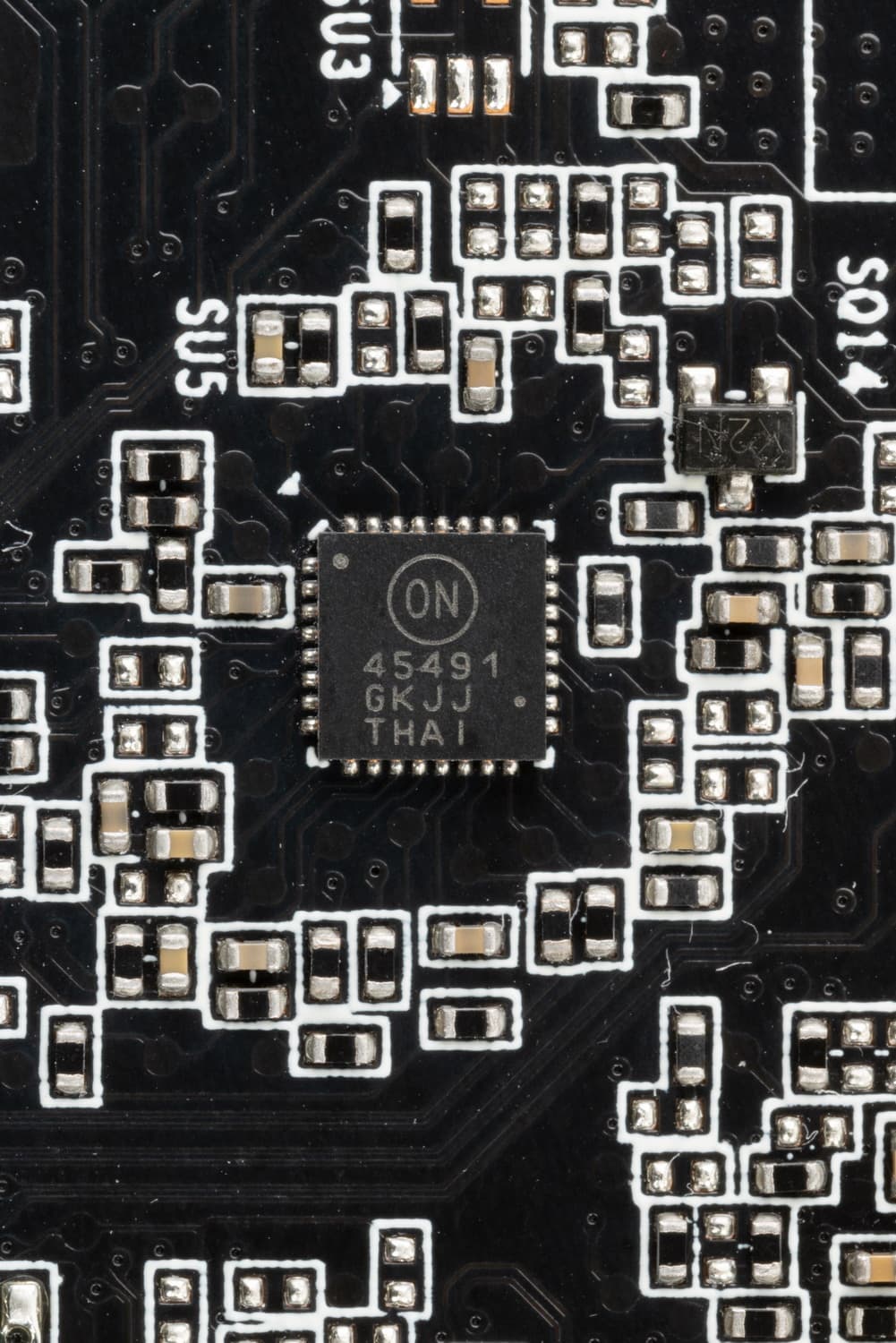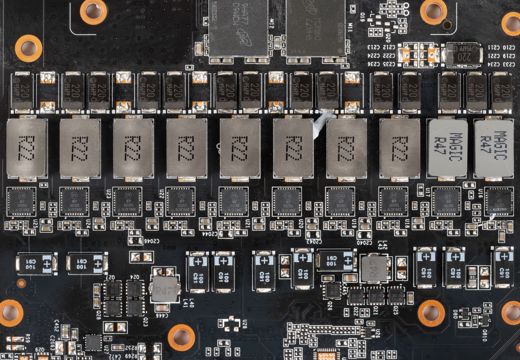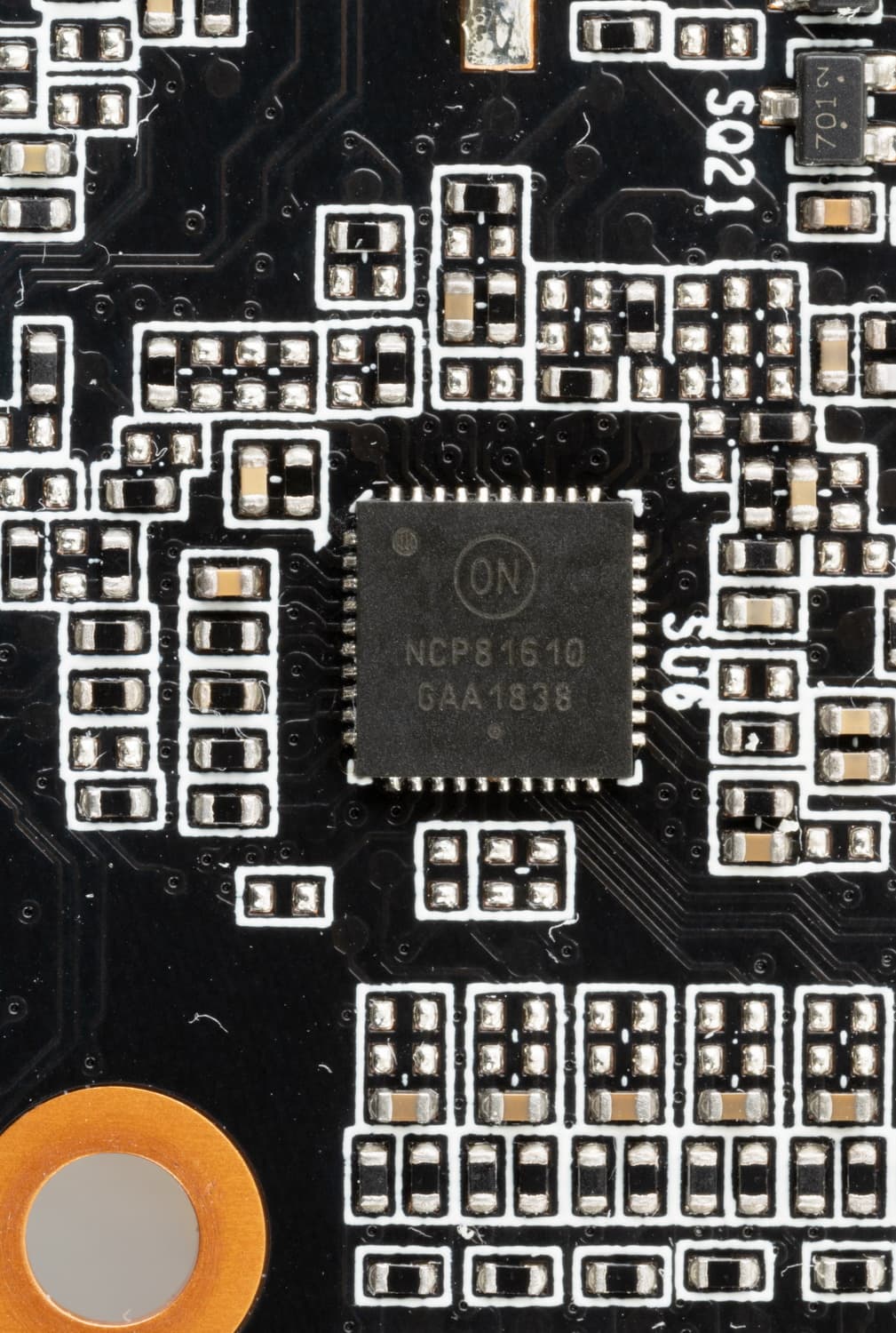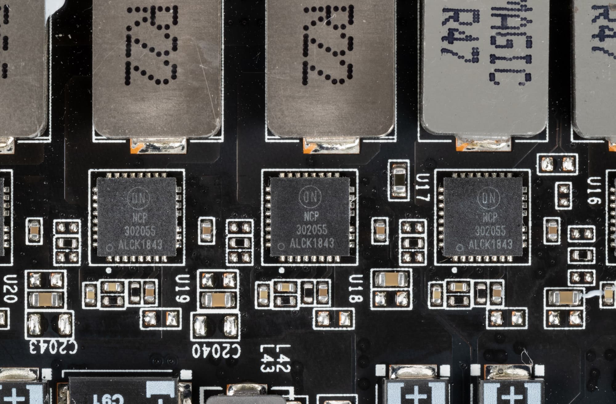 Такая динамическая система управления питанием способна осуществлять мониторинг тока чаще раза в миллисекунду, что дает жесткий контроль над поступающим на ядро питанием и помогает GPU дольше работать на повышенных частотах. Схема питания GPU управляется ШИМ-контроллером NCP81610 (On Semiconductor).