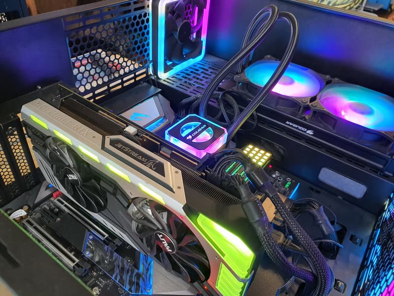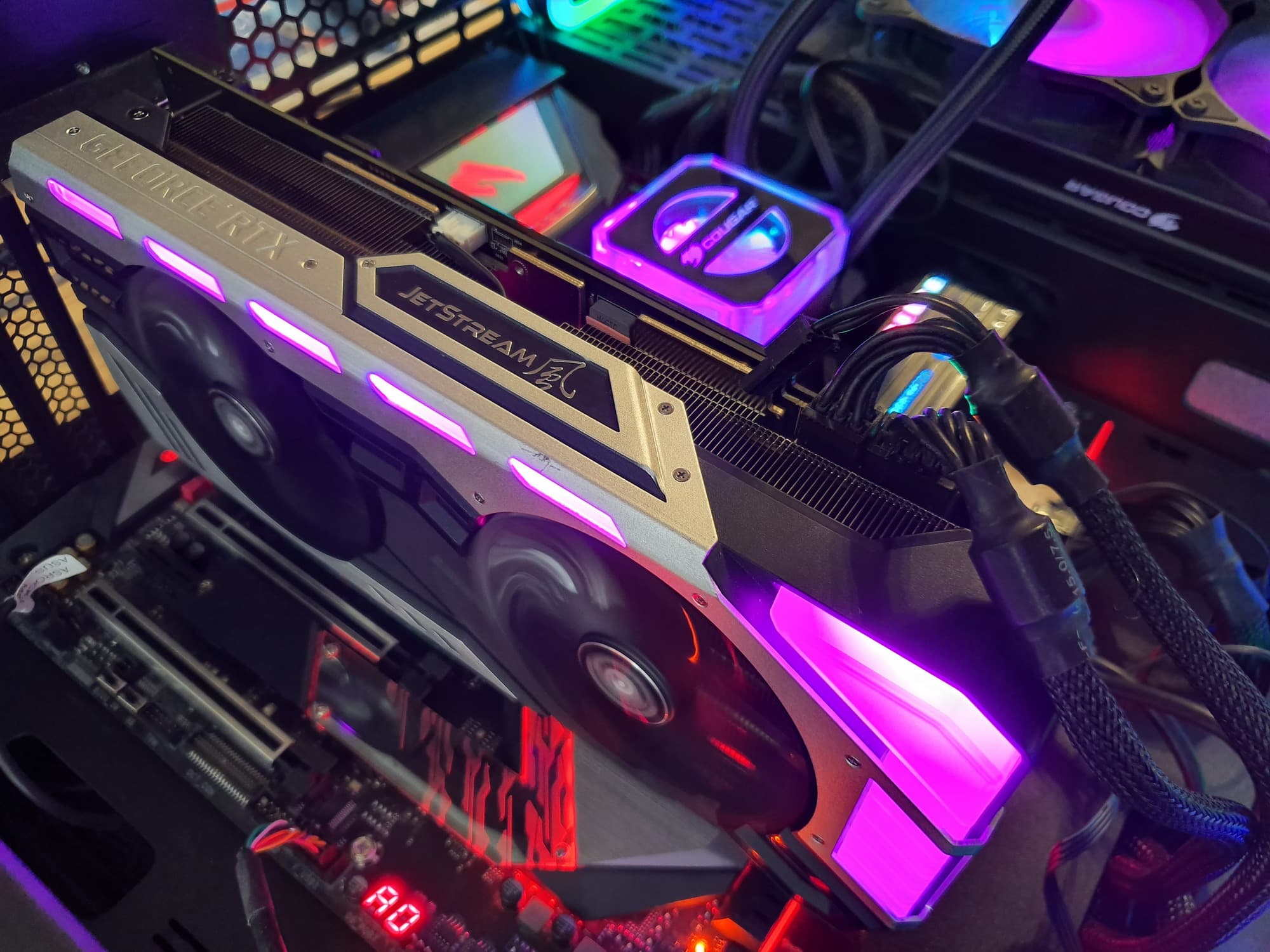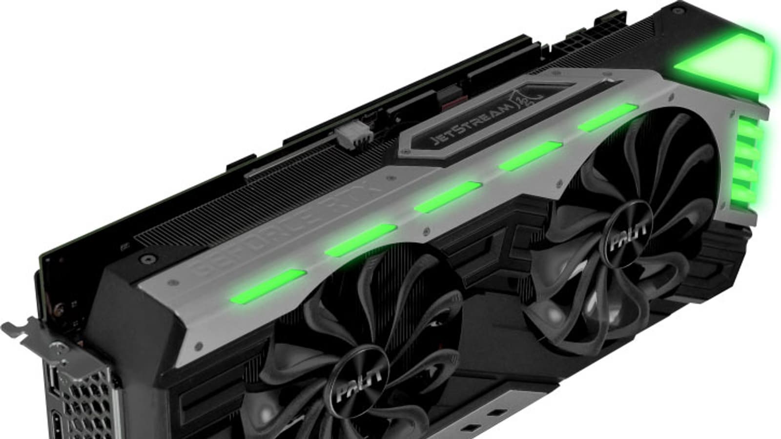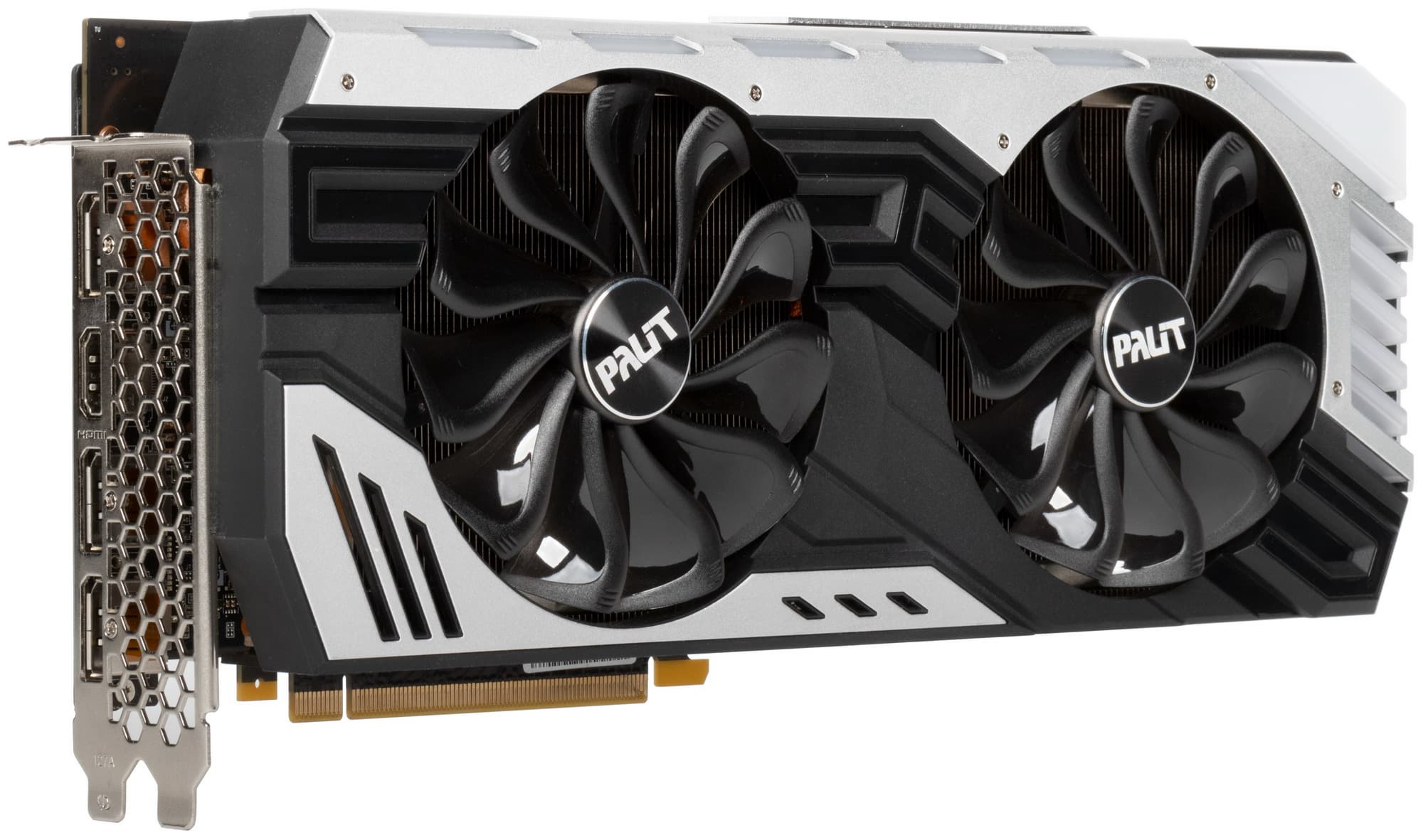 Palit GeForce RTX 2060 Super Jetstream (8 ГБ) — отличный вариант видеоускорителя с ценой в районе 30-35 тысяч рублей для тех, кому важна в первую очередь тихая работа. Размеры здесь принесены в жертву тишине: карта почти 30 см в длину и занимает 3 слота в системном блоке. Любителям подсветки карта Palit также понравится, а если что — подсветку всегда можно отключить.