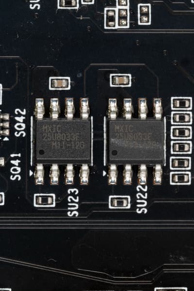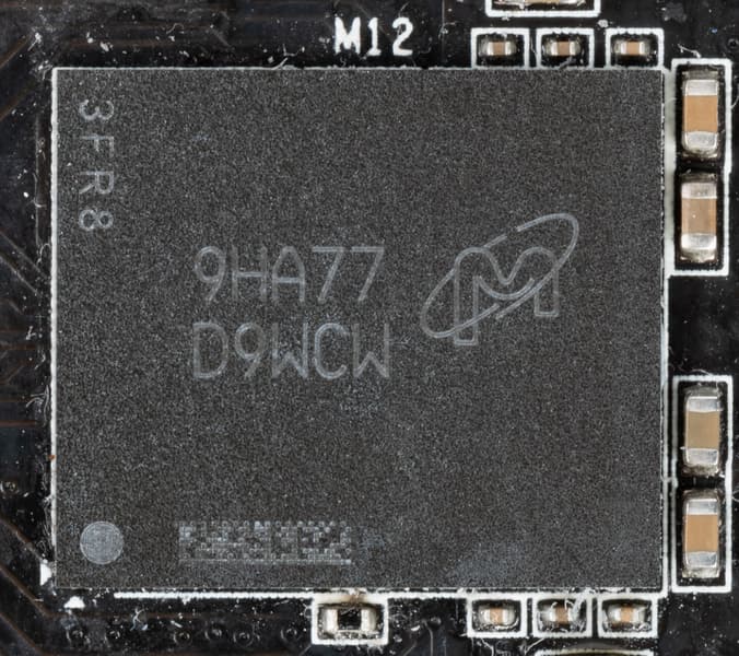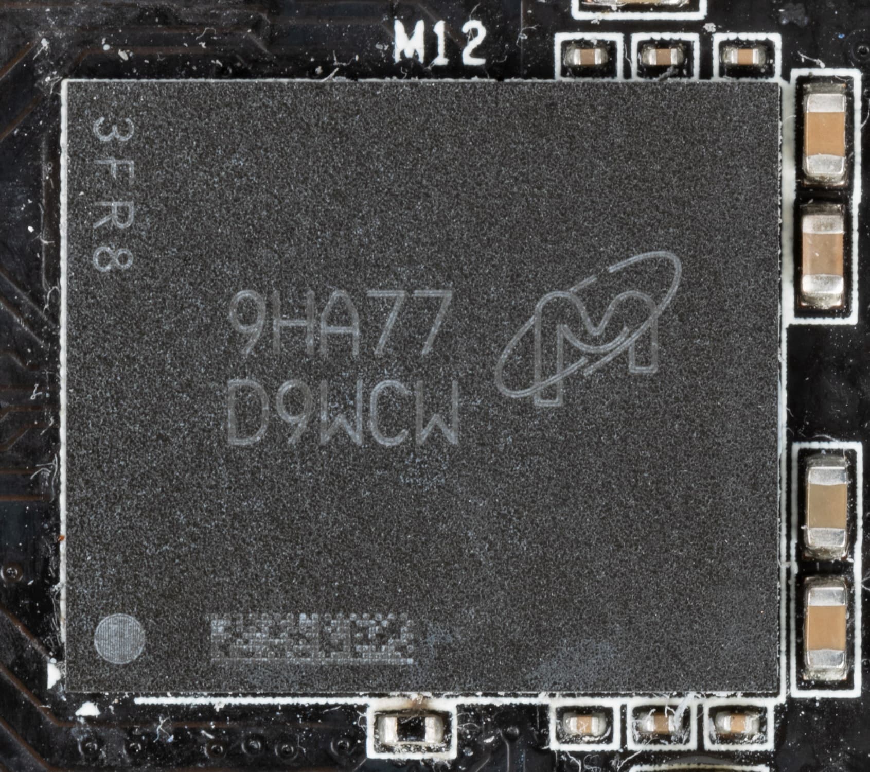 Карта имеет 8 ГБ памяти GDDR6 SDRAM, размещенной в 8 микросхемах по 8 Гбит на лицевой стороне PCB. Микросхемы памяти Micron (GDDR6, MT61K256M32JE-14) рассчитаны на номинальную частоту работы в 3500 (14000) МГц. Расшифровщик кодов на упаковках FBGA находится здесь.