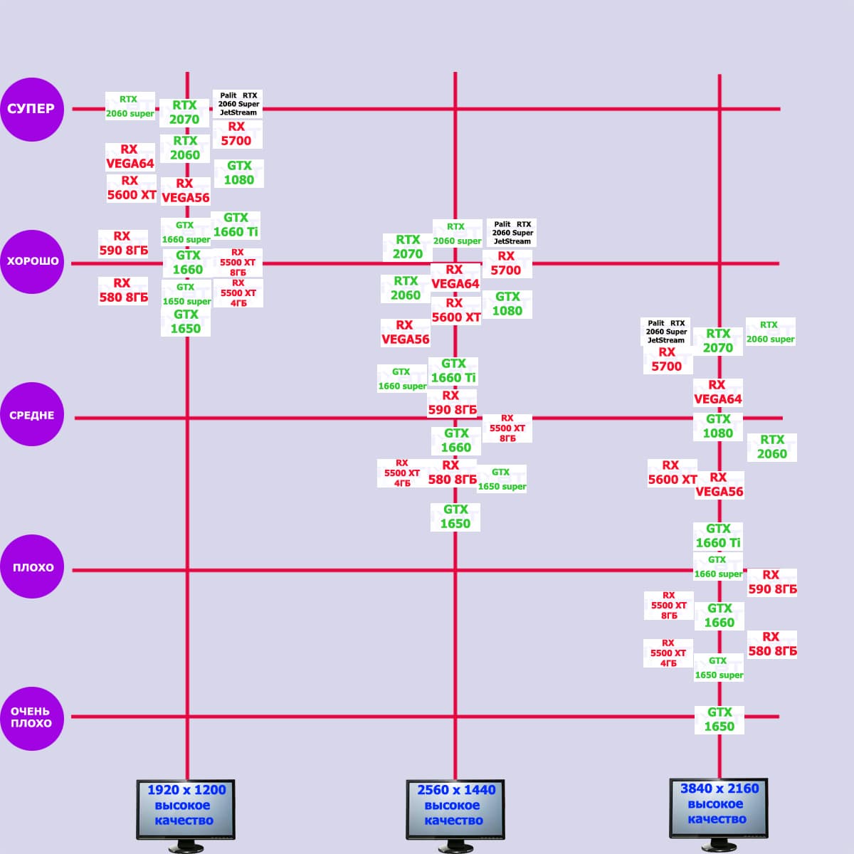 | 09 | RX 5700 XT 8 ГБ, 1605—1905/14000 | 348 | 1080 | 31 000 |