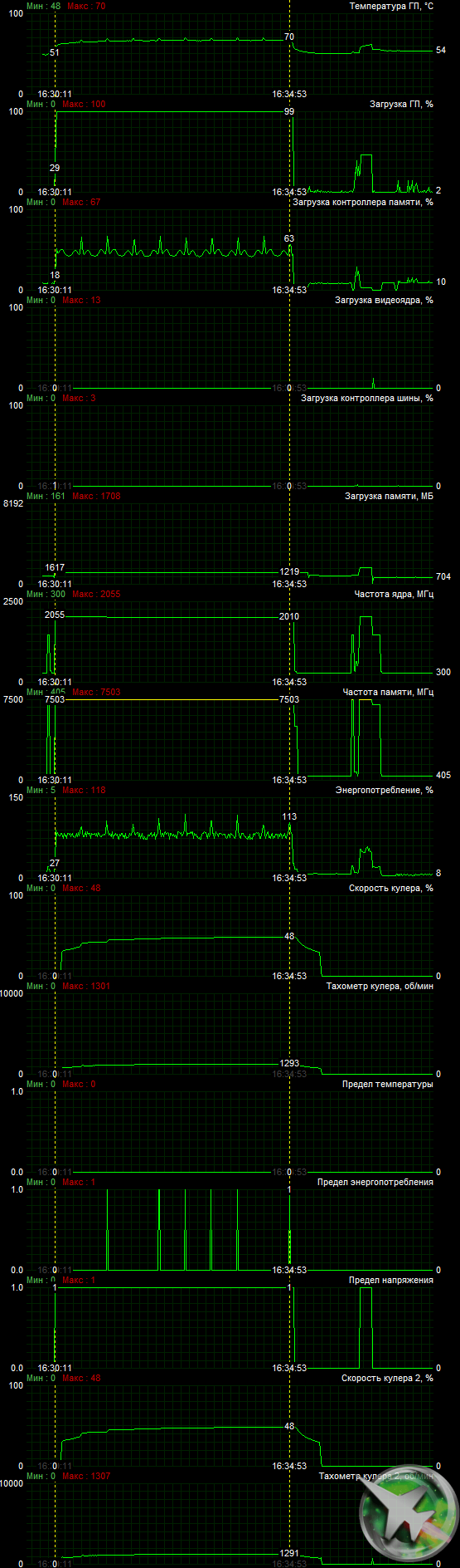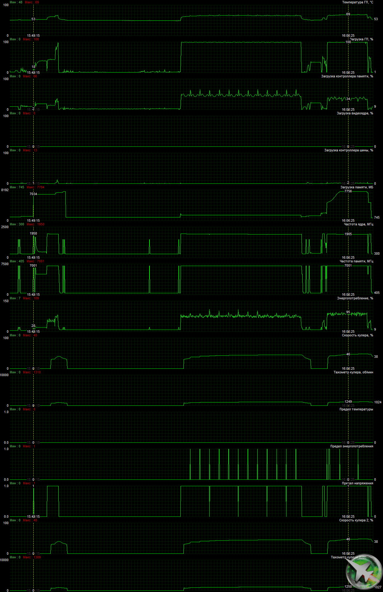 После 6-часового прогона под нагрузкой максимальная температура ядра не превысила 69 градусов, что является очень хорошим результатом для видеокарты такого уровня.