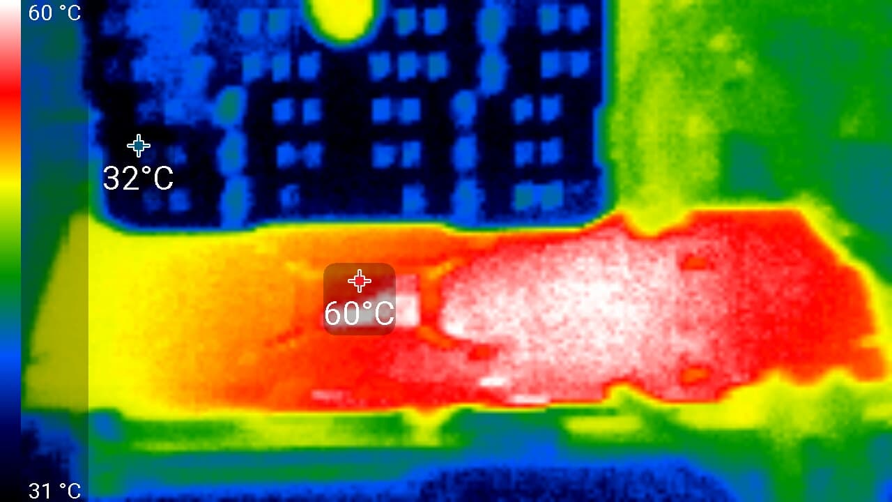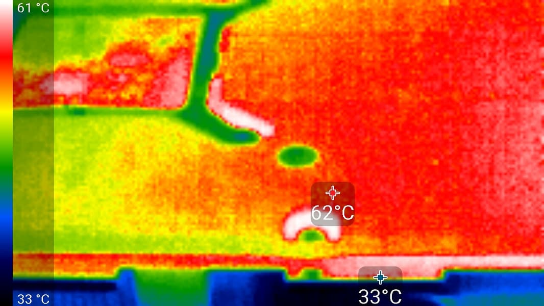 Максимальный нагрев — области около GPU и преобразователей питания.