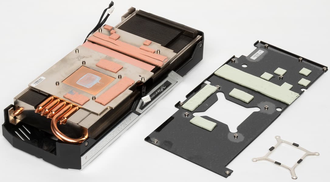 В отличие от весьма компактной модели RTX 2060 Super Gaming Pro, эта карта обладает весьма приличными размерами, и они определяются именно габаритами СО. Мы видим массивный пластинчатый радиатор, его пересекают пять тепловых трубок для улучшения рассеивания тепла по ребрам. Трубки припаяны к медному основанию, которое и прижимается к GPU. Для охлаждения микросхем памяти и силовых элементов предусмотрена та же самая большая платформа-подошва. На обороте карты установлена толстая пластина, служащая не только элементом жесткости, но и дополнительным охладителем PCB через термопрокладки. В итоге система охлаждения видеокарты занимает 3 слота по толщине.