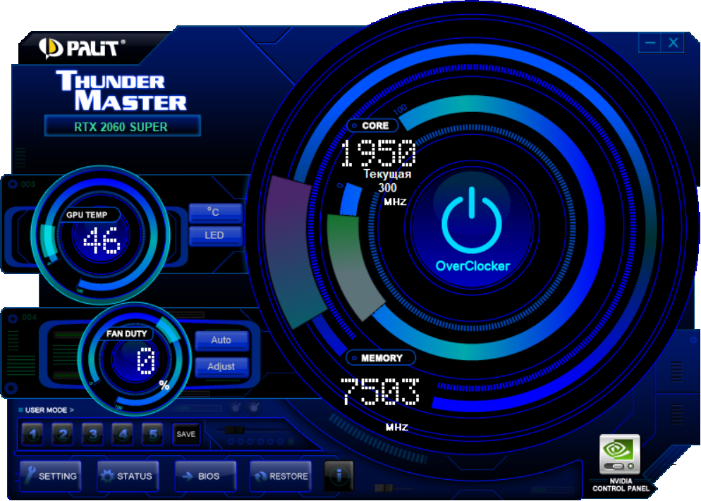 Я попытался разогнать эту карту с помощью Thunder Master. В итоге карта стабильно работала при частоте GPU Boost 1950 МГц и частоте памяти 15 ГГц. Вероятно, она смогла бы работать и на более высоких частотах, если бы не лимиты по потреблению, установленные в драйверах Nvidia.