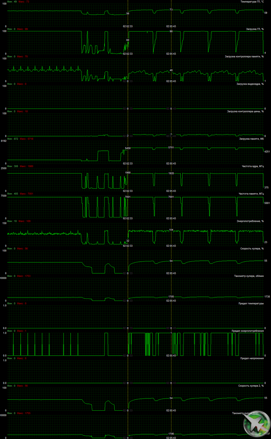 После 6-часового прогона под нагрузкой максимальная температура ядра не превысила 73 градусов, что является очень хорошим результатом для видеокарты такого уровня.