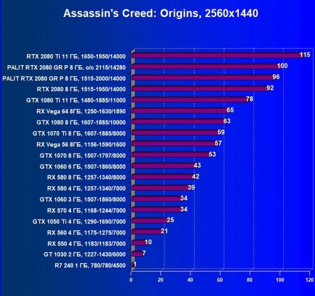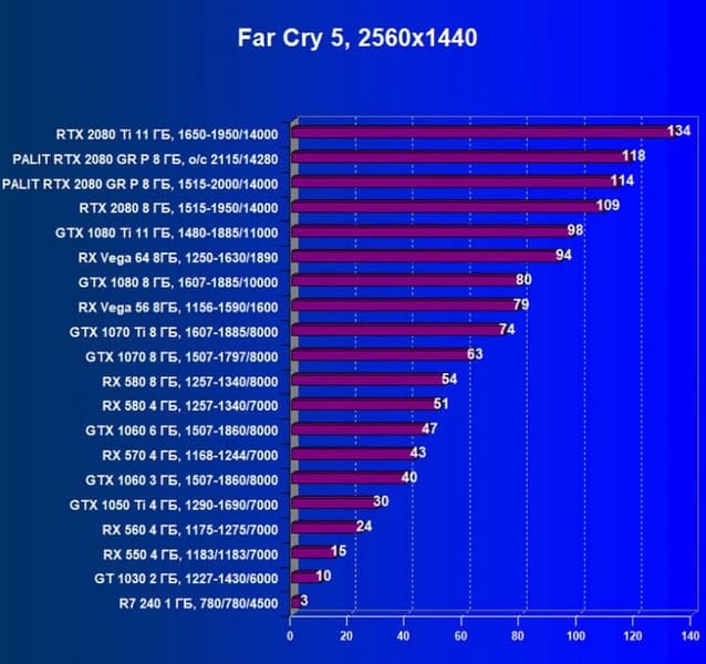 Эта карта (как и все ускорители на базе RTX 2080) прекрасно подойдет, если вы хотите играть при максимальном качестве графики в любые игры в разрешении до 2560×1440 включительно, да и в разрешении 4К при тех же настройках графики ускоритель выдаст хорошую производительность в большинстве игр. Следом идет GTX 1080 Ti, а RX Vega 64 в этой тройке на третьем месте.