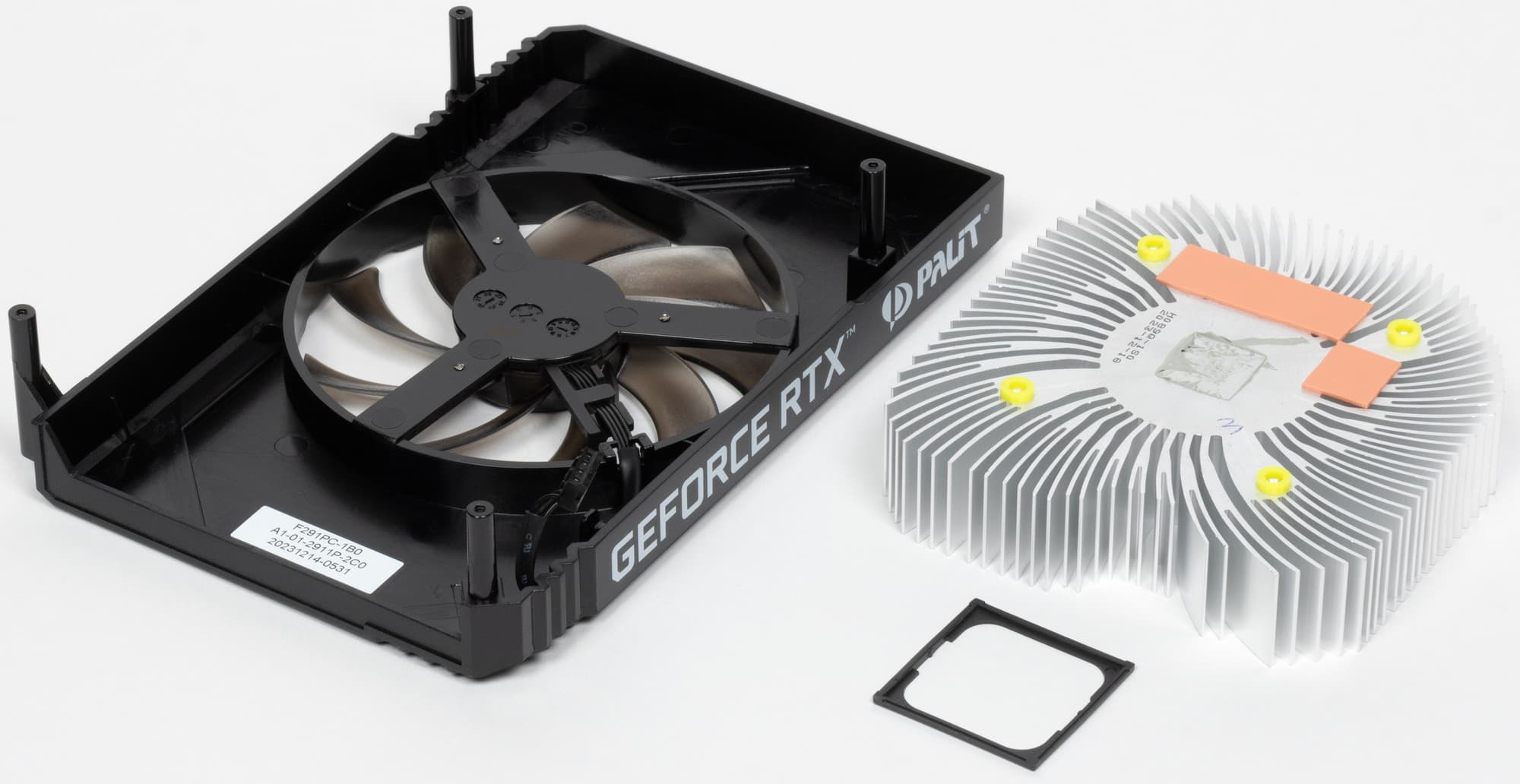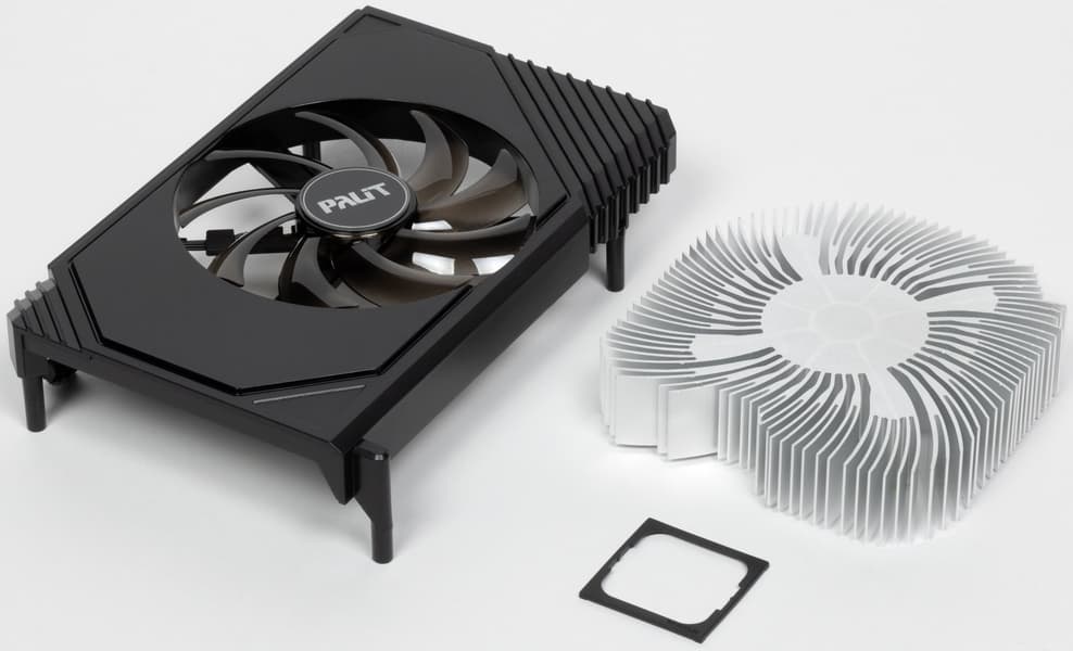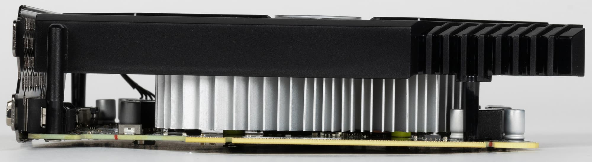 Карта не имеет задней пластины. Поверх радиатора установлен кожух с вентилятором ∅100 мм.